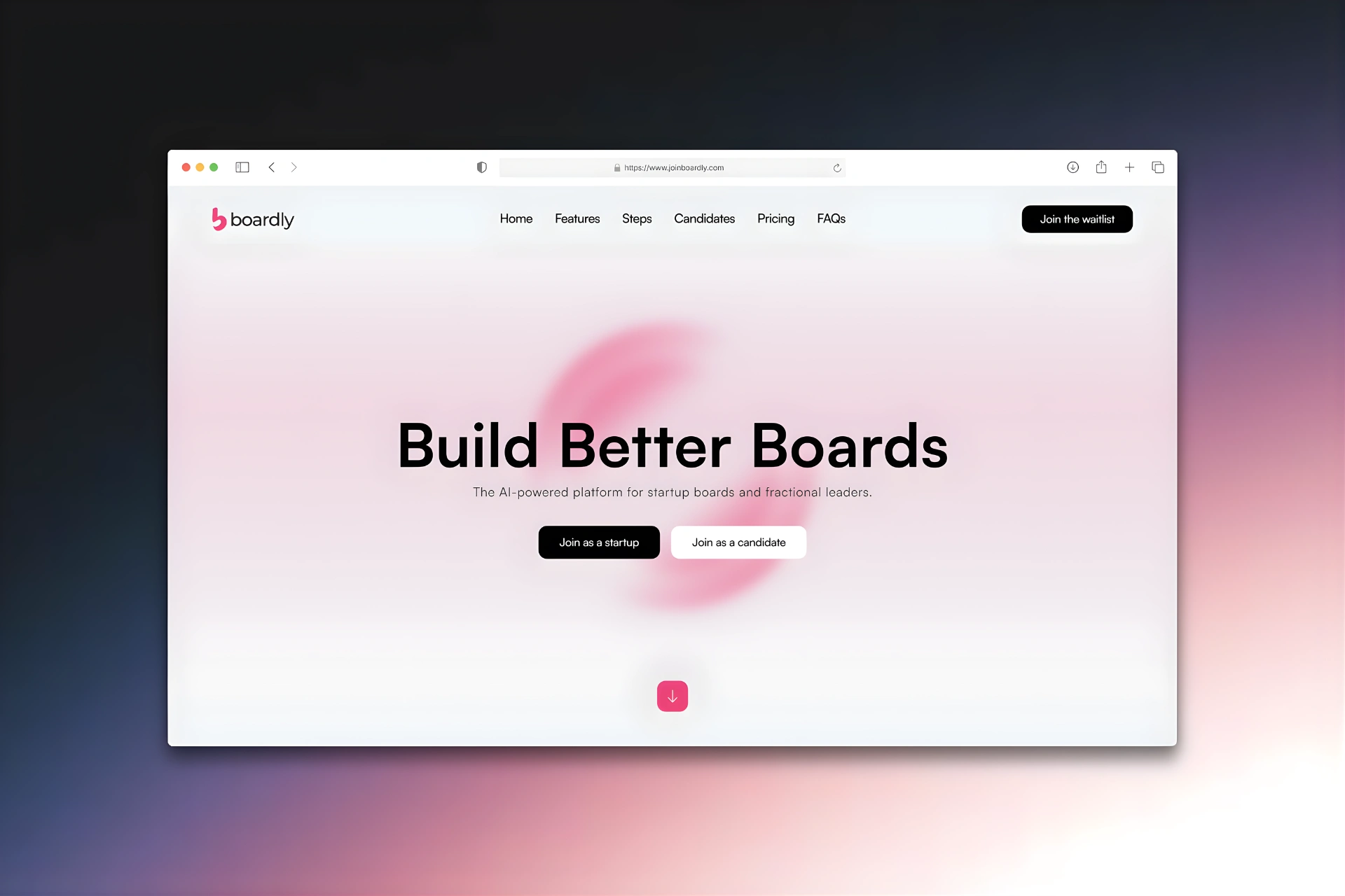 AI-driven platform helping startups connect with board leaders through a clean, minimal, and trustworthy web experience.