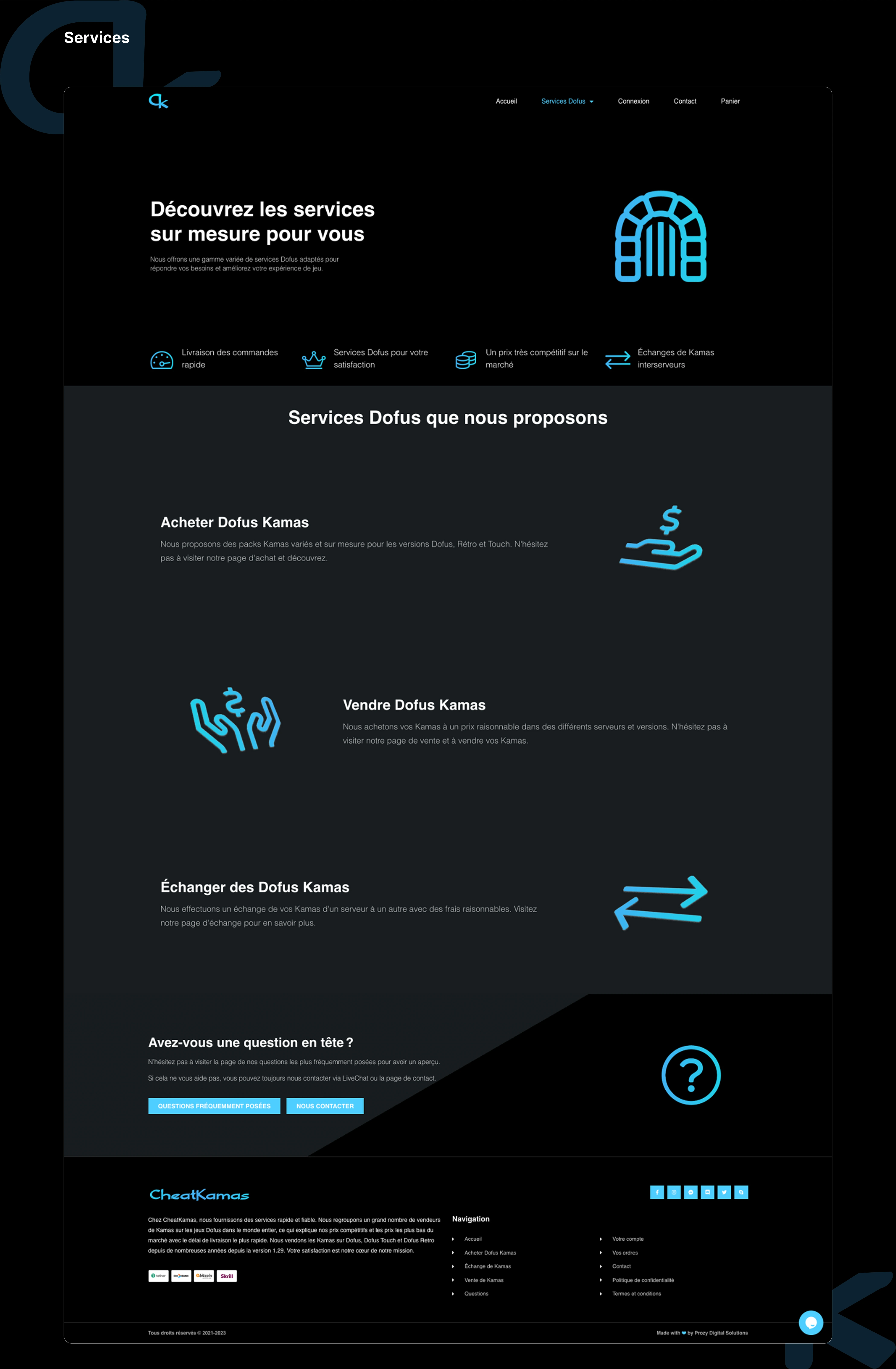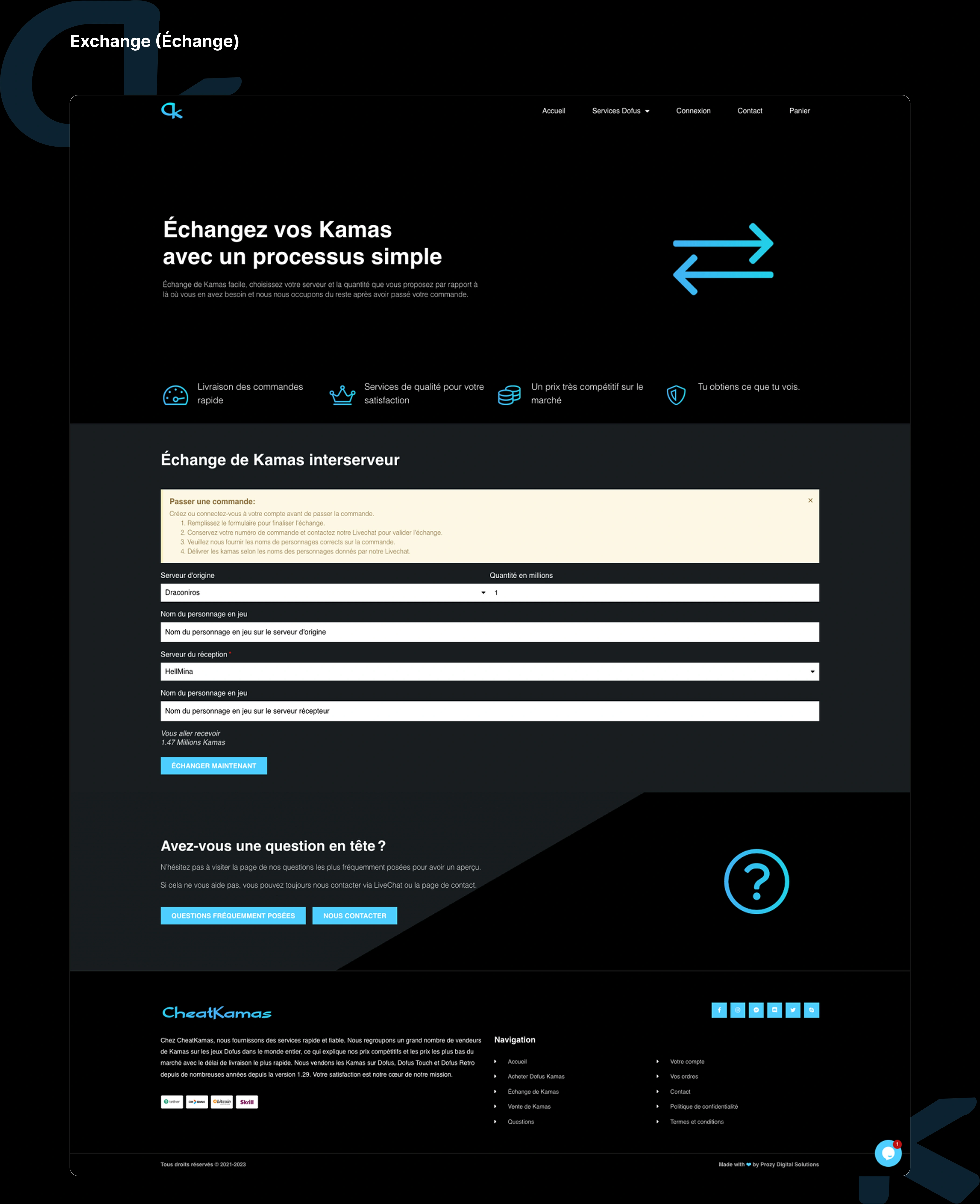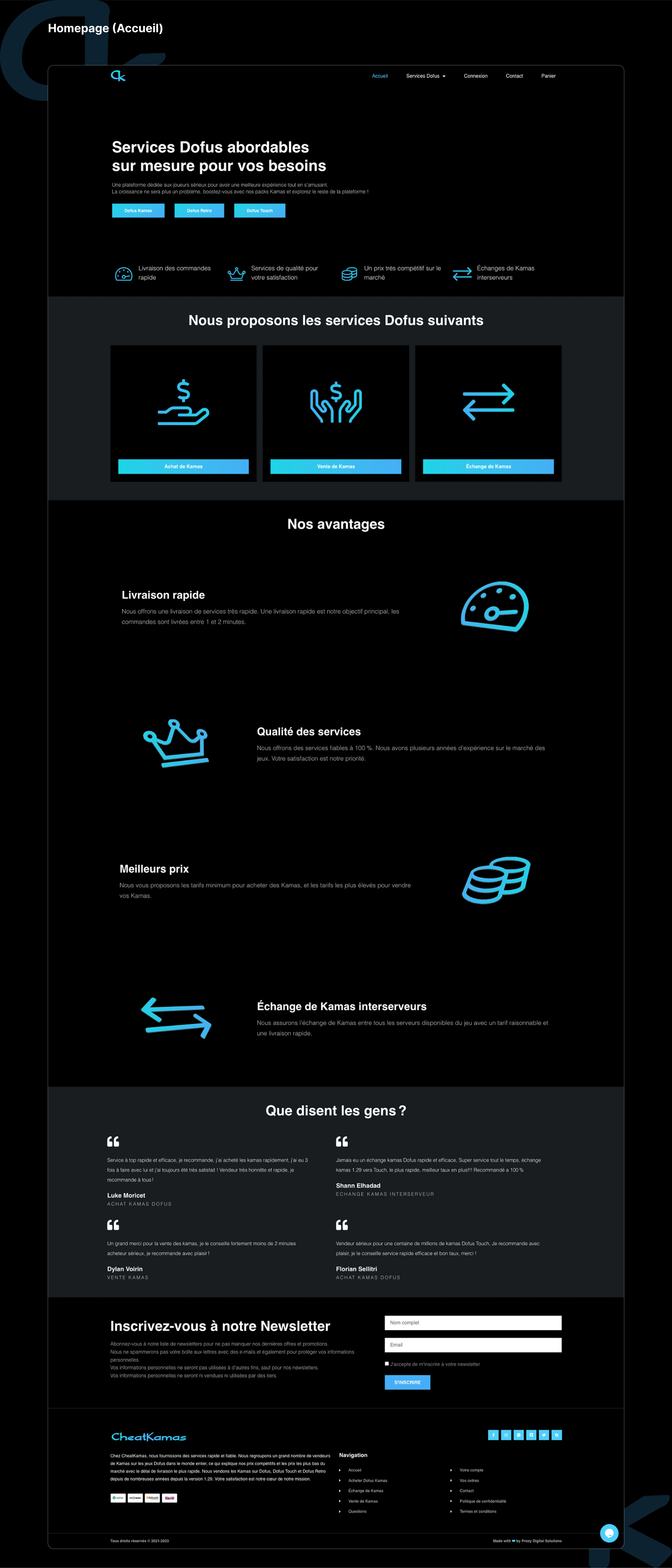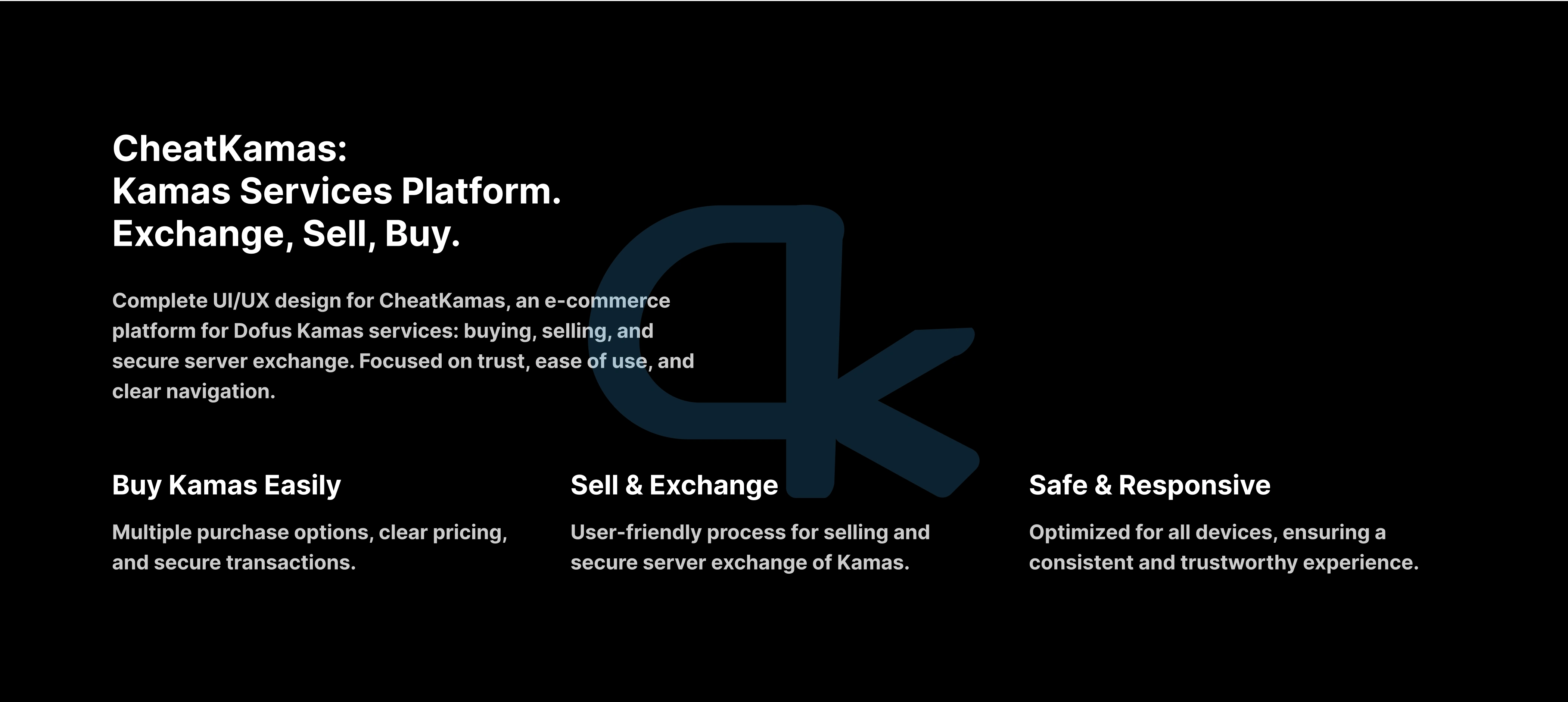 Complete UI/UX design for CheatKamas, an e-commerce platform for Dofus Kamas services: buying, selling, and secure server exchange.