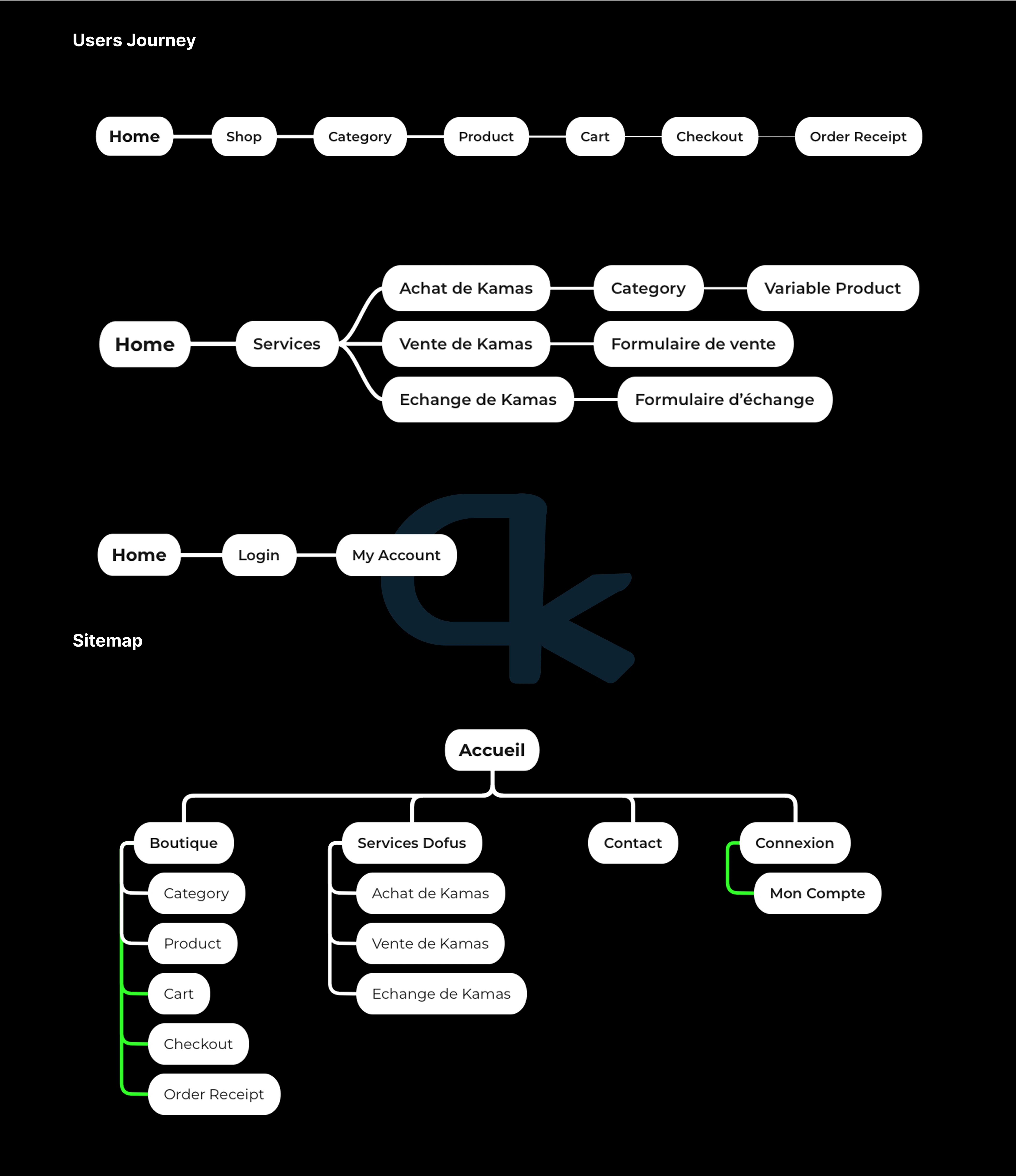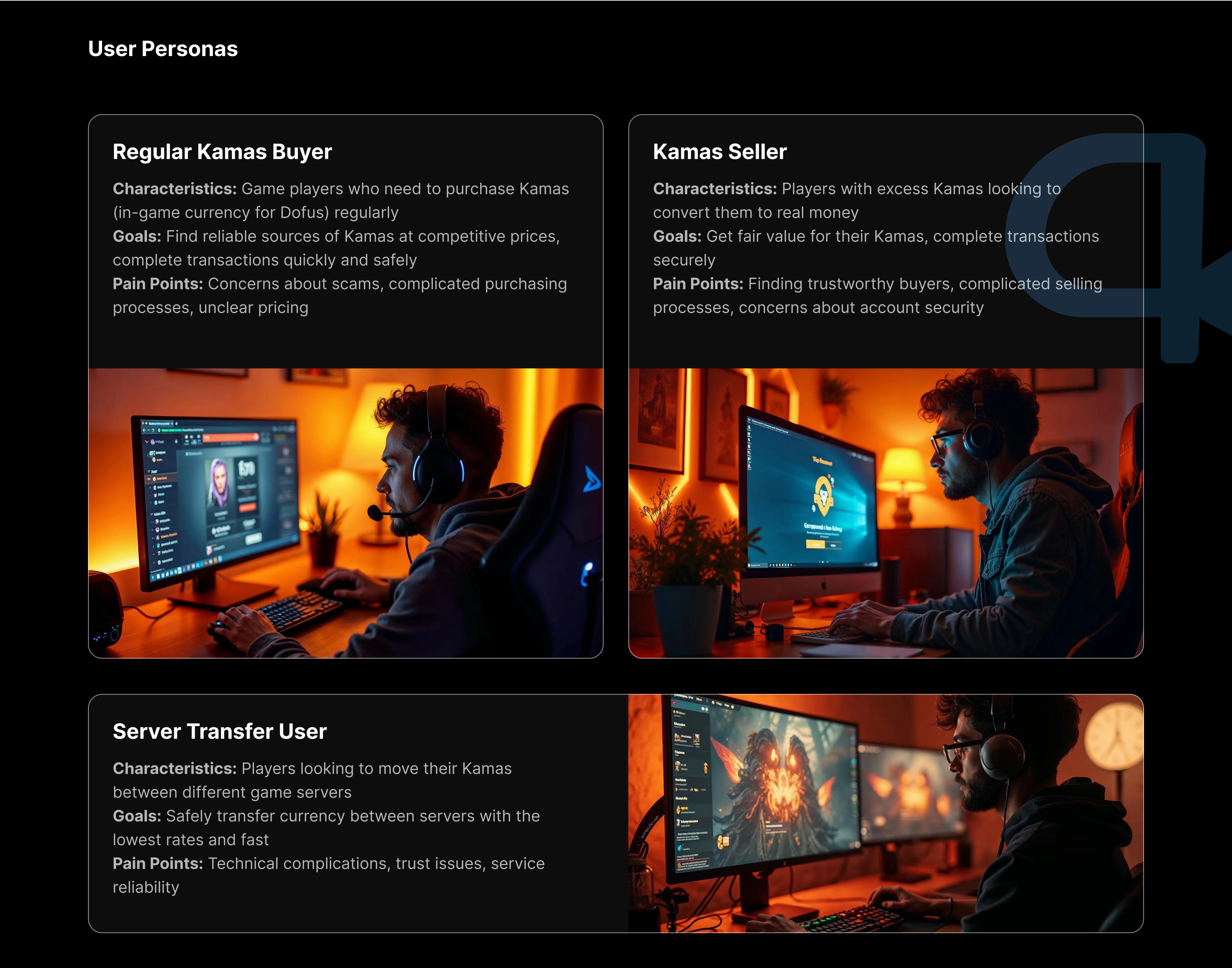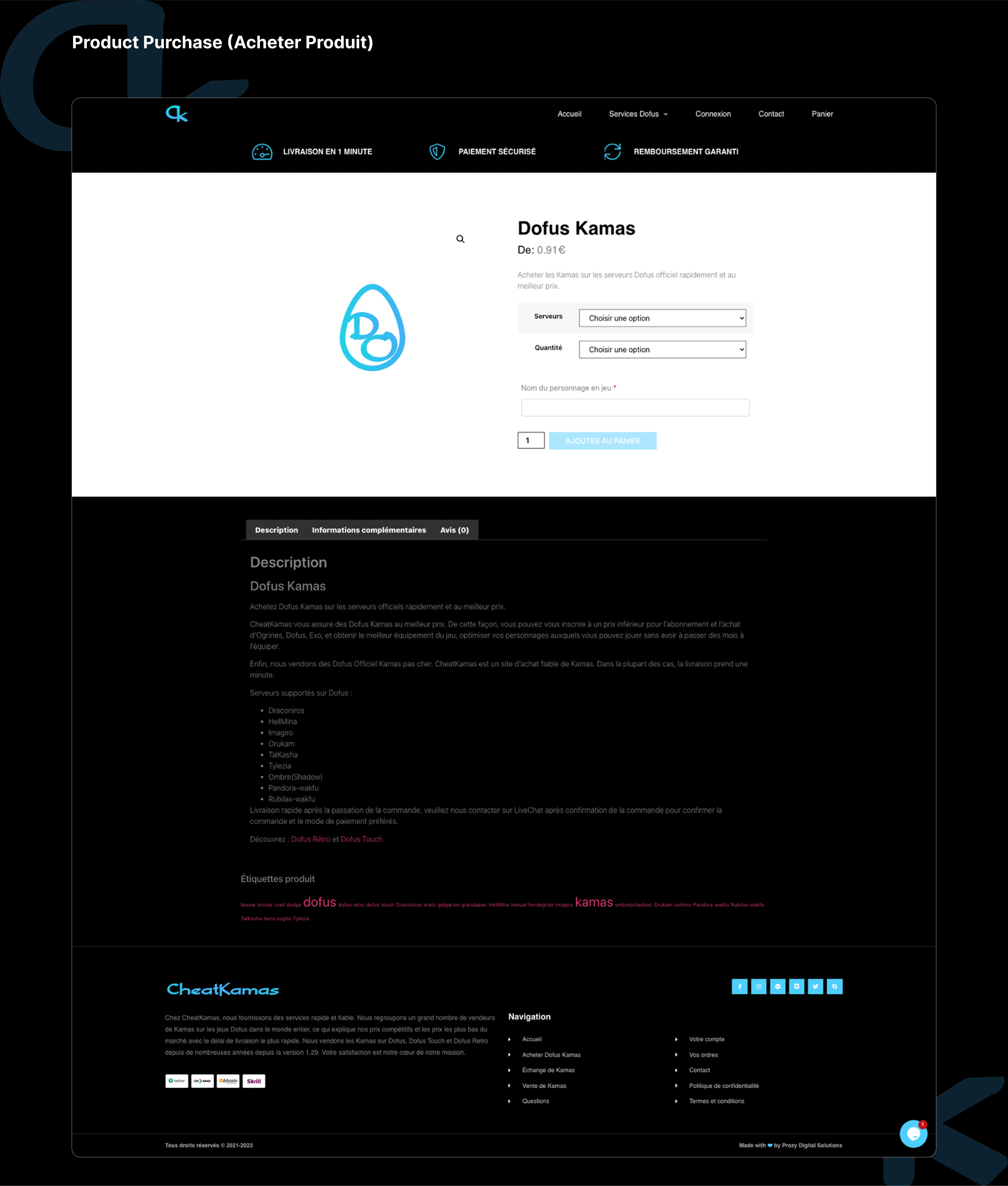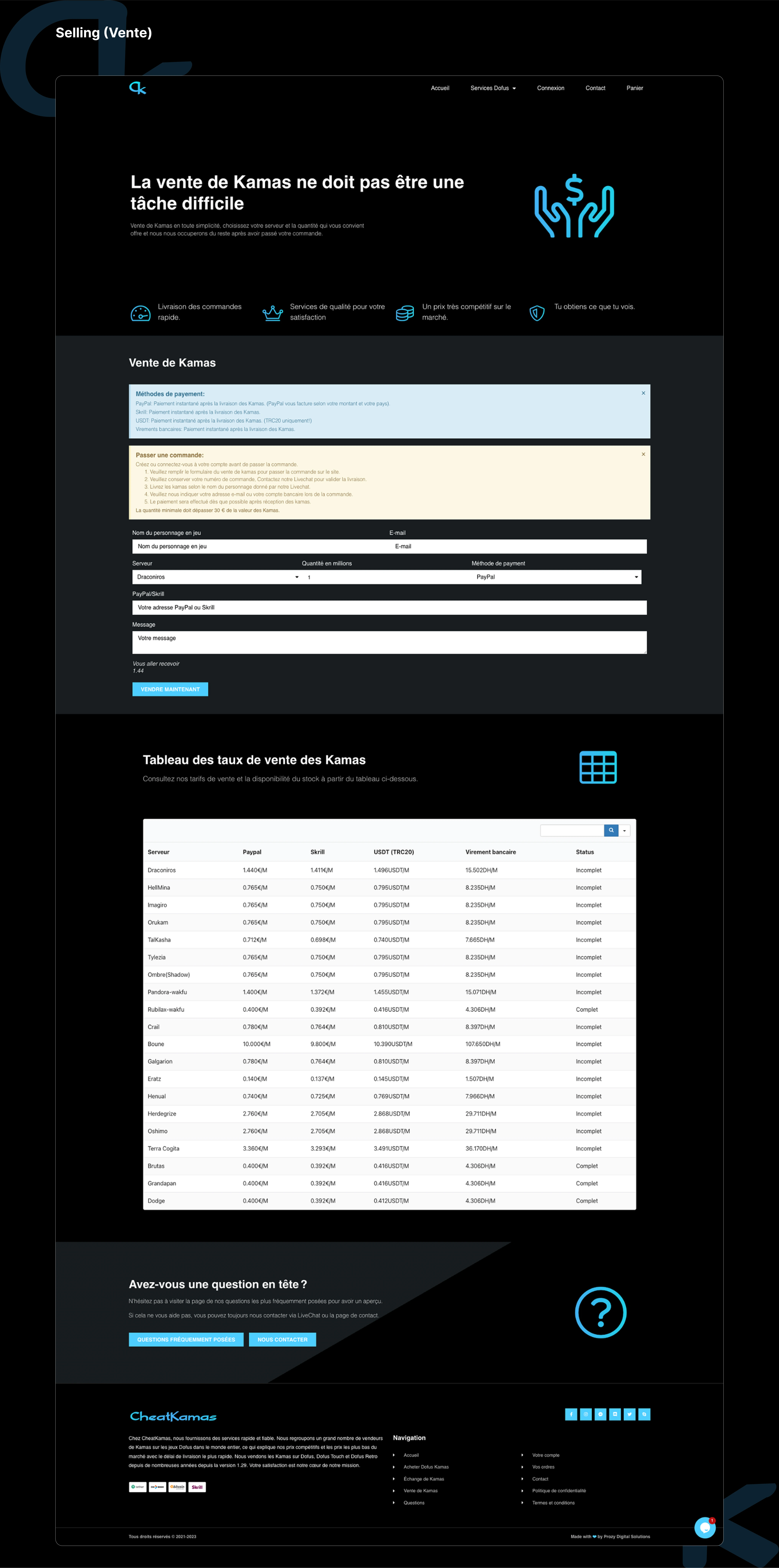Complete UI/UX design for CheatKamas, an e-commerce platform for Dofus Kamas services: buying, selling, and secure server exchange.