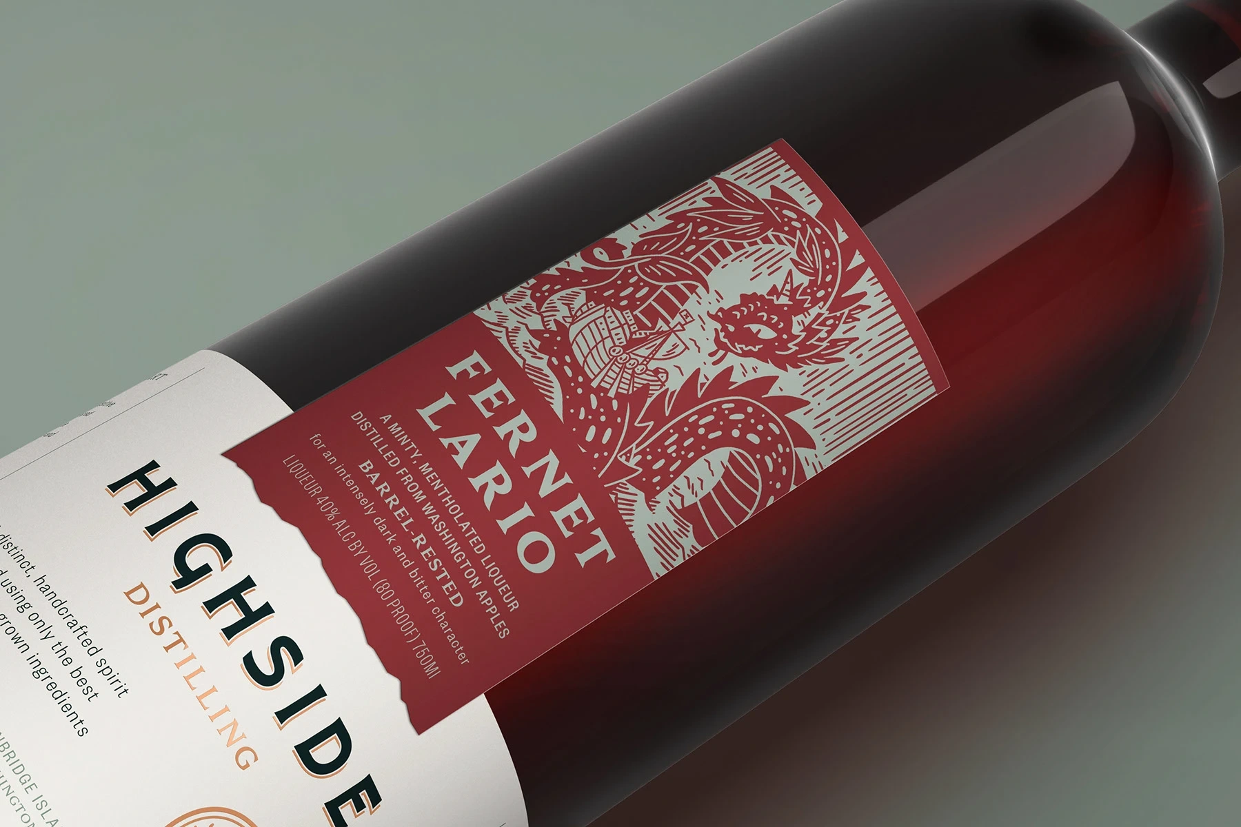 Highside is a family-run business and their logo honors them in a stylized crest embedded with a mythical sea monster representing the Puget Sound by way of Scotland. This leads a packaging system that can adapt across a range of craft spirits and liqueurs.