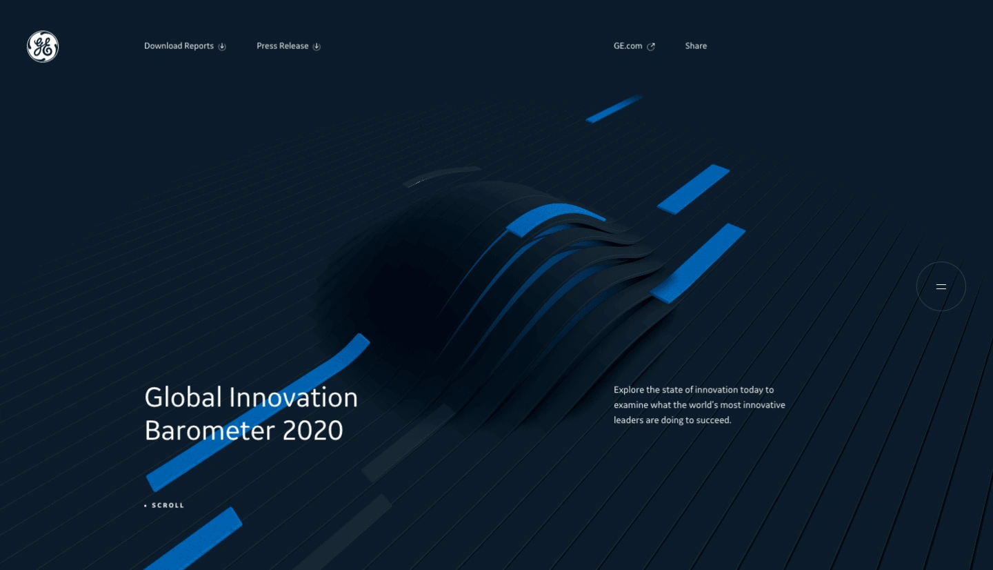 The GIB20 website transforms GE's 50-page innovation report into an immersive experience using WebGL, 3D visuals, and videos to represent the ever-changing.