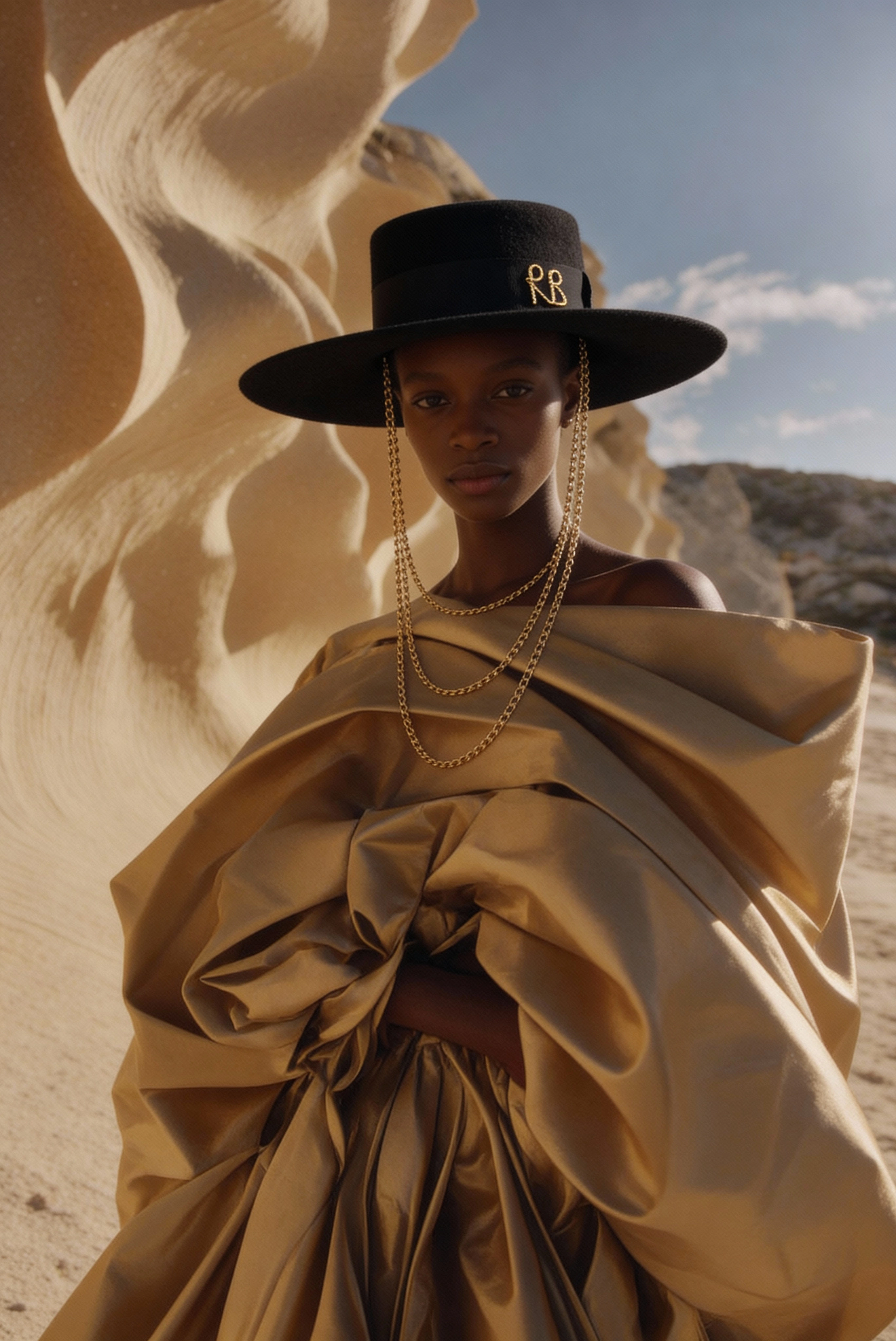 The scene places the iconic hat silhouette within a natural desert landscape, where soft stone textures and warm sand tones echo the architectural lines of the garment. The composition emphasizes volume, materiality, and calm confidence — key elements of the brand’s visual language.