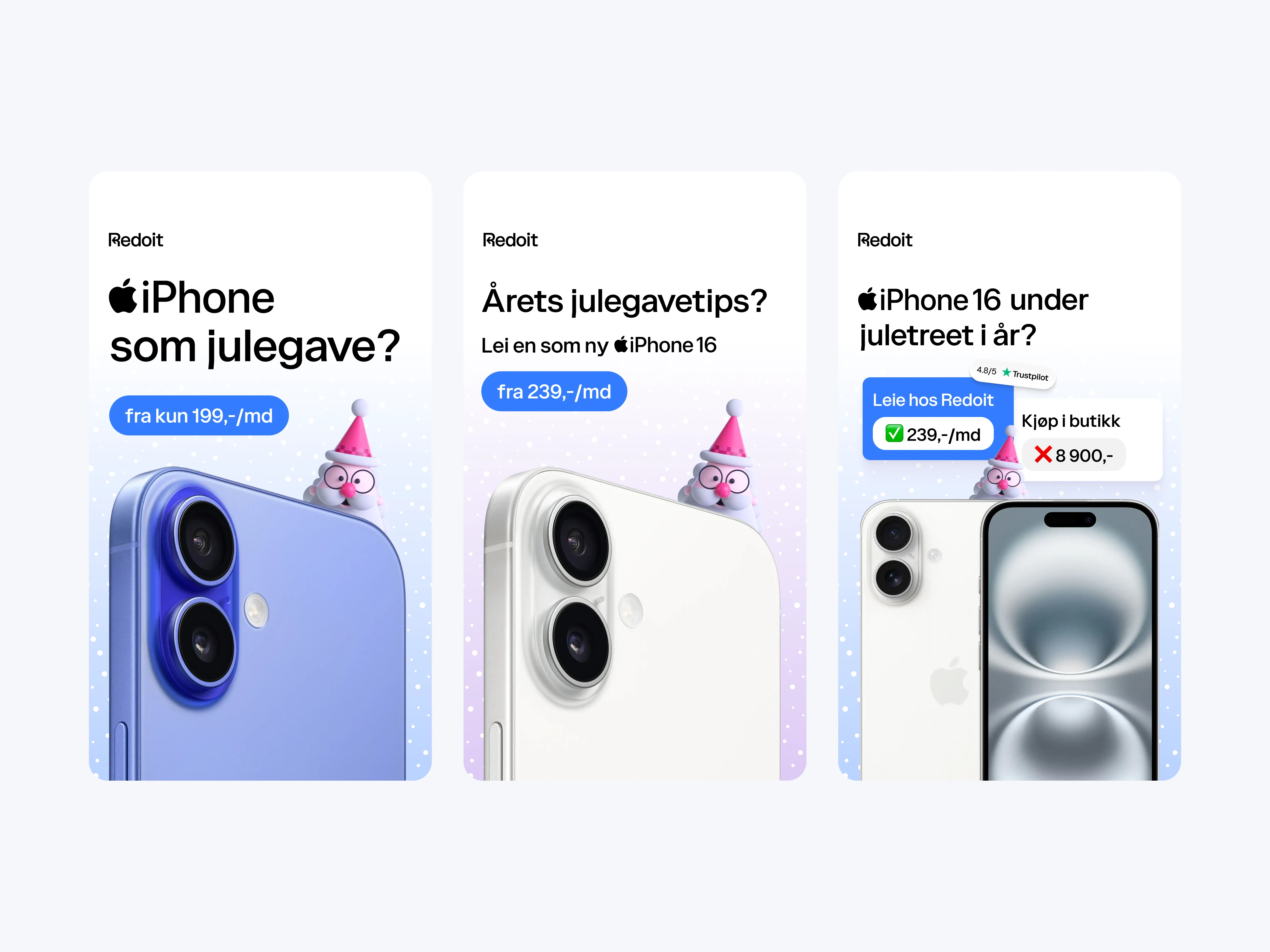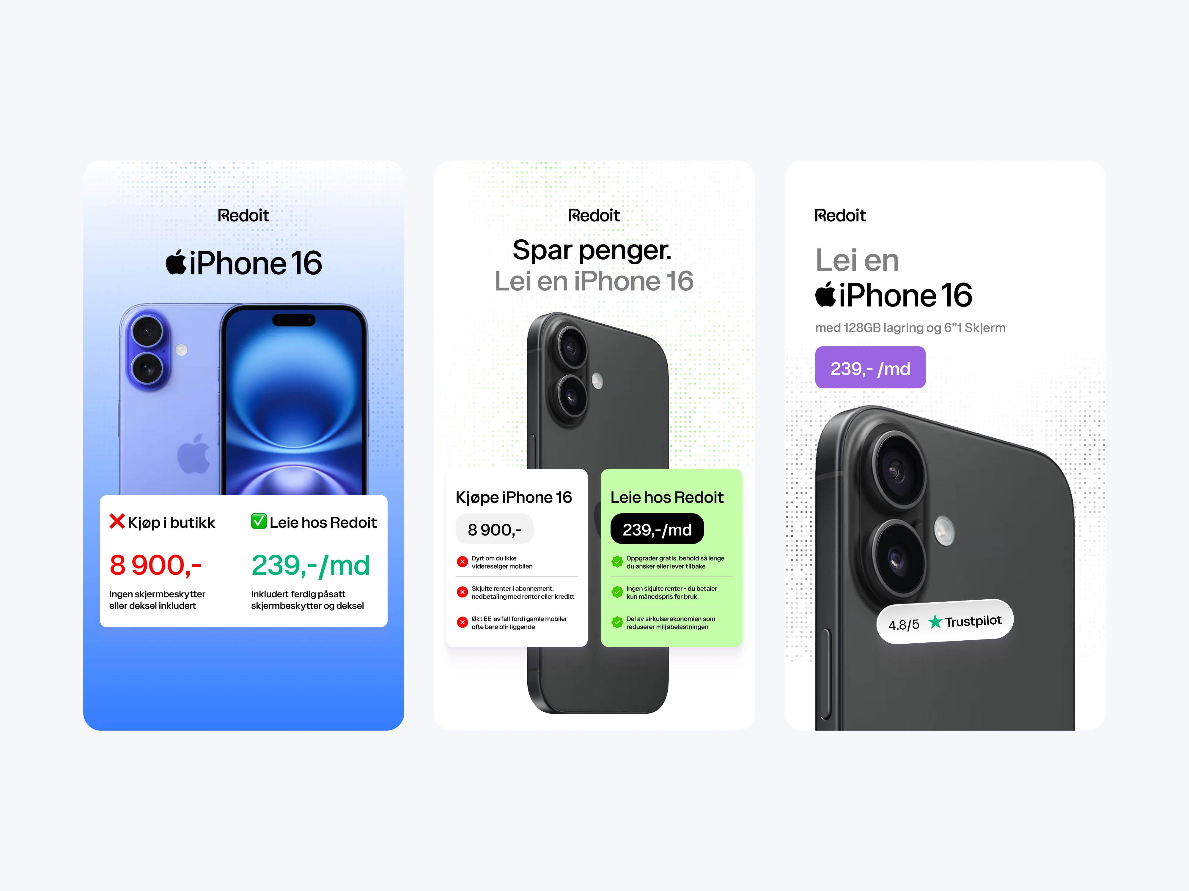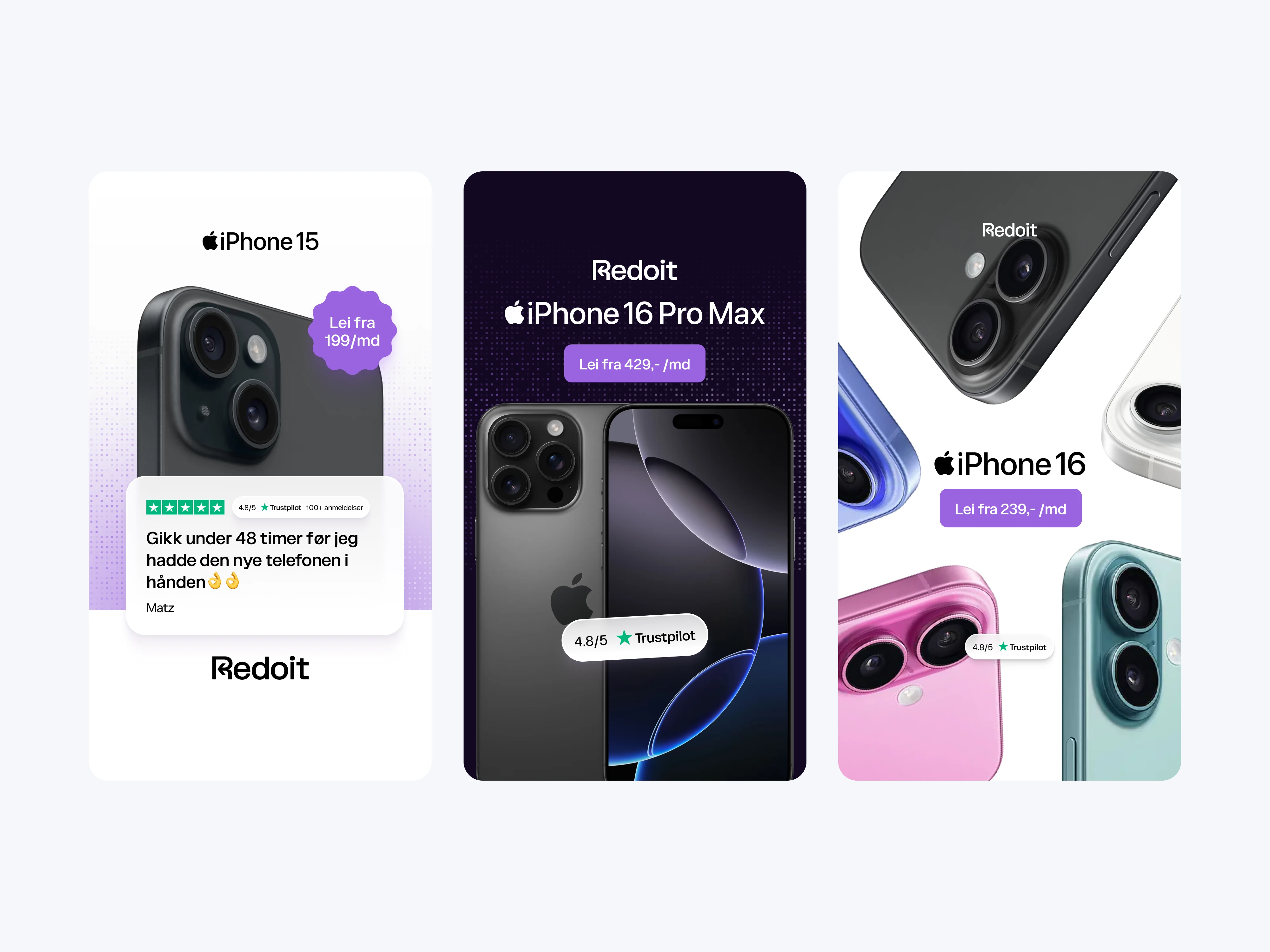 Scroll-stopping ad creatives for Redoit, helping Norwegians lease iPhones the smart way. Bold visuals, punchy copy, built to perform across paid Meta channels.