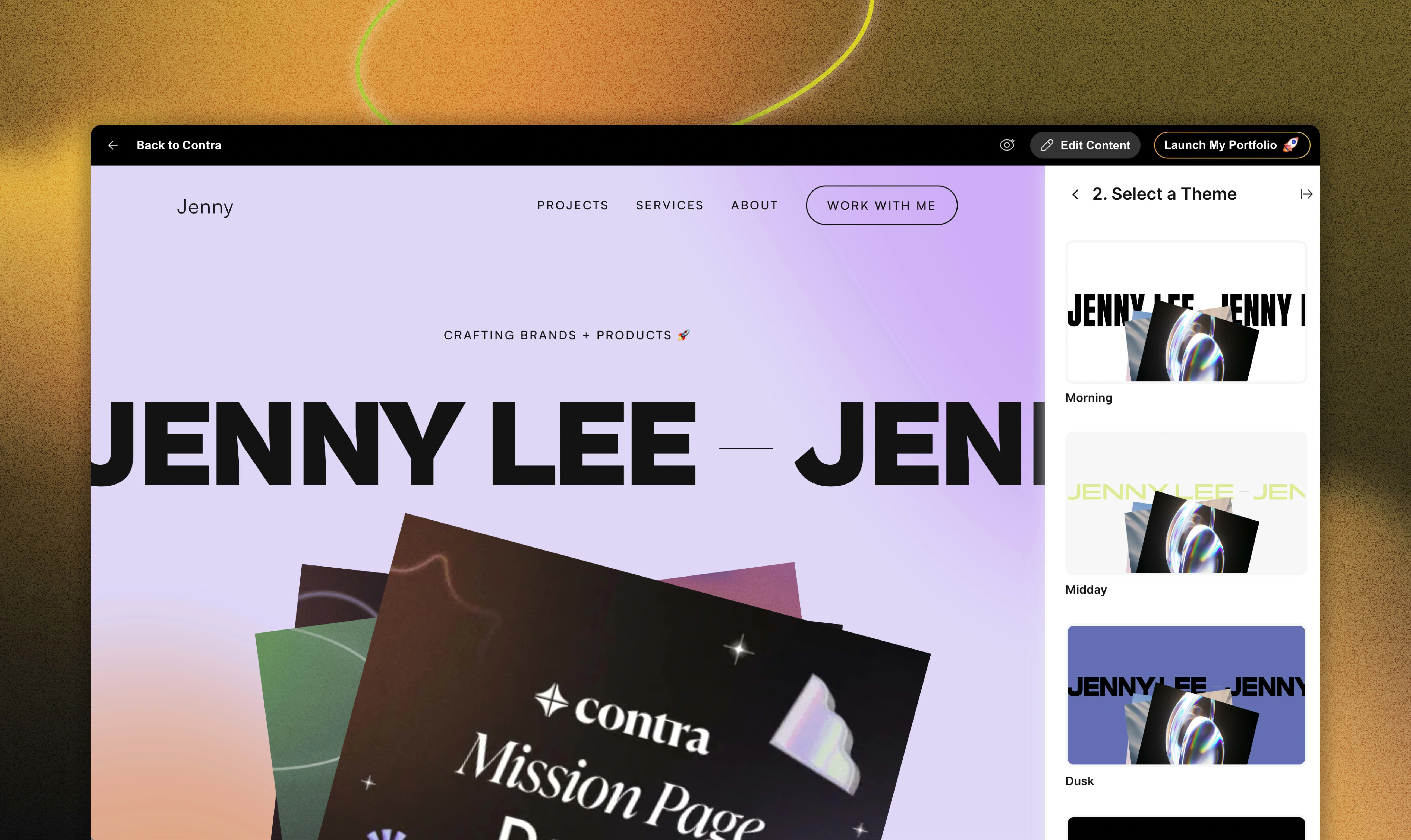 Your Independent Portfolio is powered by your Contra profile. With the press of a button, you can switch your Contra profile into a stunning portfolio.