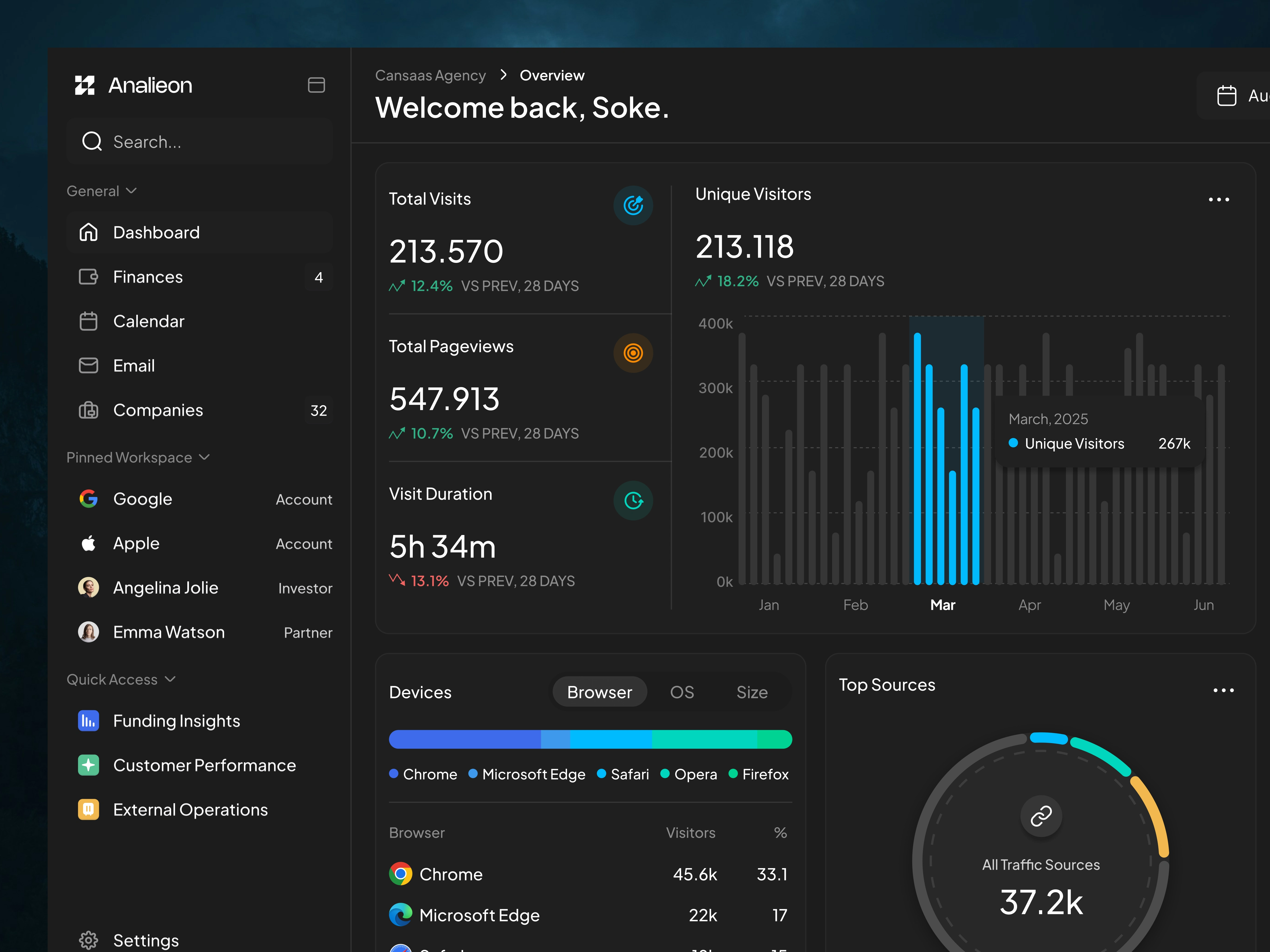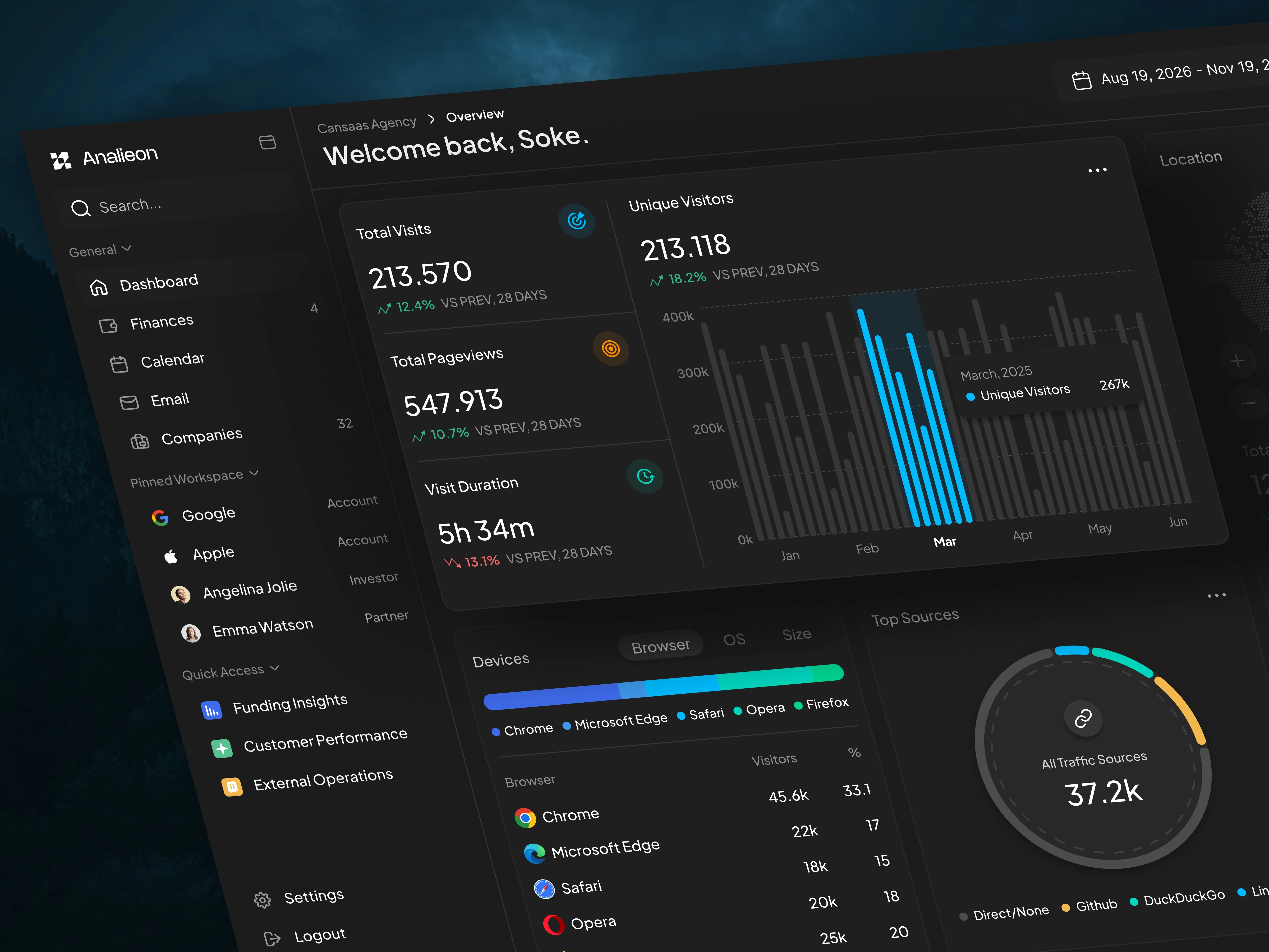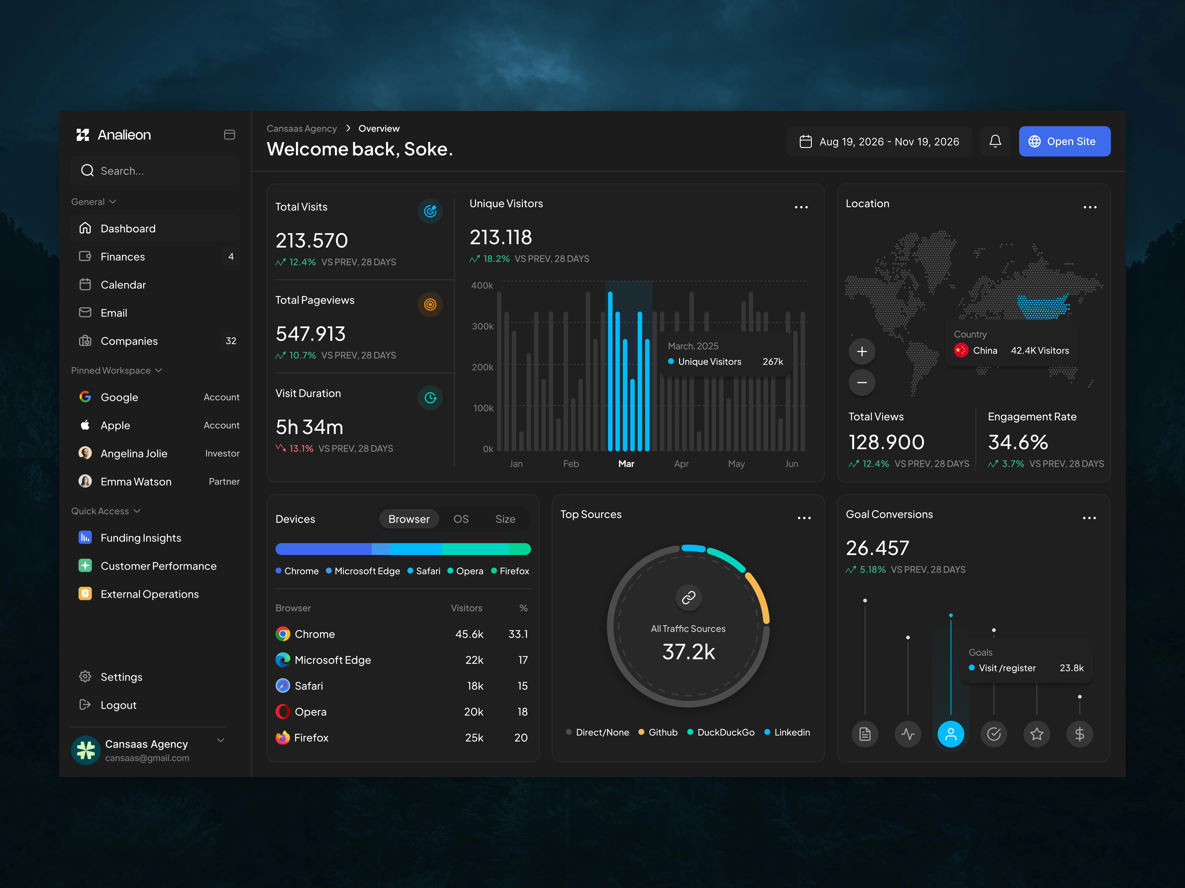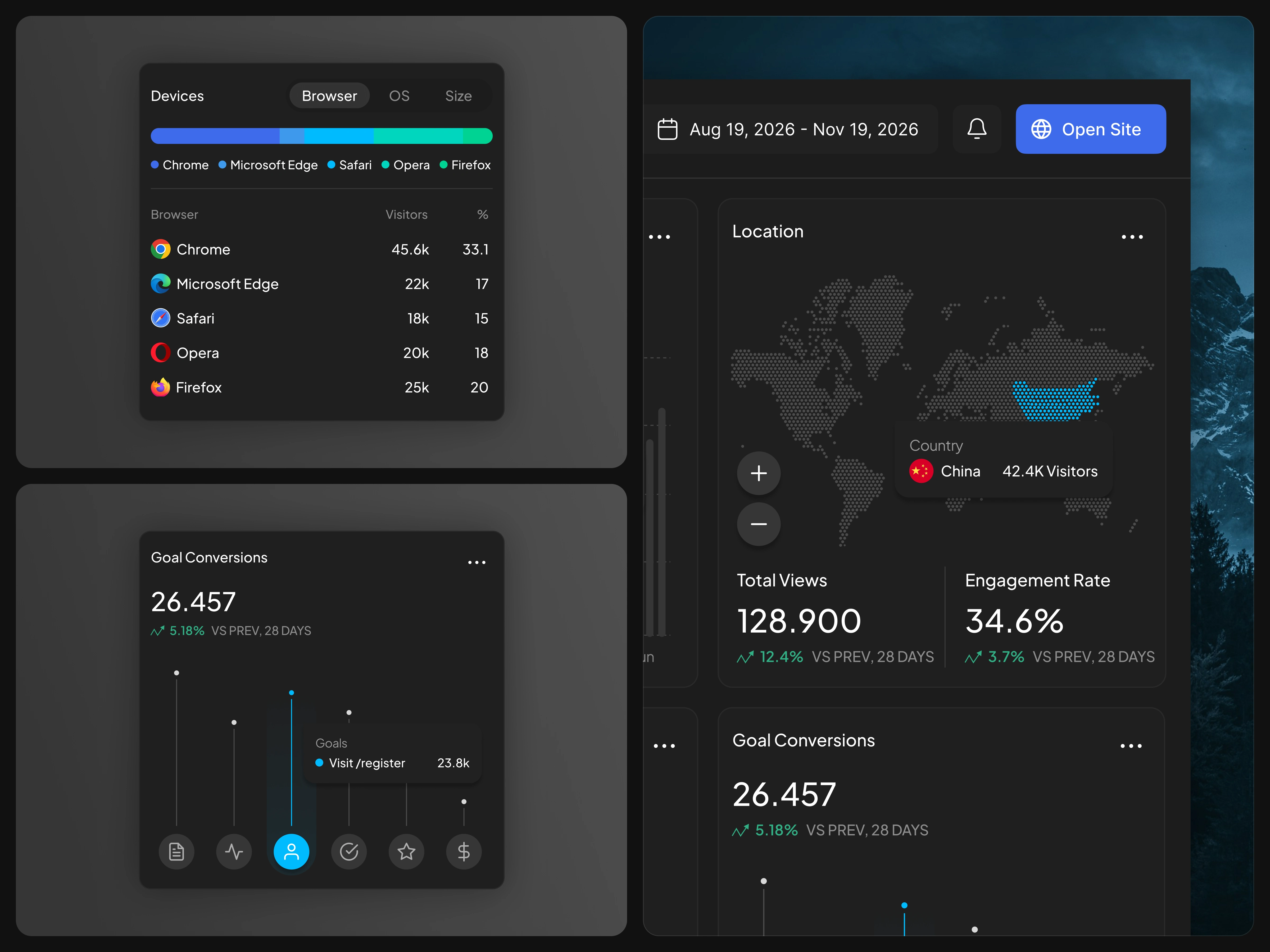 This project explores the design of a modern analytics dashboard for SaaS platforms, built to help teams monitor performance metrics, analyze user behavior, and understand traffic insights in one unified interface. The dashboard focuses on clear data hierarchy, intuitive navigation, and modern data visualization, enabling users to quickly interpret analytics without feeling overwhelmed by complex datasets.