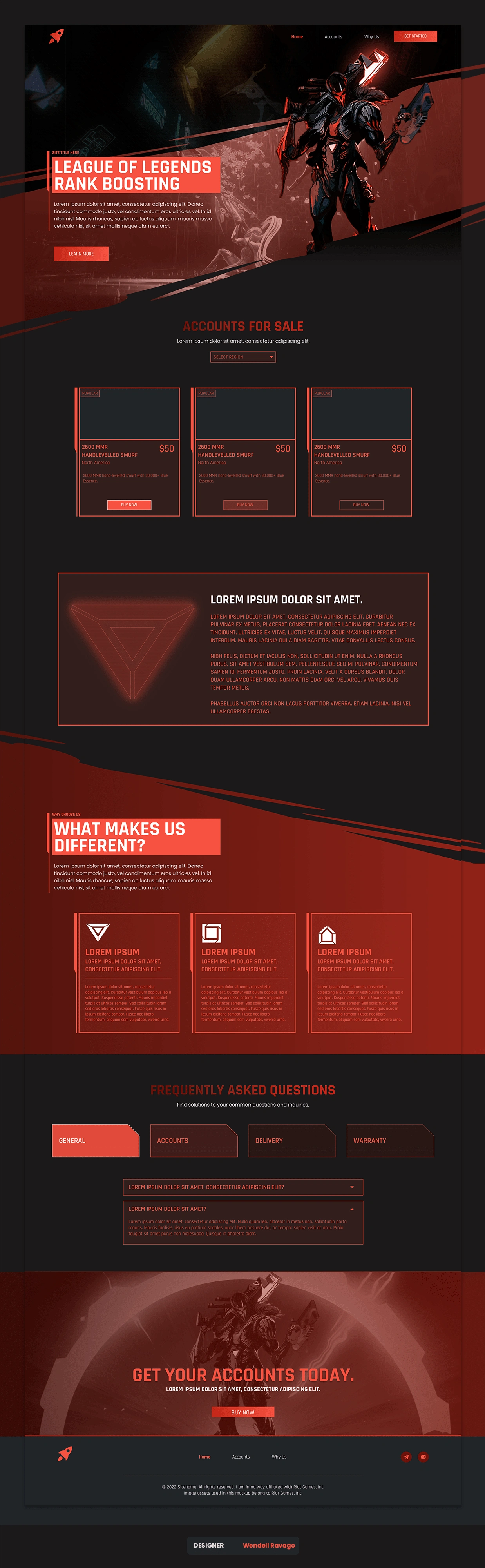This project is a website that sells League of Legends accounts. The colors and chosen character is different from the actual output submitted by the client, but the layout and overall theme is the same. I've taken a few inspirations from Cyberpunk 2077, a game with futuristic cybernetic themes.