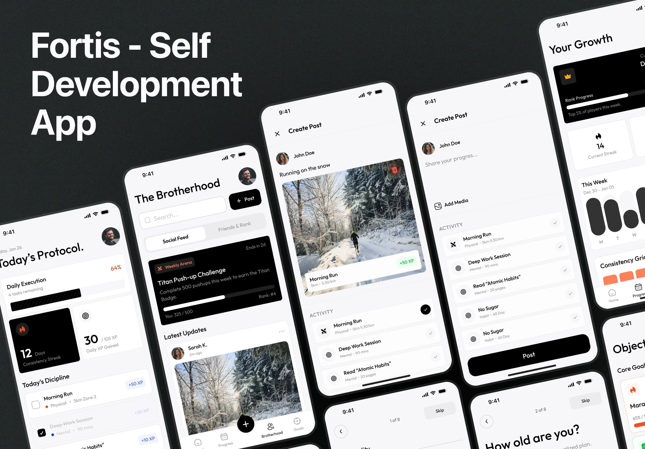 A complete mobile app design for Fortis, built to help users stay disciplined, track progress, and execute daily goals through structure and accountability.