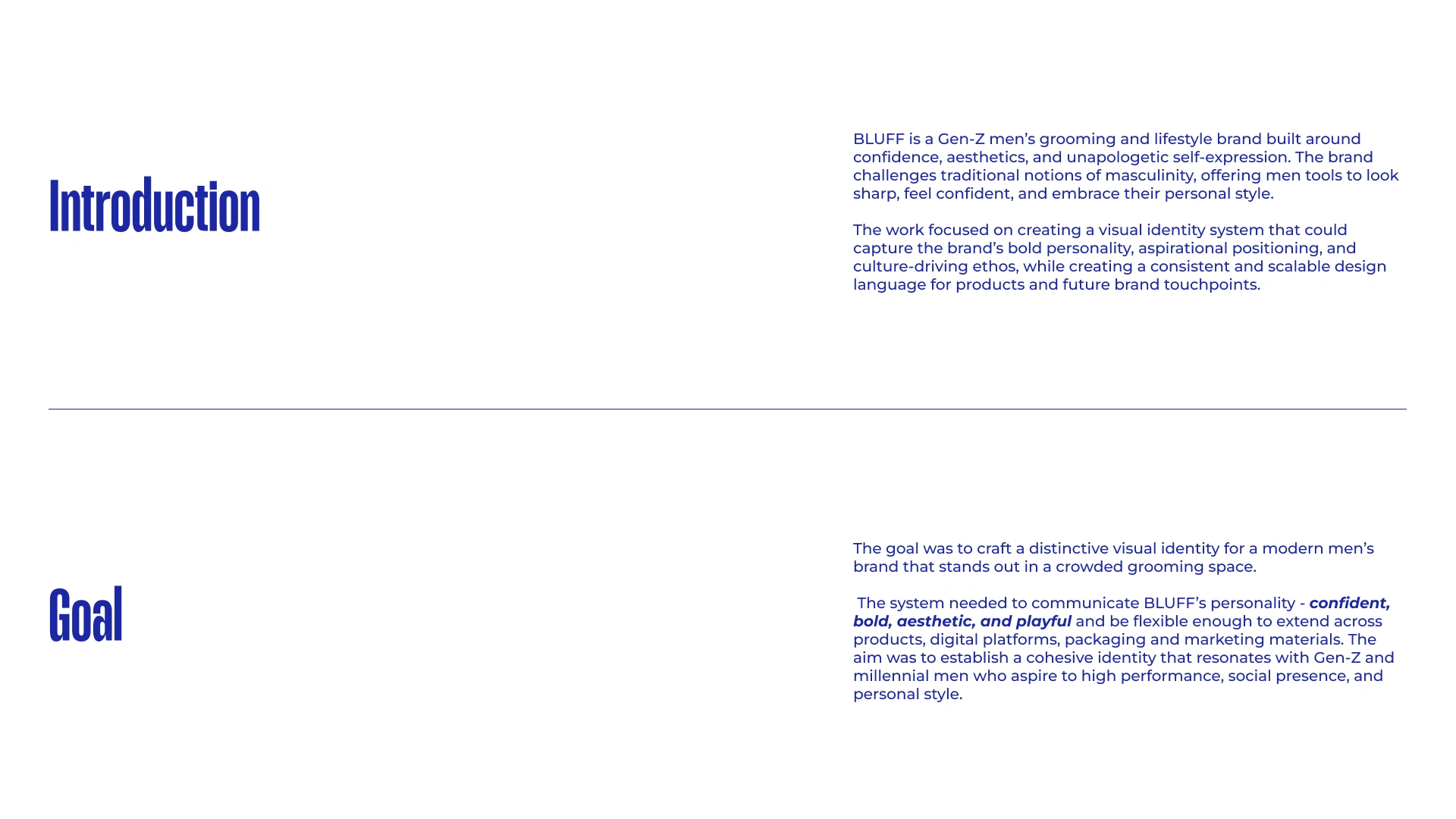 BLUFF© was designed to signal bold confidence, playfulness, and aspirational masculinity to Gen-Z men, making the brand feel modern and unapologetic.