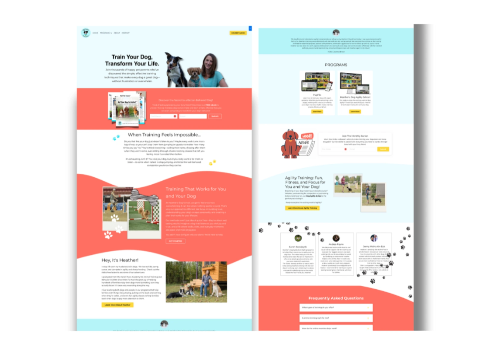 Created a Kajabi site for Heather's Dog School with a playful, pro design, featuring programs, booking options, and an engaged agility community.