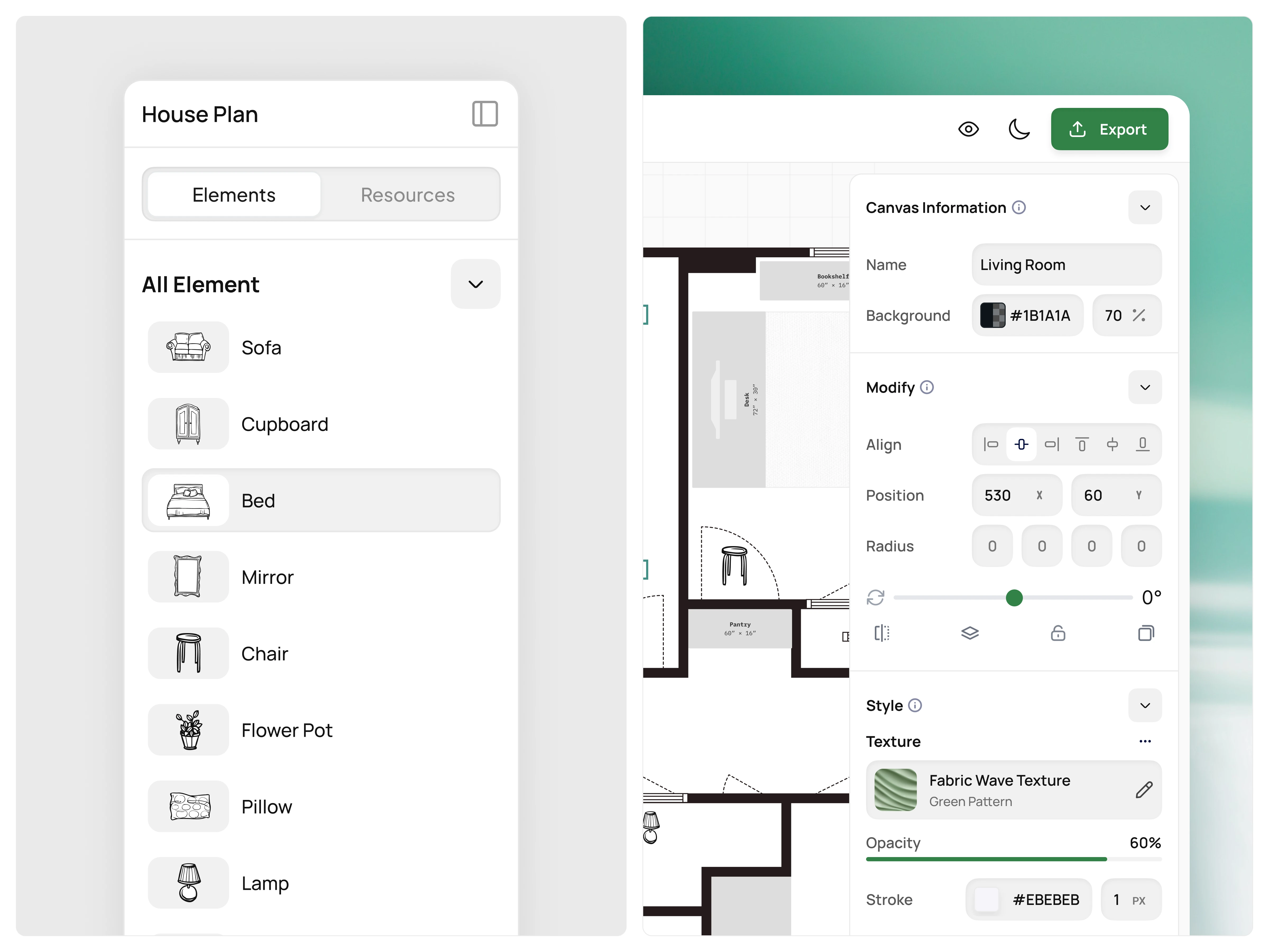 The interface is built around a canvas-based workspace with intuitive controls and a structured side panel. We prioritized spatial clarity, consistent tools, and direct manipulation so users can adjust layouts, textures, and elements naturally while staying focused on the room design.