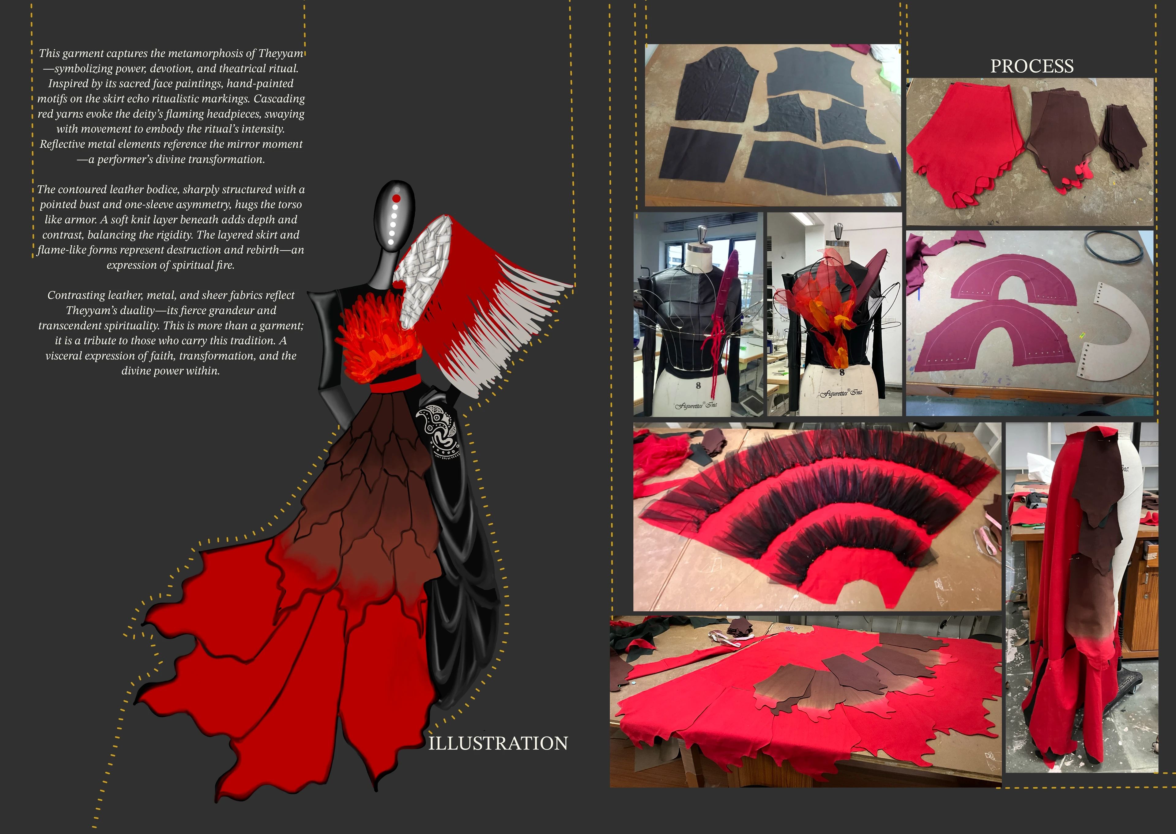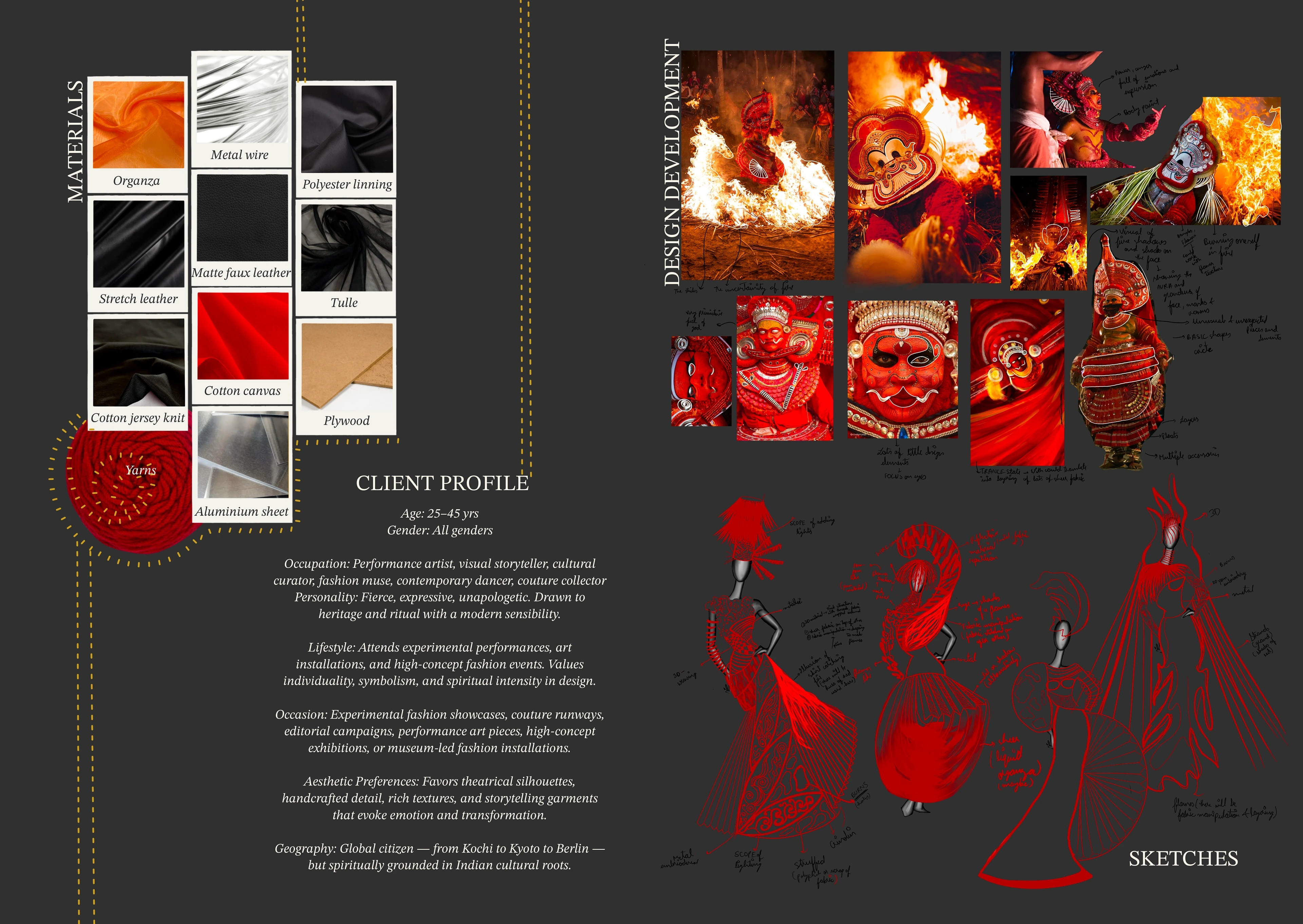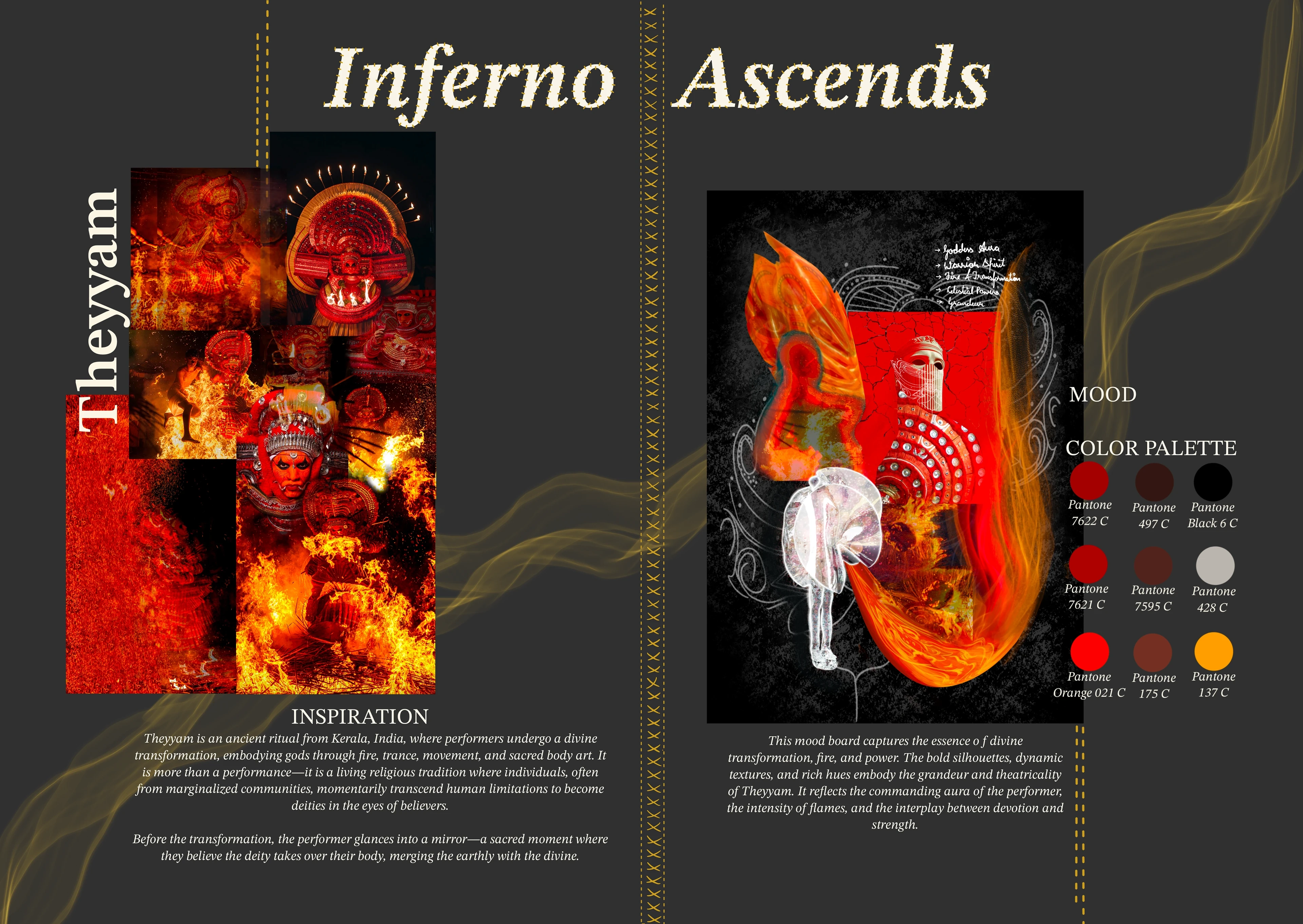 Inferno Essence is an avant-garde fashion collection inspired by the ritualistic visual language of Theyyam.