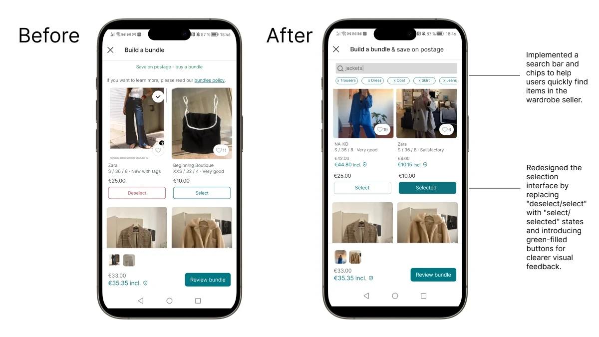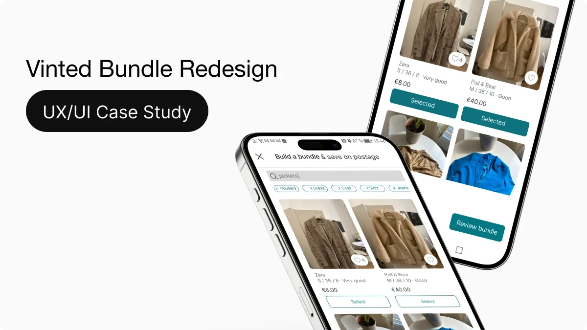 This case study showcases a UX/UI redesign of Vinted’s bundle builder, introducing search and filter chips for easier item discovery and clearer select buttons for improved user feedback.
