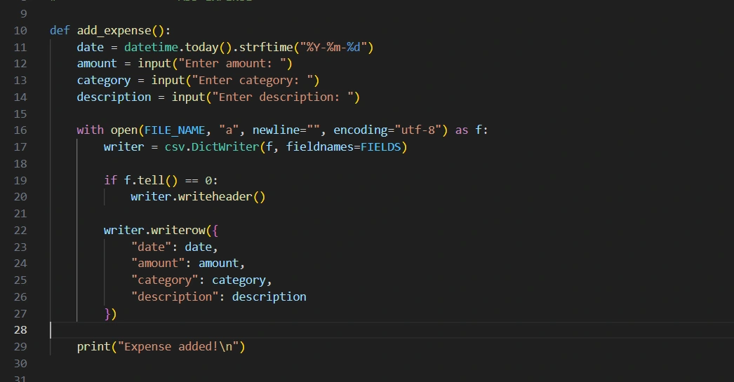A Python-based financial tool to automate expense logging and categorization. Replaced manual spreadsheets with CSV data persistence and automated reporting.