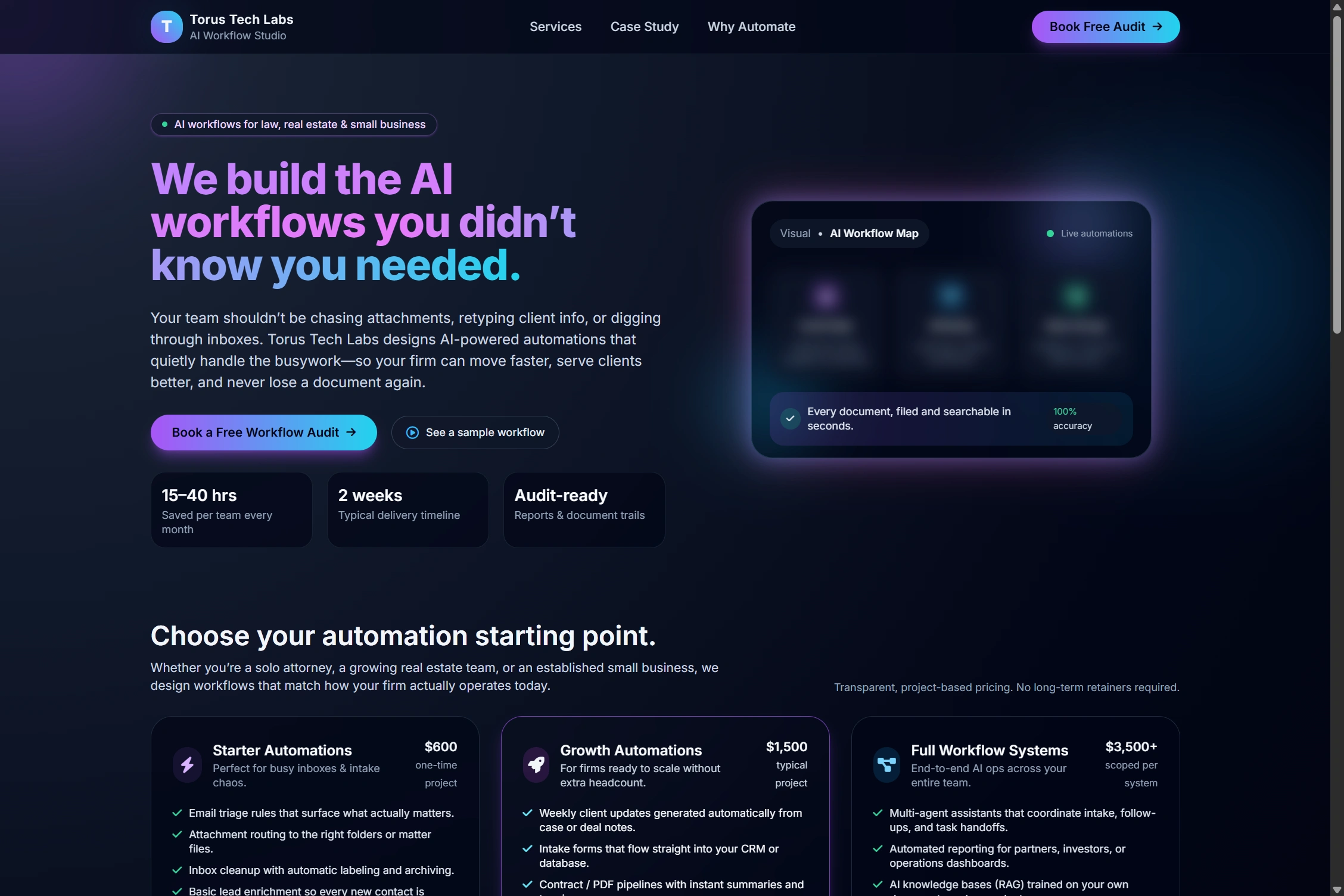 Torus Tech Labs delivers bespoke AI workflow automation solutions designed to transform how professional firms operate. Specialized in legal, real estate, and small business environments, the platform eliminates repetitive busywork by embedding intelligent automation into core processes—routing email intake, tagging and summarizing client communication, managing documents, and syncing information across cloud systems.