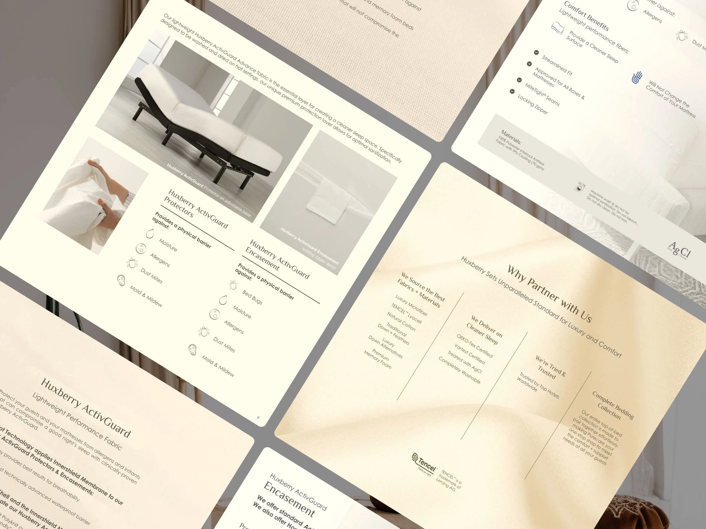 For Huxberry’s ActivGuard series, I led the design, layout, and copywriting for a lookbook that not only showcased the product’s advanced technology but also set a refined and cohesive brand tone. The goal was to create a branding and styling guide that established the mood and aesthetics for this premium collection of mattress encasements and protectors.