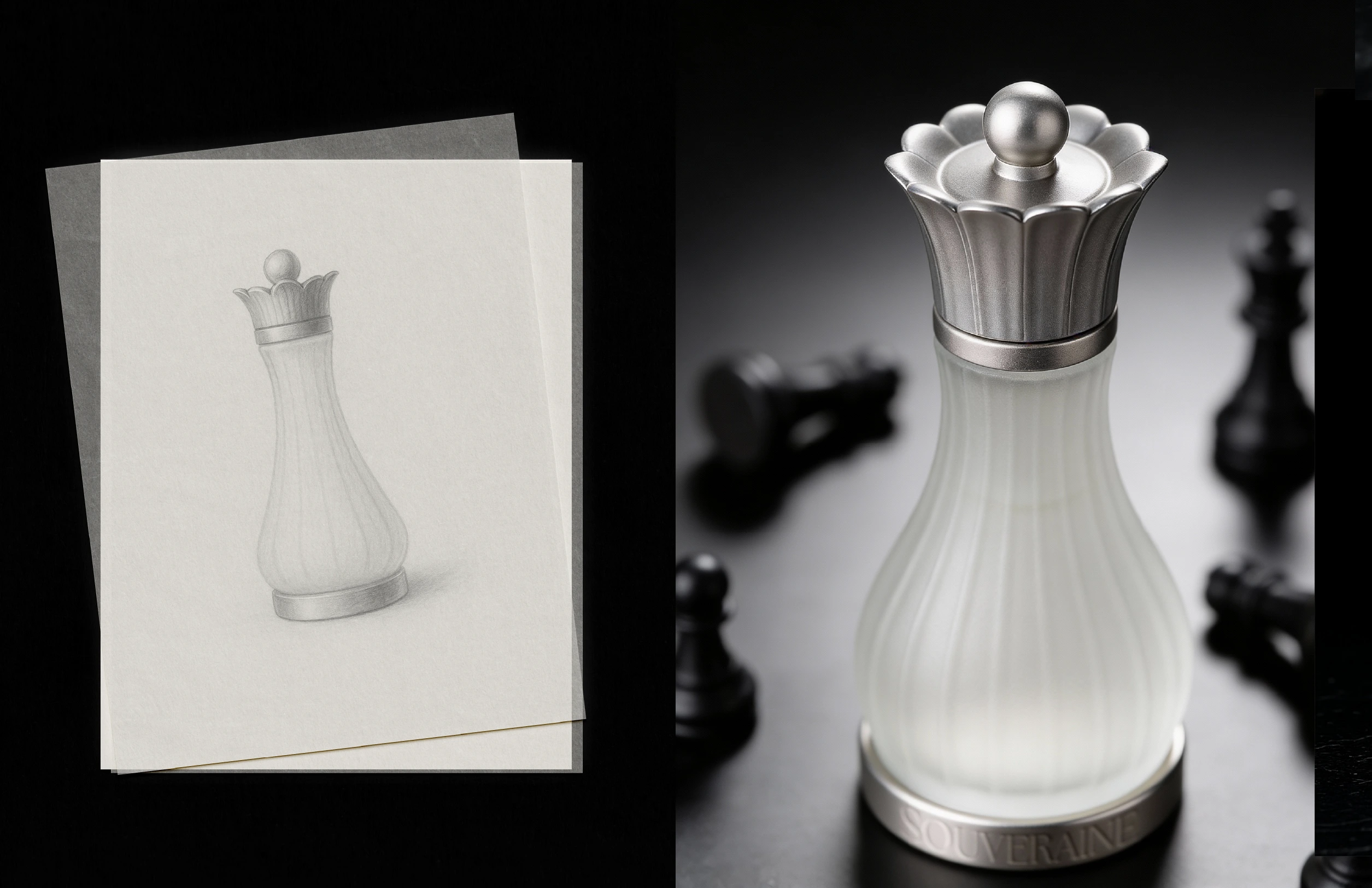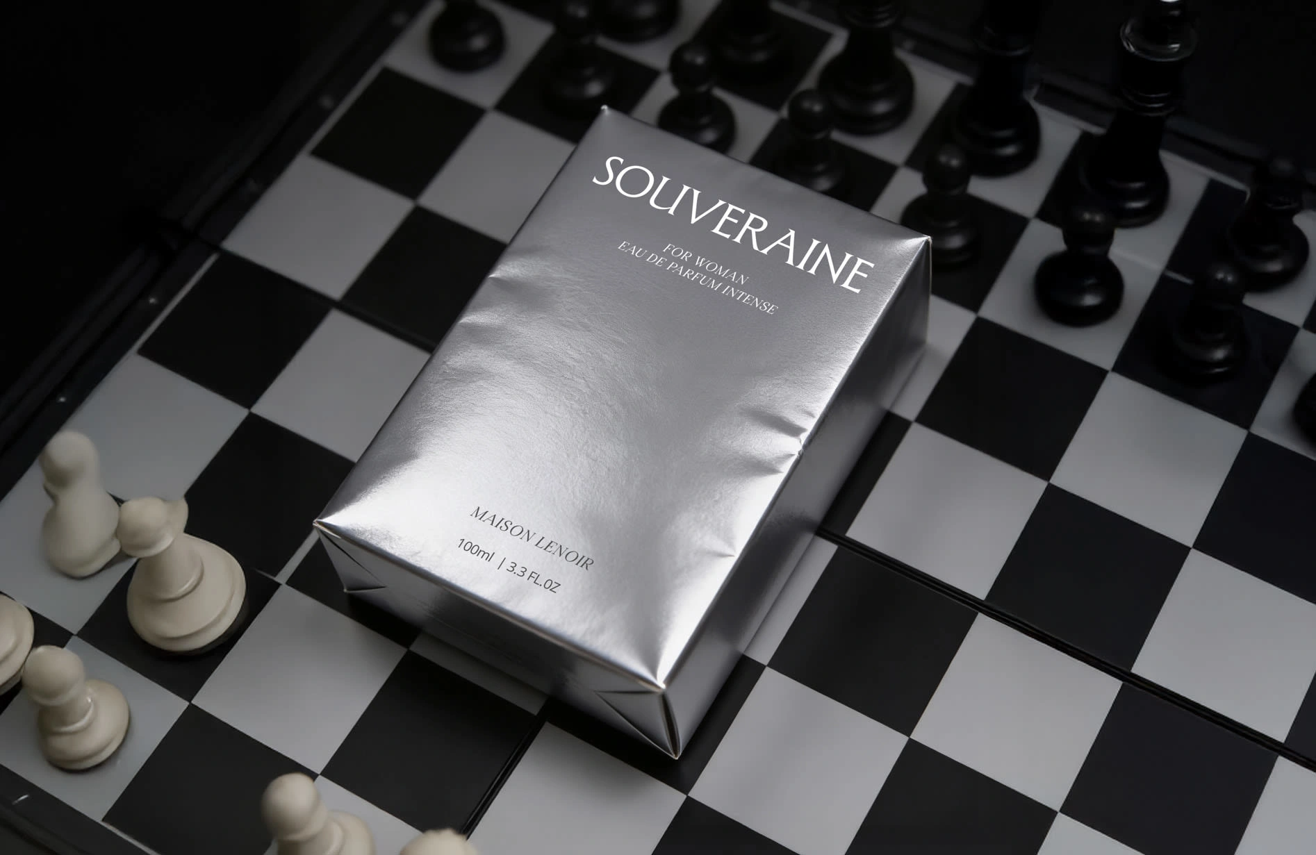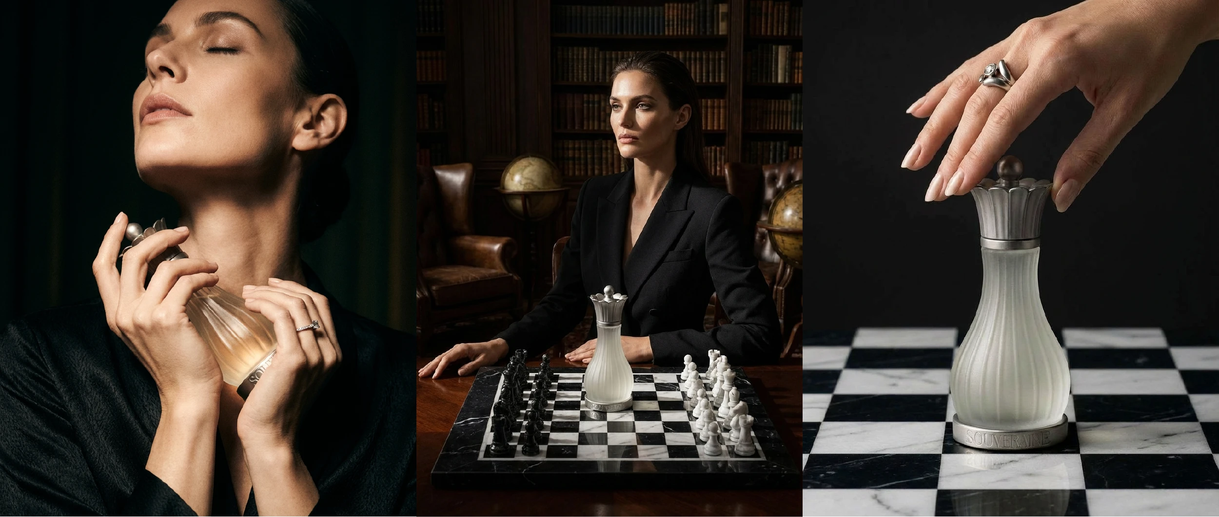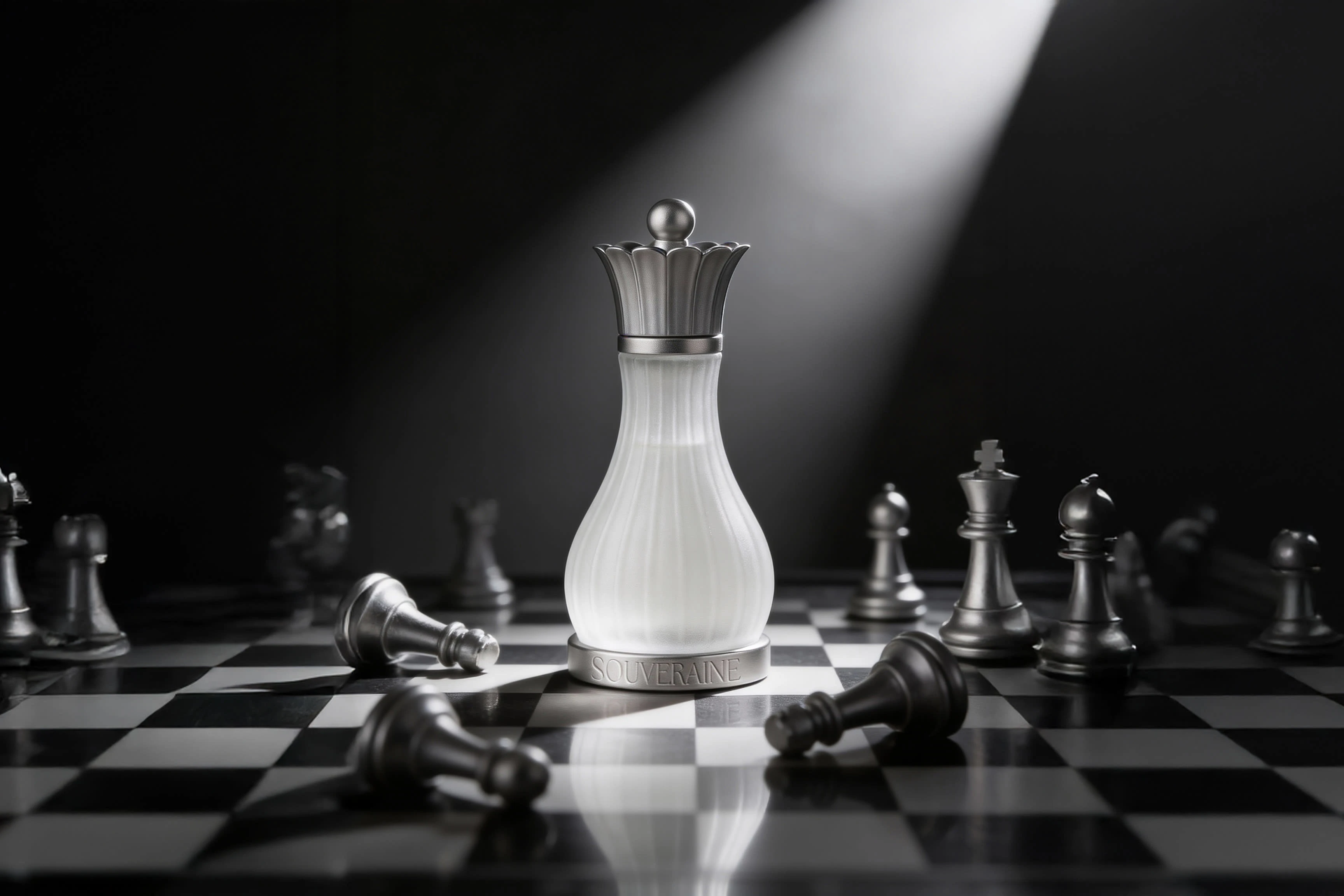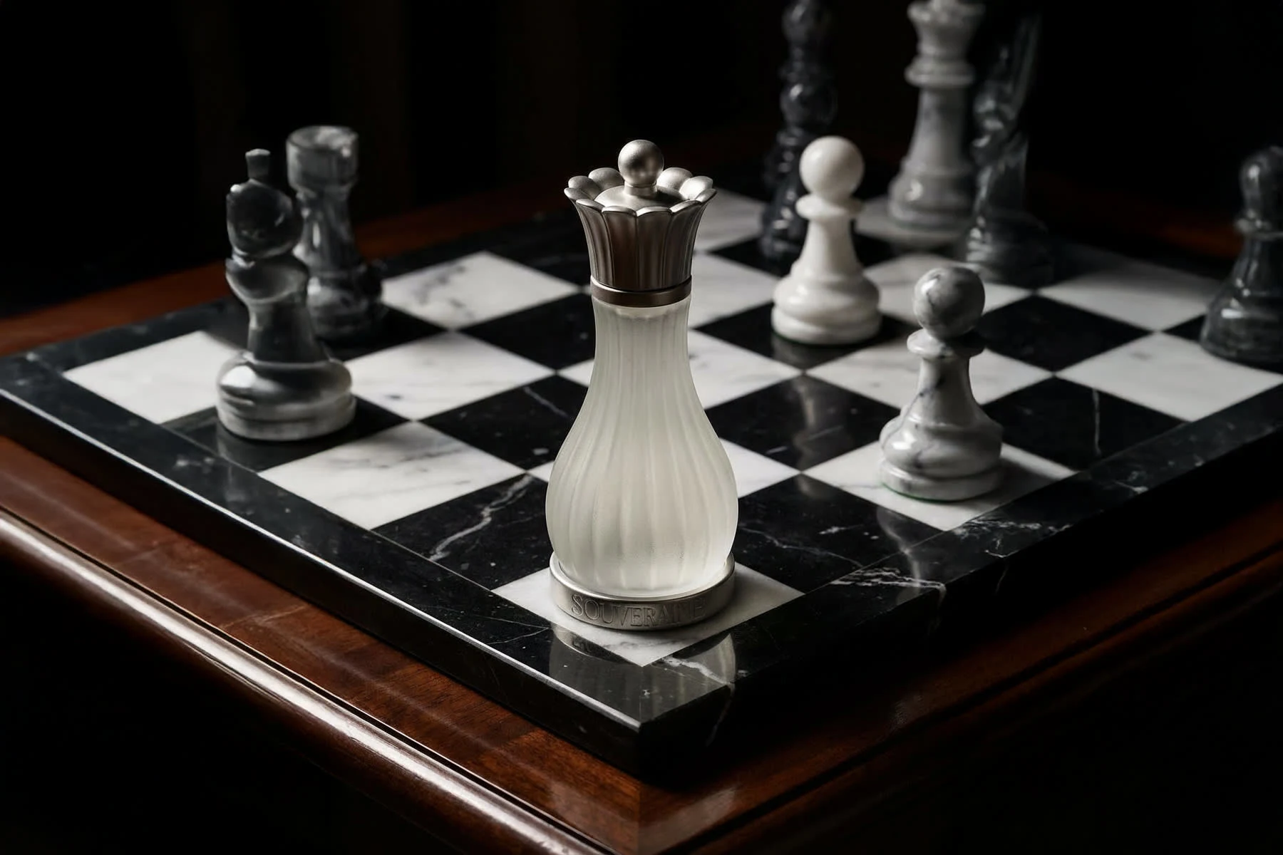 The packaging followed the same restraint: a rigid silver carton, classical serif typography, hierarchy as the only ornament. The campaign was directed around three registers — the intimate, the strategic, the tactile — building toward a hero image of the bottle standing at the centre of a chessboard, every other piece fallen around it. Sovereign.