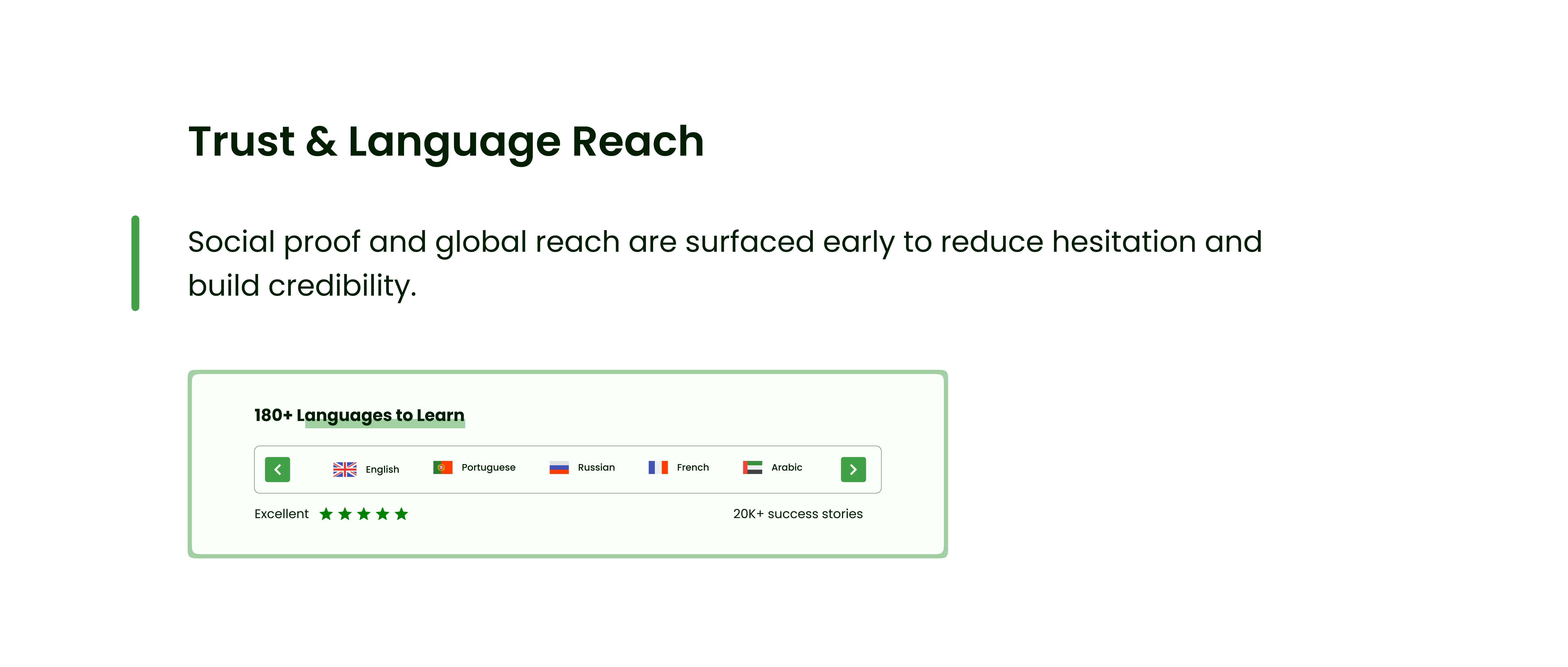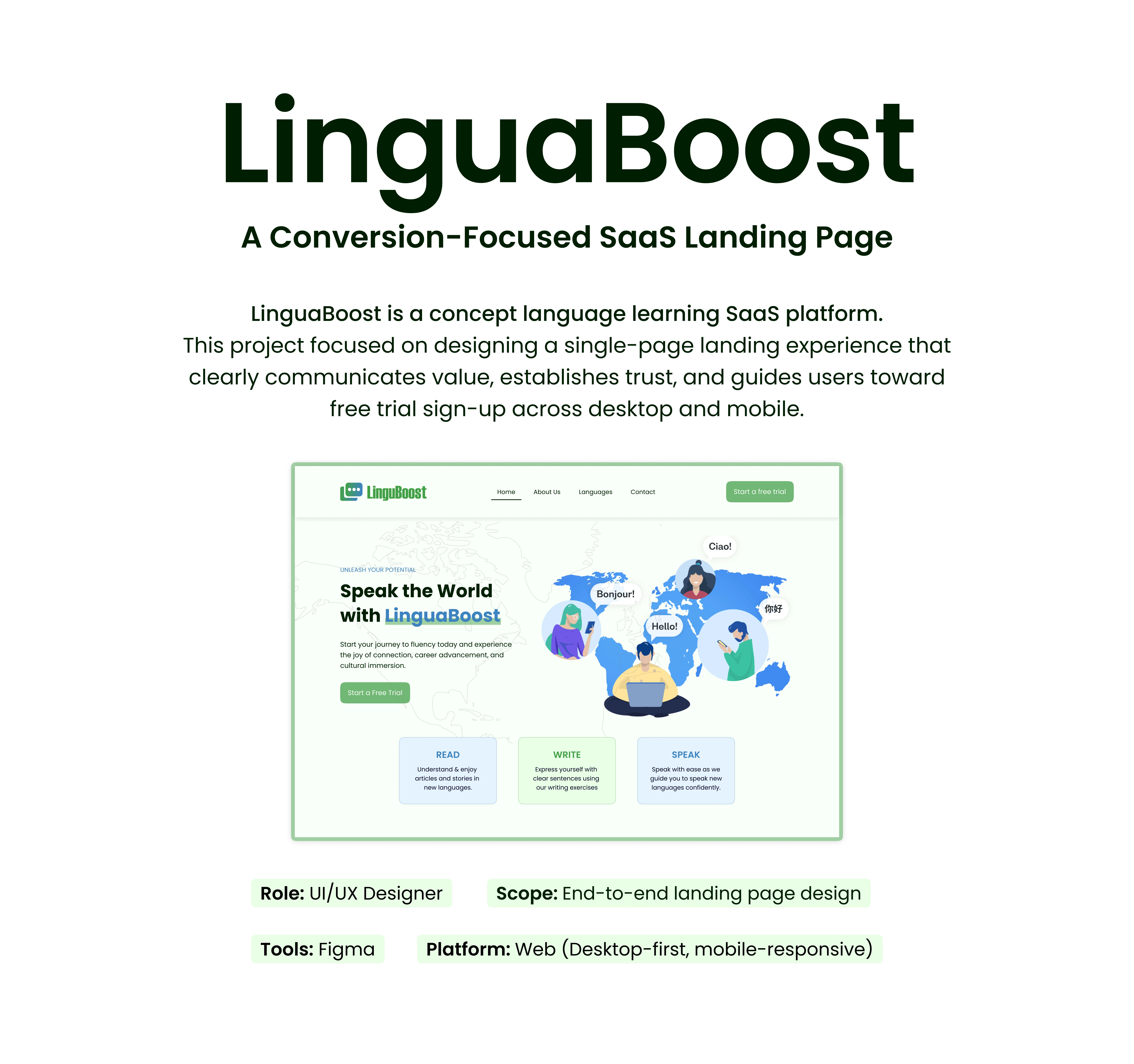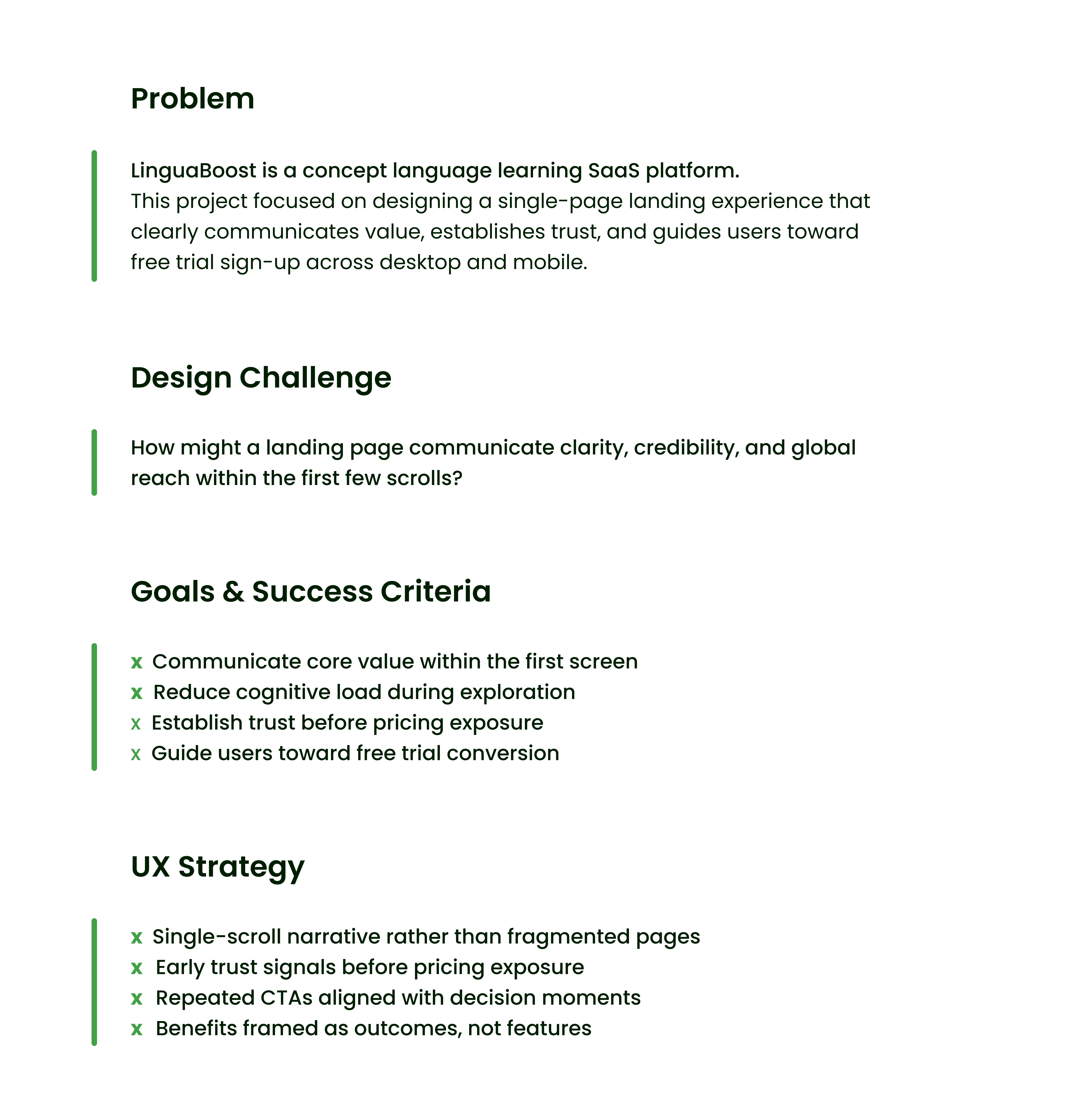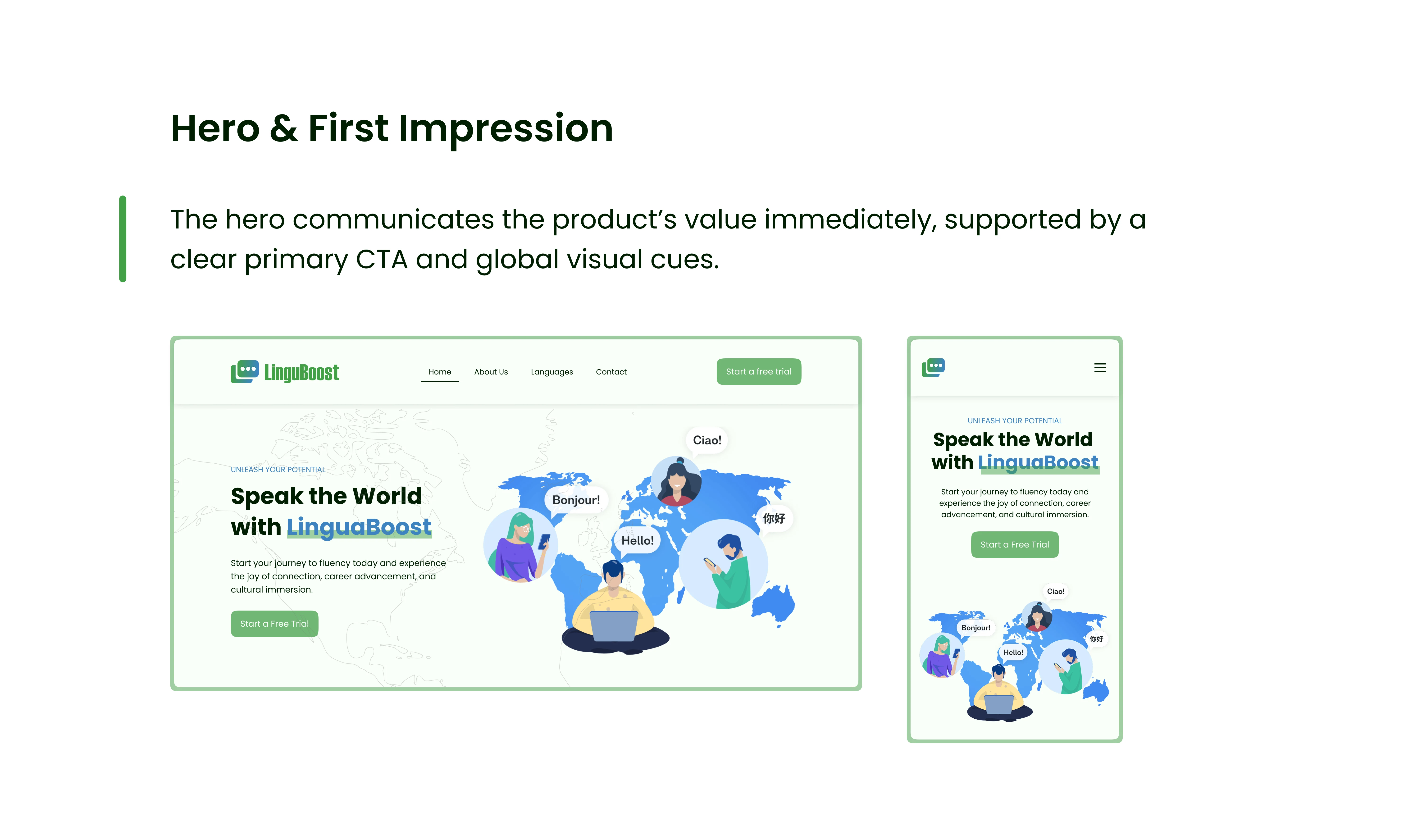A UX-driven landing page design for a concept language-learning SaaS, focused on clarity, credibility, and free-trial conversion across desktop and mobile.
