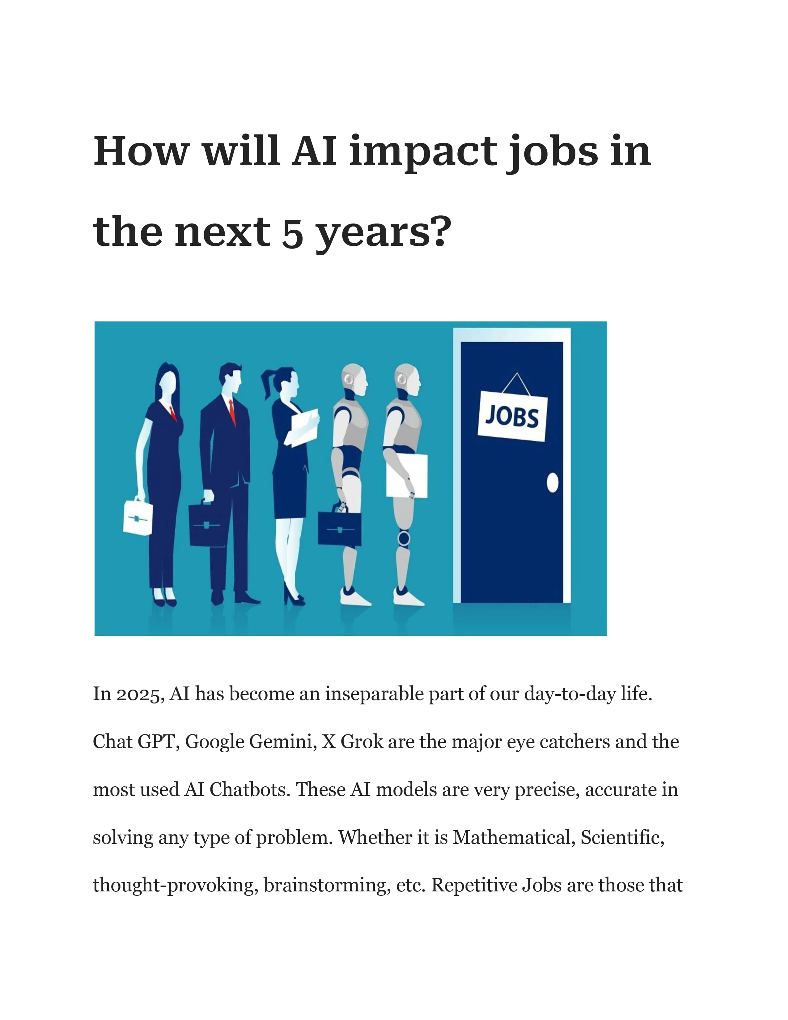 In this Project, I wrote an Article On "How AI will impact Jobs in the next 5 years" for a client. The article is SEO optimized, engaging, and Informative.