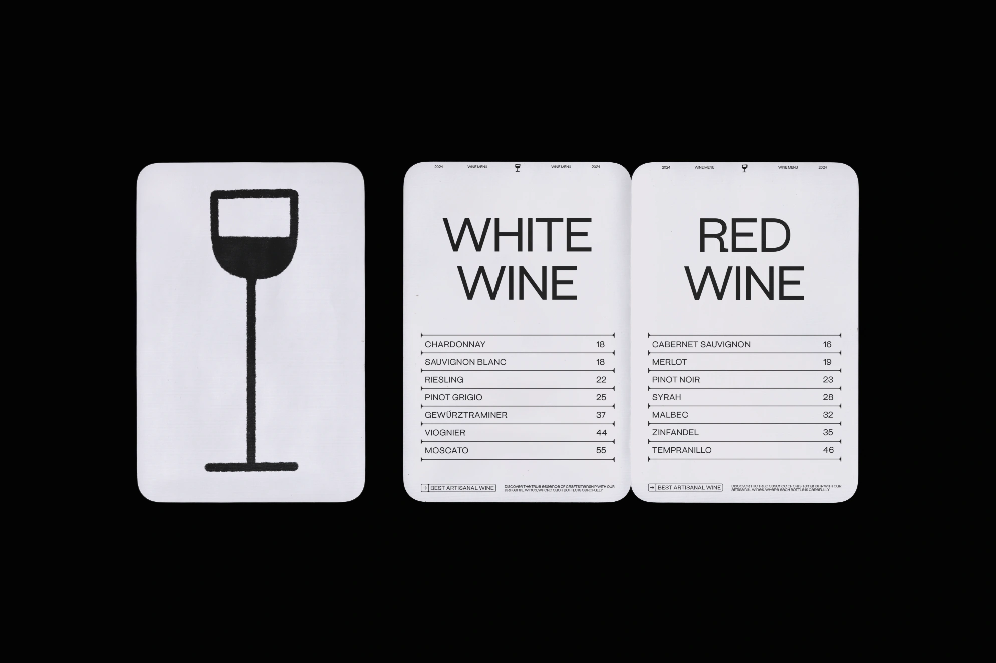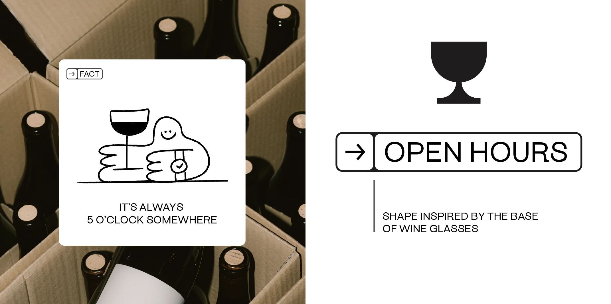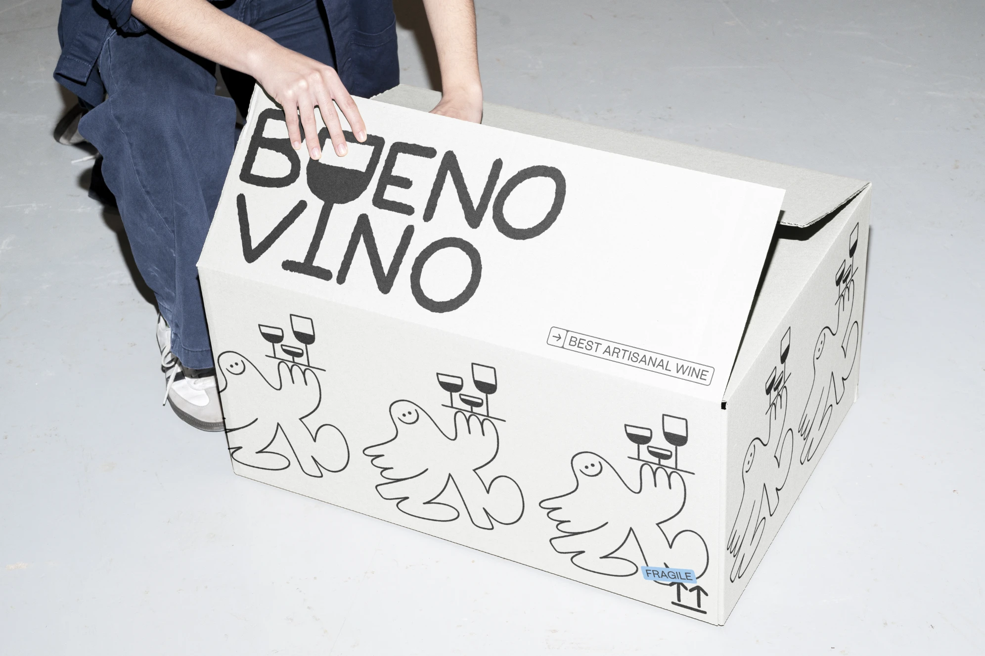 This brand embraces the spirit of joy and craftsmanship, showcasing a fun, hand-drawn character alongside a distinctive logo that highlights its artisanal nature. With a black-and-white color scheme, the brand carries an understated elegance, while still being vibrant and playful—a nod to the lively experience of sharing wine.