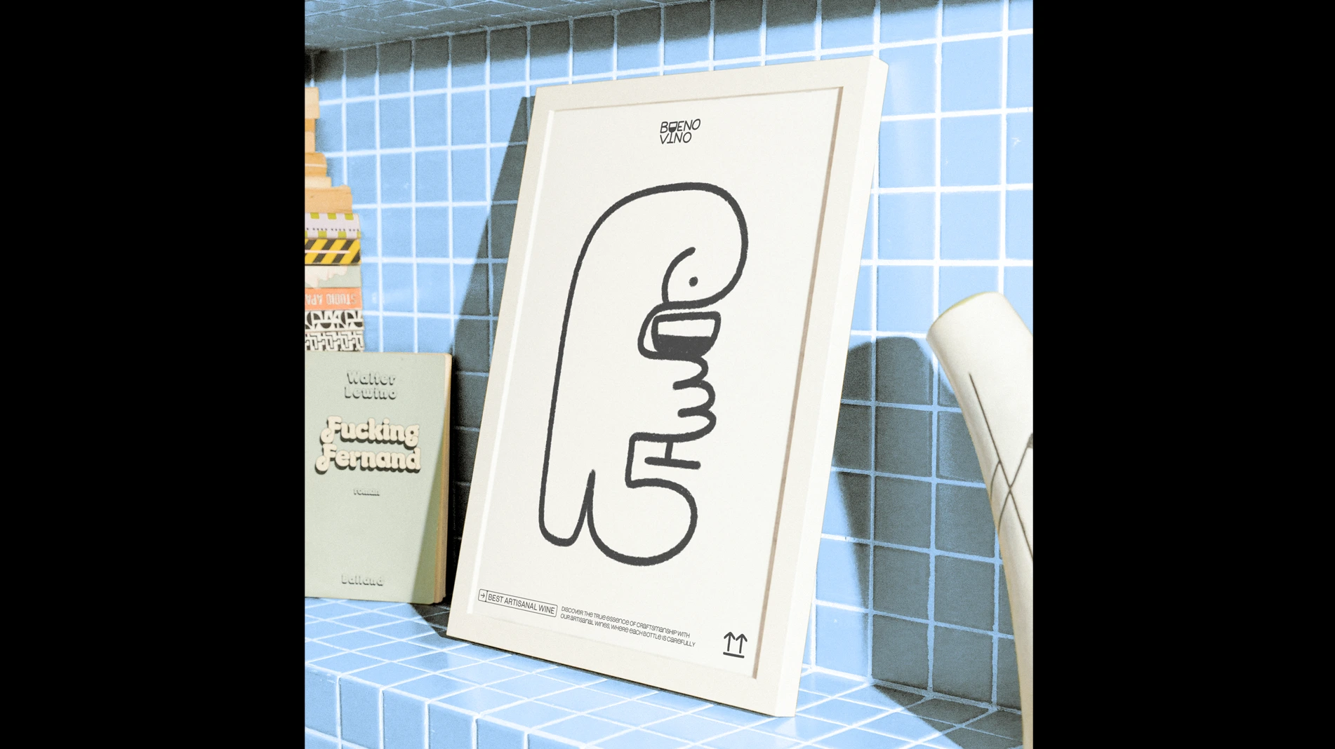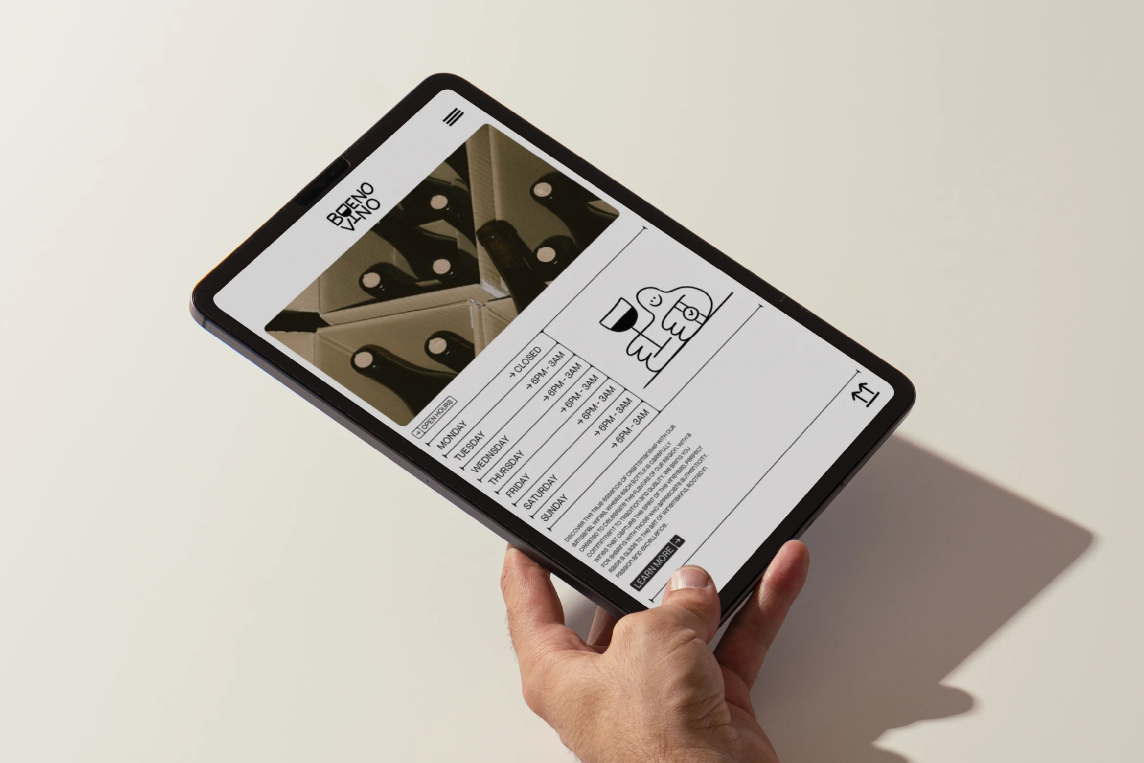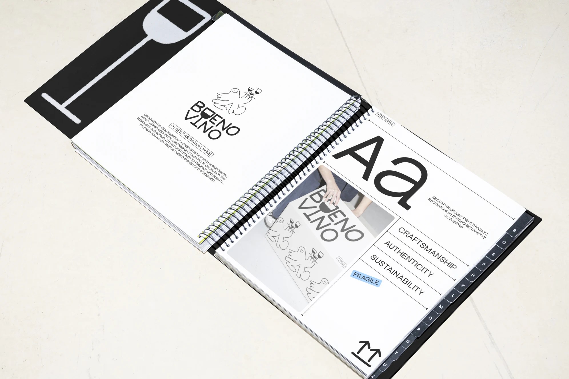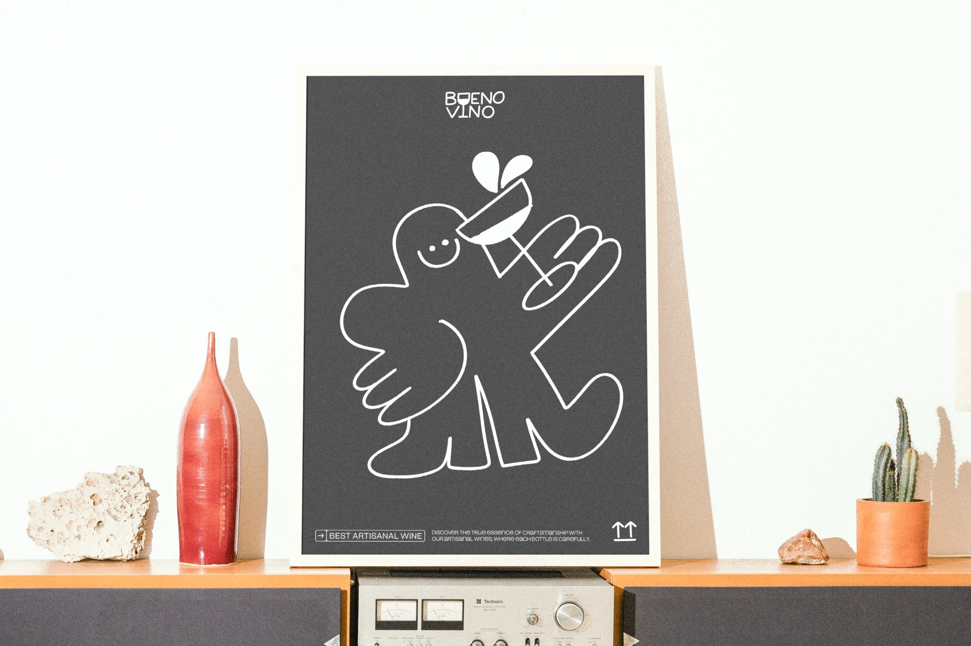 This brand embraces the spirit of joy and craftsmanship, showcasing a fun, hand-drawn character alongside a distinctive logo that highlights its artisanal nature. With a black-and-white color scheme, the brand carries an understated elegance, while still being vibrant and playful—a nod to the lively experience of sharing wine.