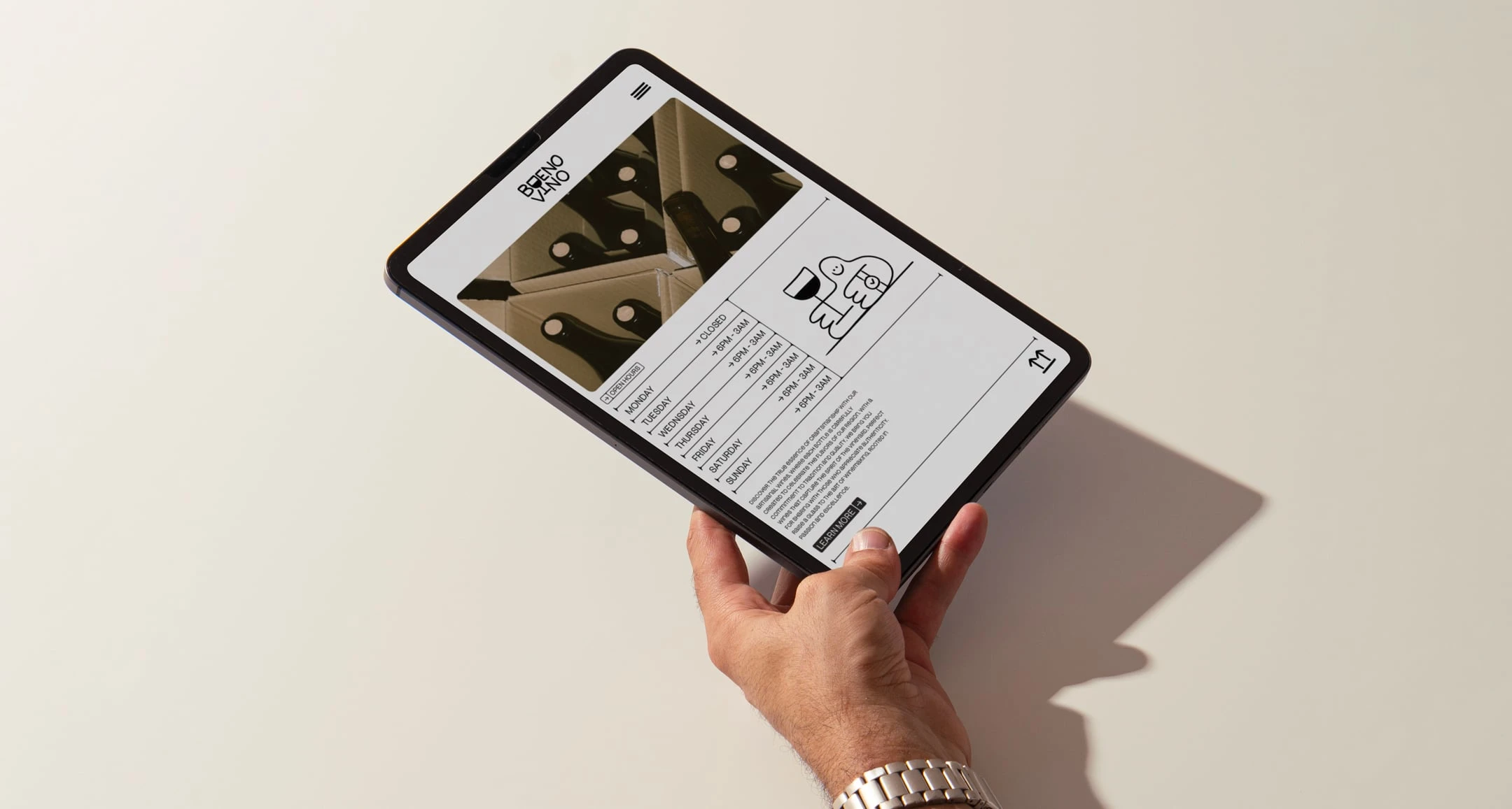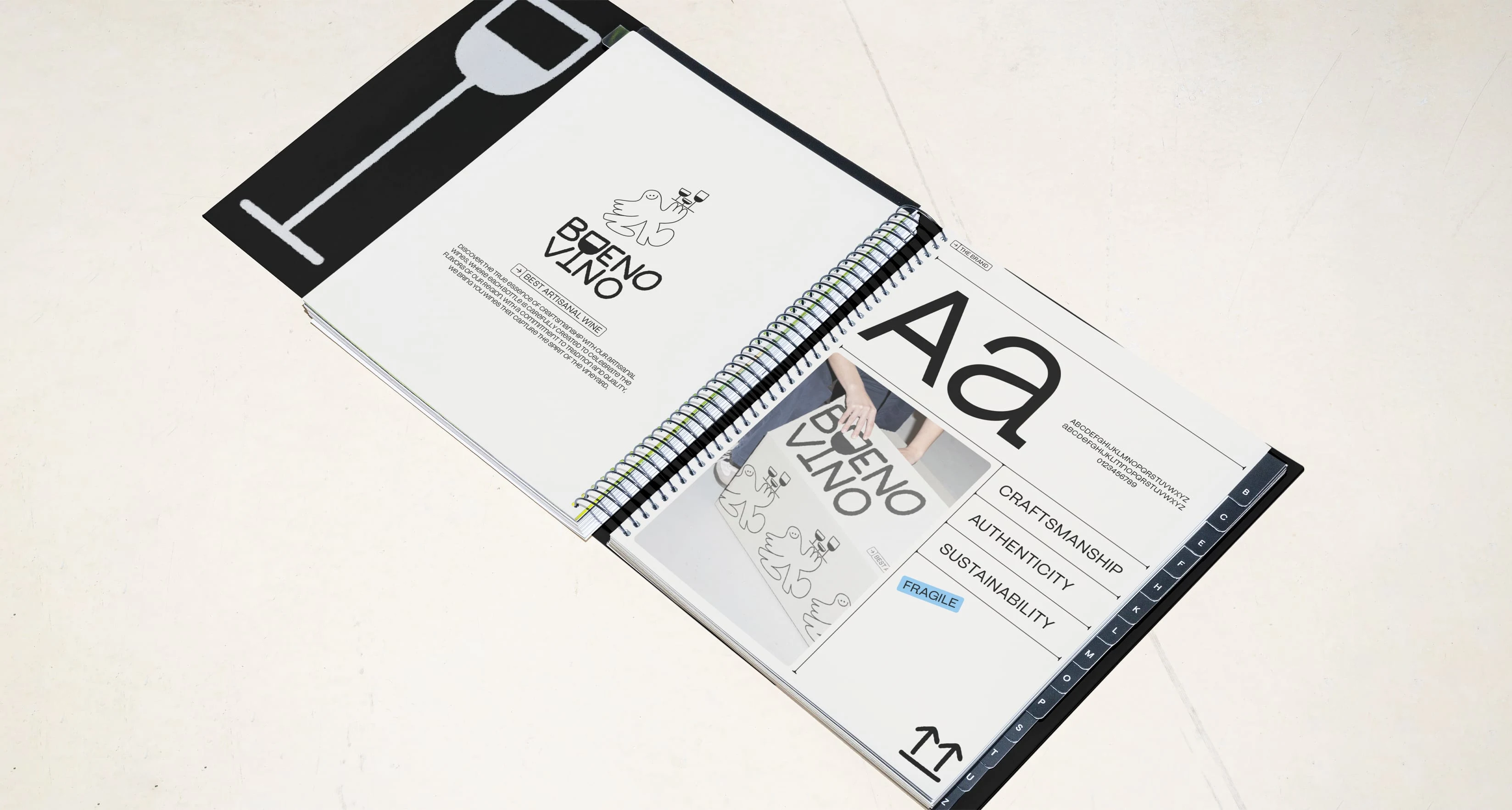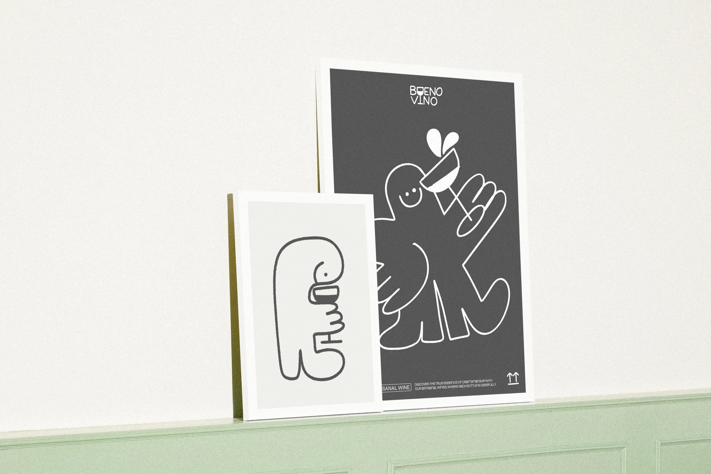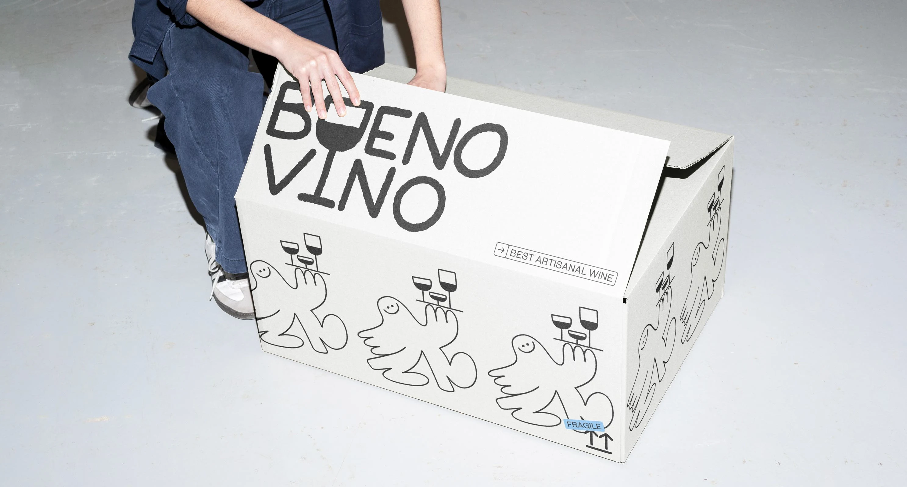 This brand embraces the spirit of joy and craftsmanship, showcasing a fun, hand-drawn character alongside a distinctive logo that highlights its artisanal nature. With a black-and-white color scheme, the brand carries an understated elegance, while still being vibrant and playful—a nod to the lively experience of sharing wine.