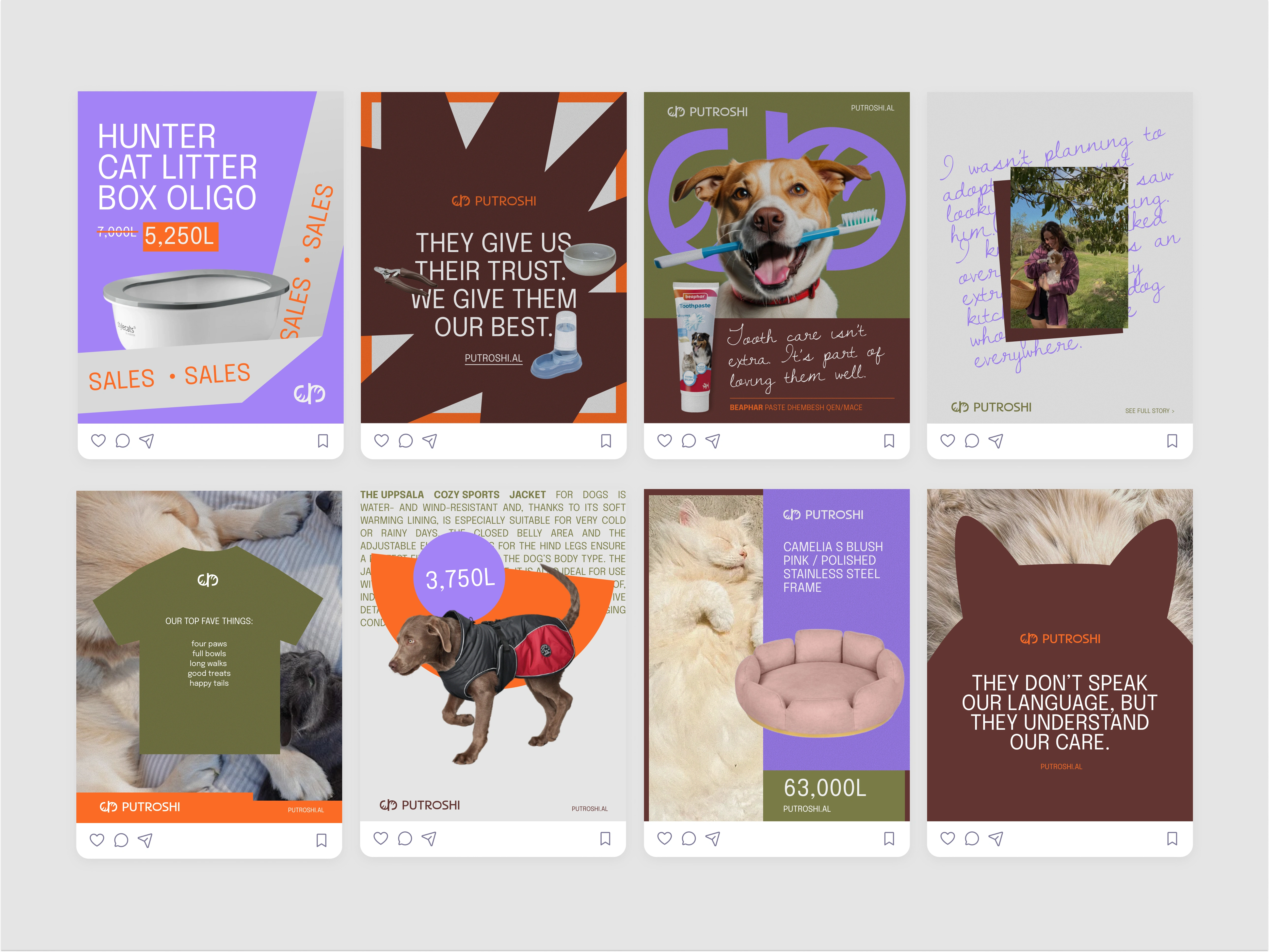 The result is a cohesive and practical brand identity that grows with the shop. Putroshi now has a visual system that supports community building, encourages interaction, and makes everyday communication effortless. The brand feels familiar, reliable, and real—strengthening its relationship with pet owners while remaining easy to maintain internally.