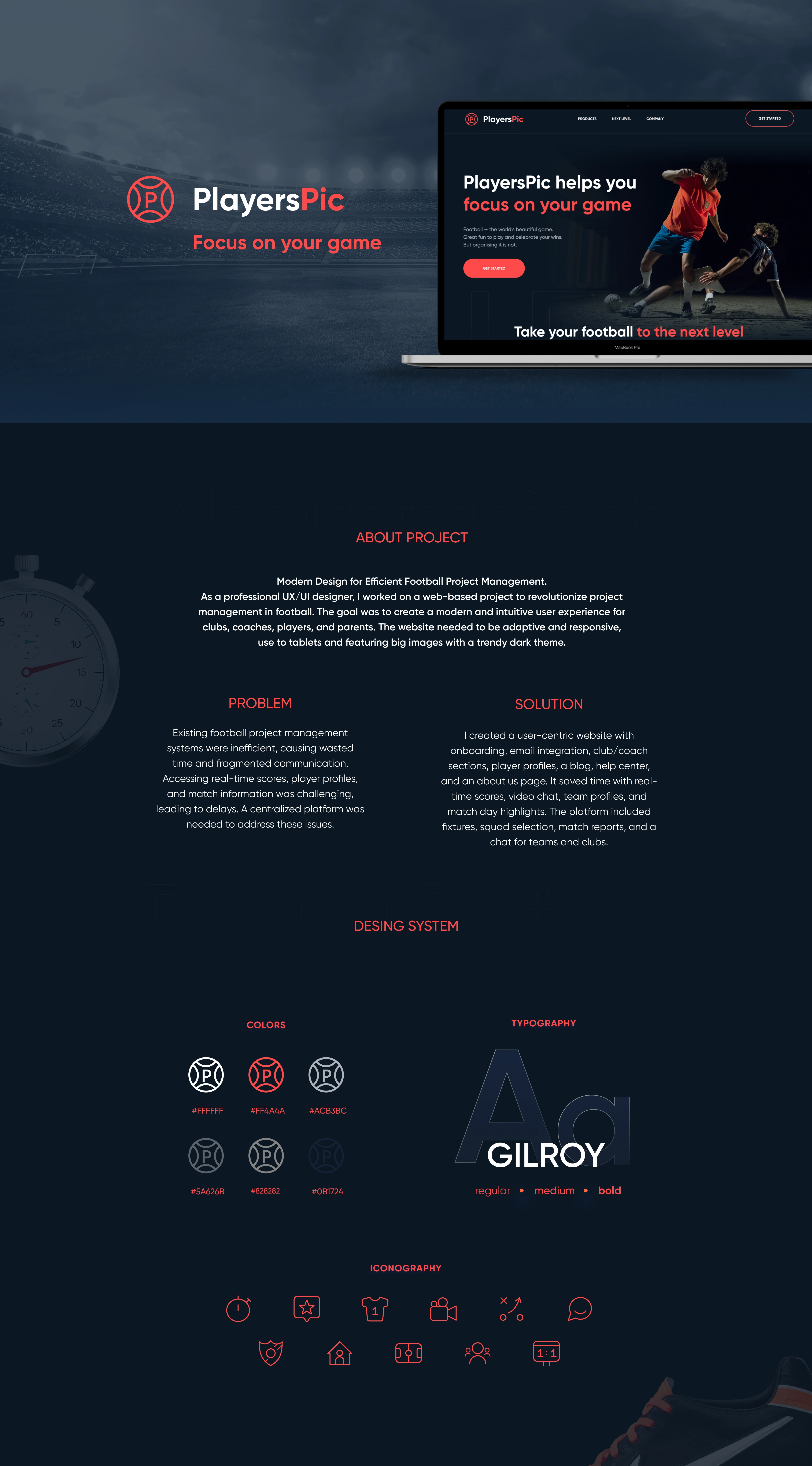 As a UX/UI designer, I transformed football project management with a sleek web platform, eradicating inefficiencies and enhancing communication. I crafted a responsive site with a contemporary dark theme optimized for tablet use. Addressing the challenge of unwieldy systems causing time wastage and communication gaps in clubs, I implemented a centralized platform featuring registration, email integration, dedicated sections for clubs and coaches, player profiles, a blog, help center, and an about us page. This solution offers real-time access to match results, video chat, team profiles, and matchday highlights, streamlining match scheduling, squad selection, match reports, and team communication. My design work aims to revolutionize football project management, providing an efficient, cohesive platform for clubs, coaches, players, and parents.