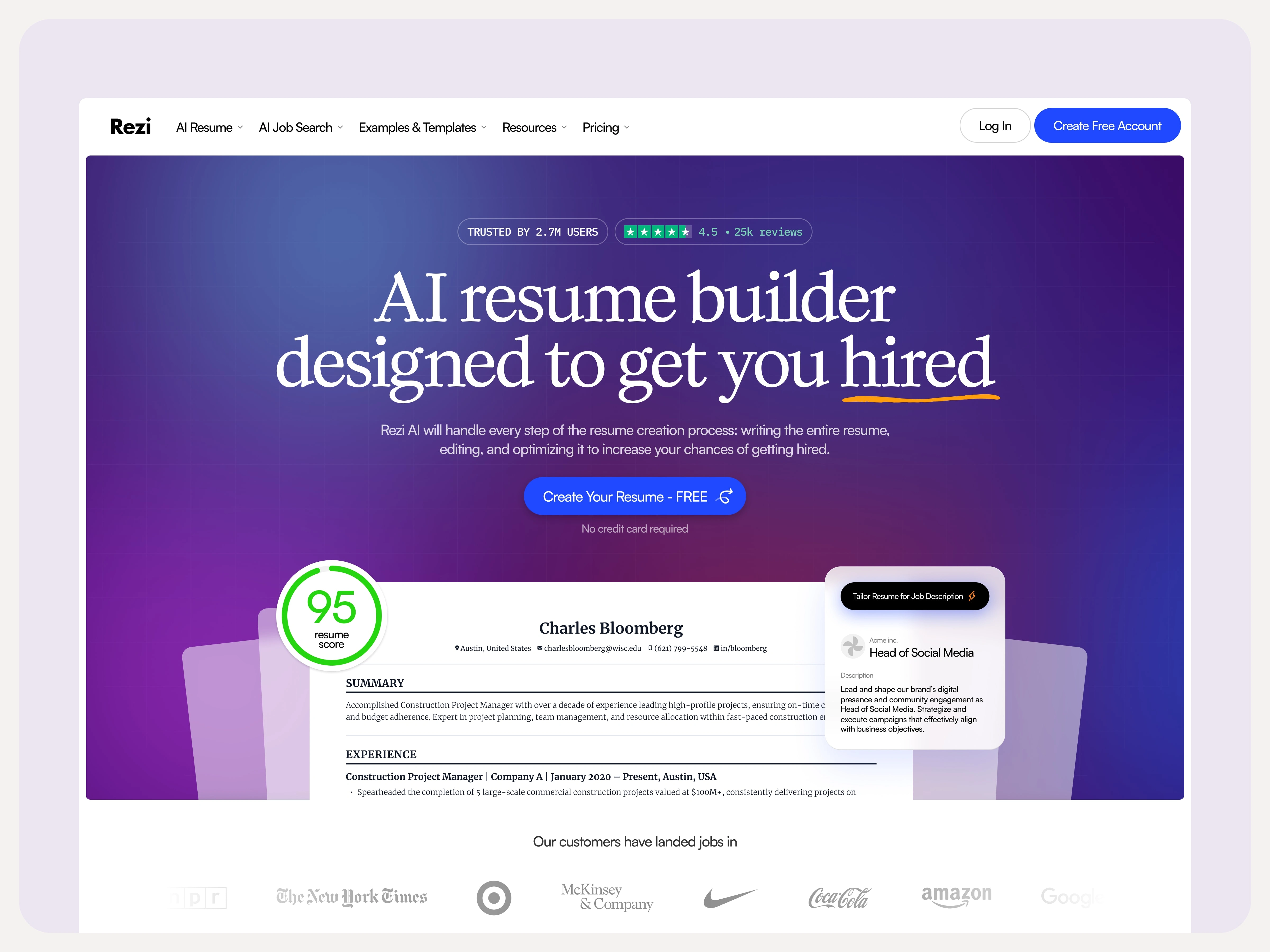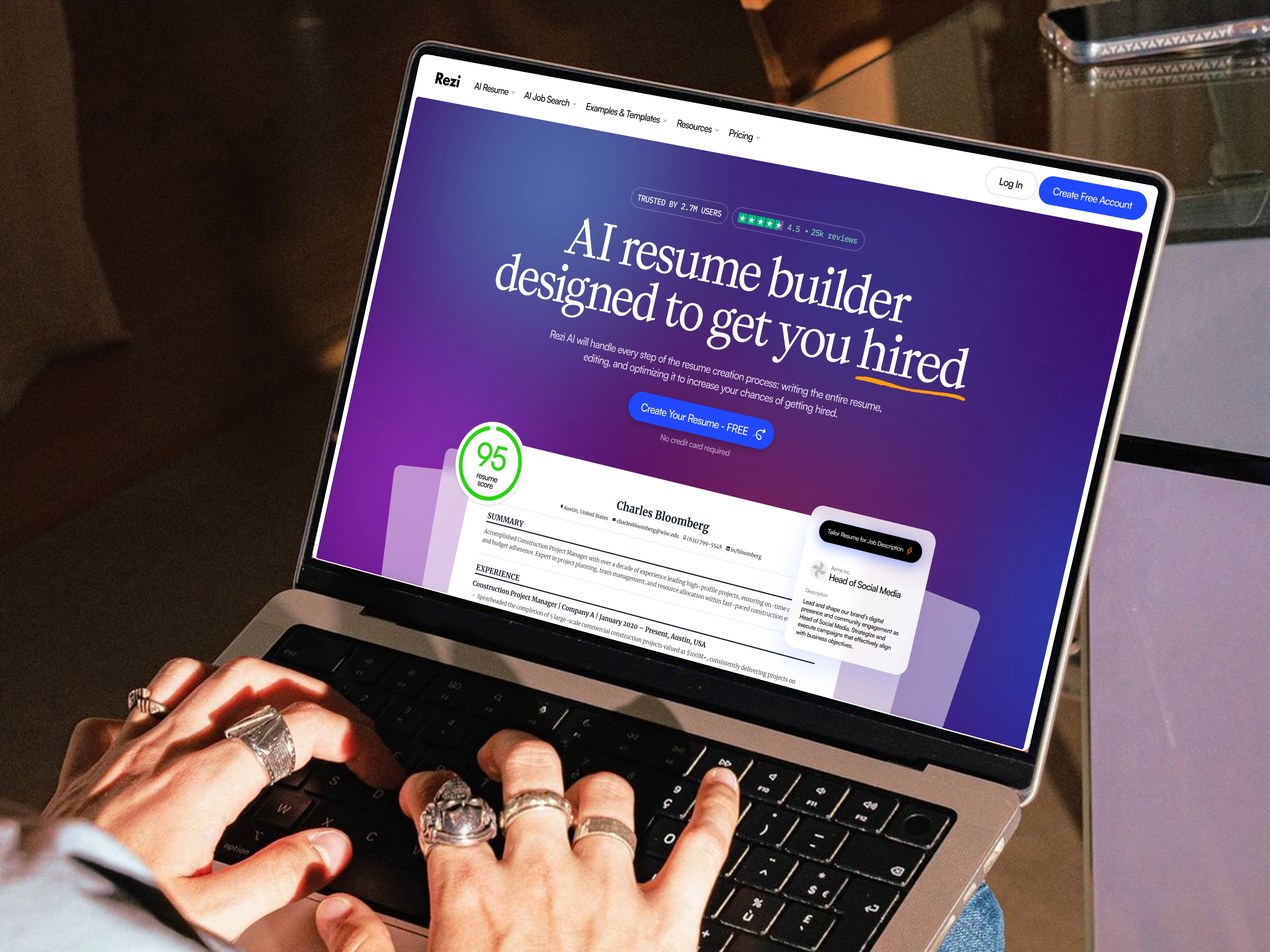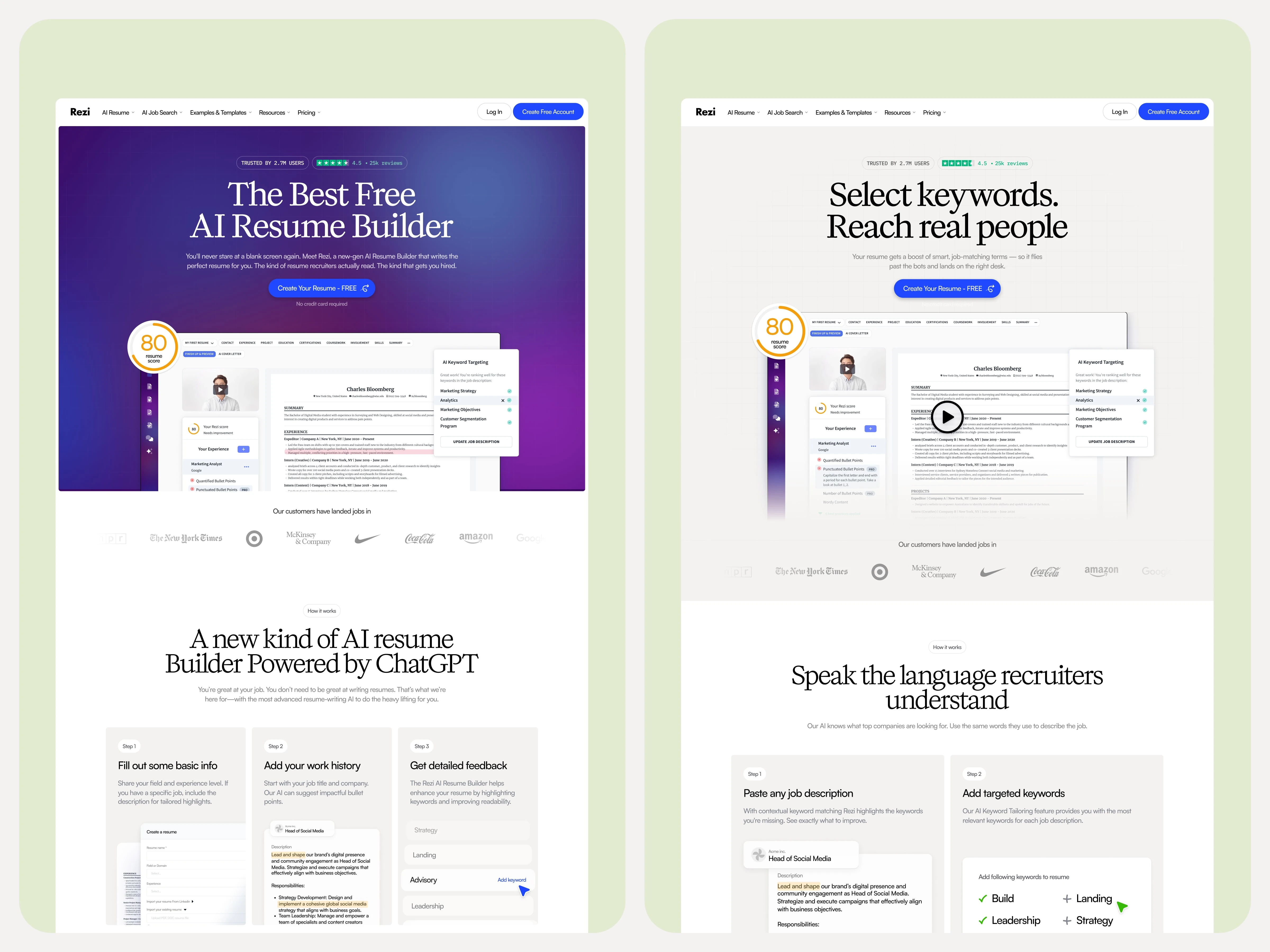 The design centers on clarity and confidence. A bold purple gradient hero showcases the Rezi interface in action, while a clean layout walks visitors through the problem (ATS rejection), the solution (keyword targeting and scoring), and the proof (4 million users, 62% interview rate). Interactive keyword targeting visualizations, before/after resume comparisons, and user testimonials against dark backgrounds build credibility. Resume template galleries prove you're not locked into one style, while carousel examples across job titles keep focus on outcomes.
