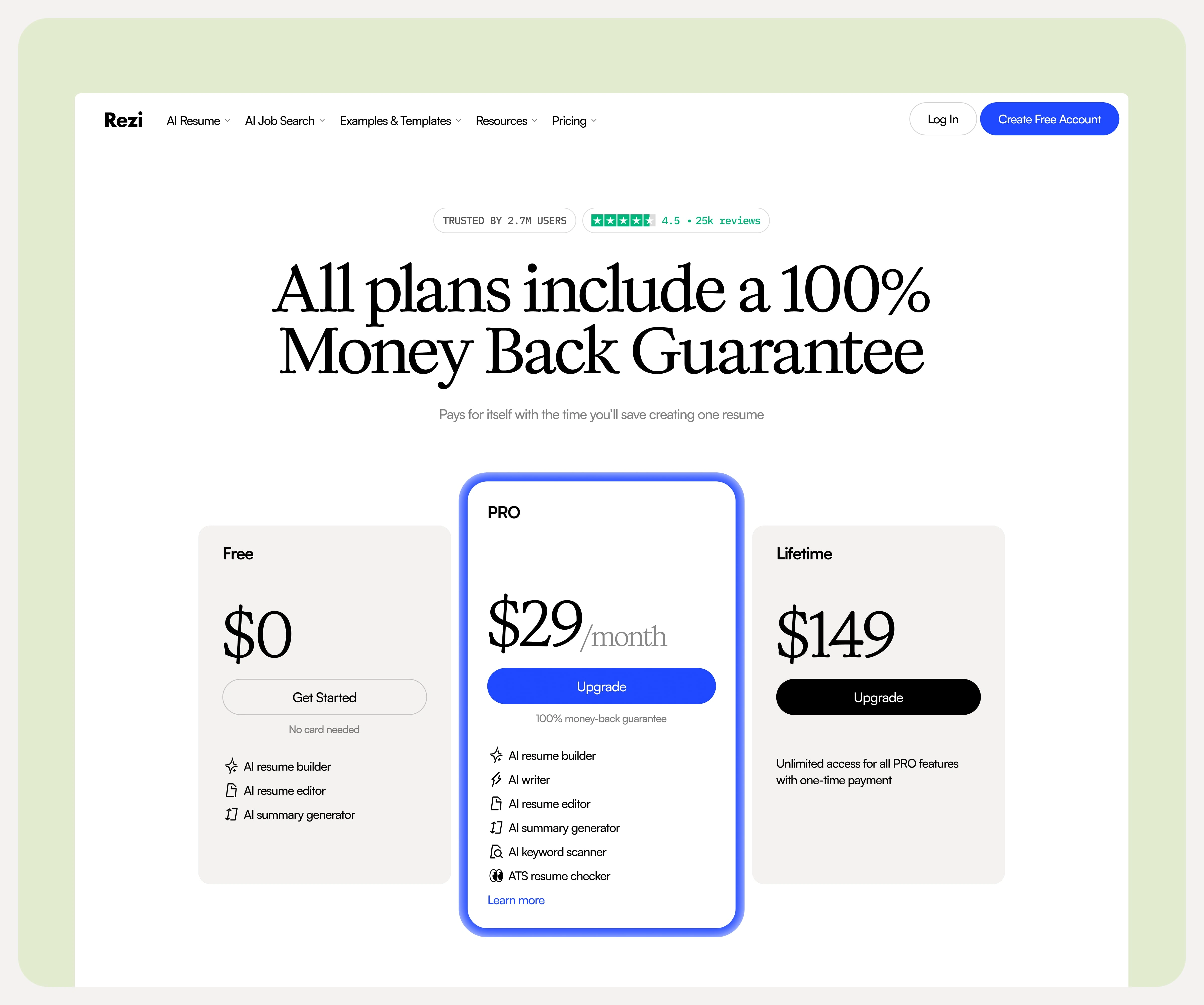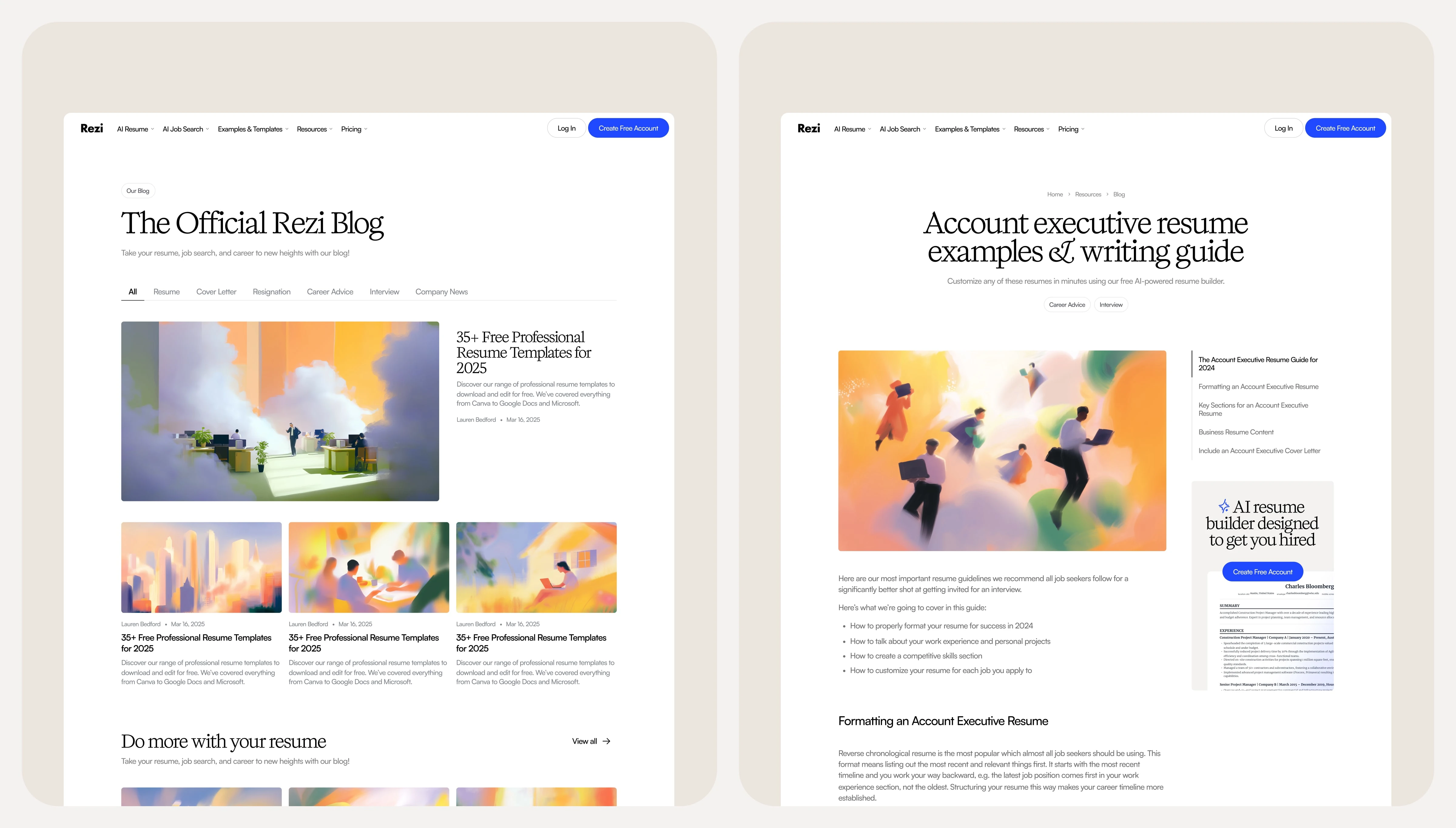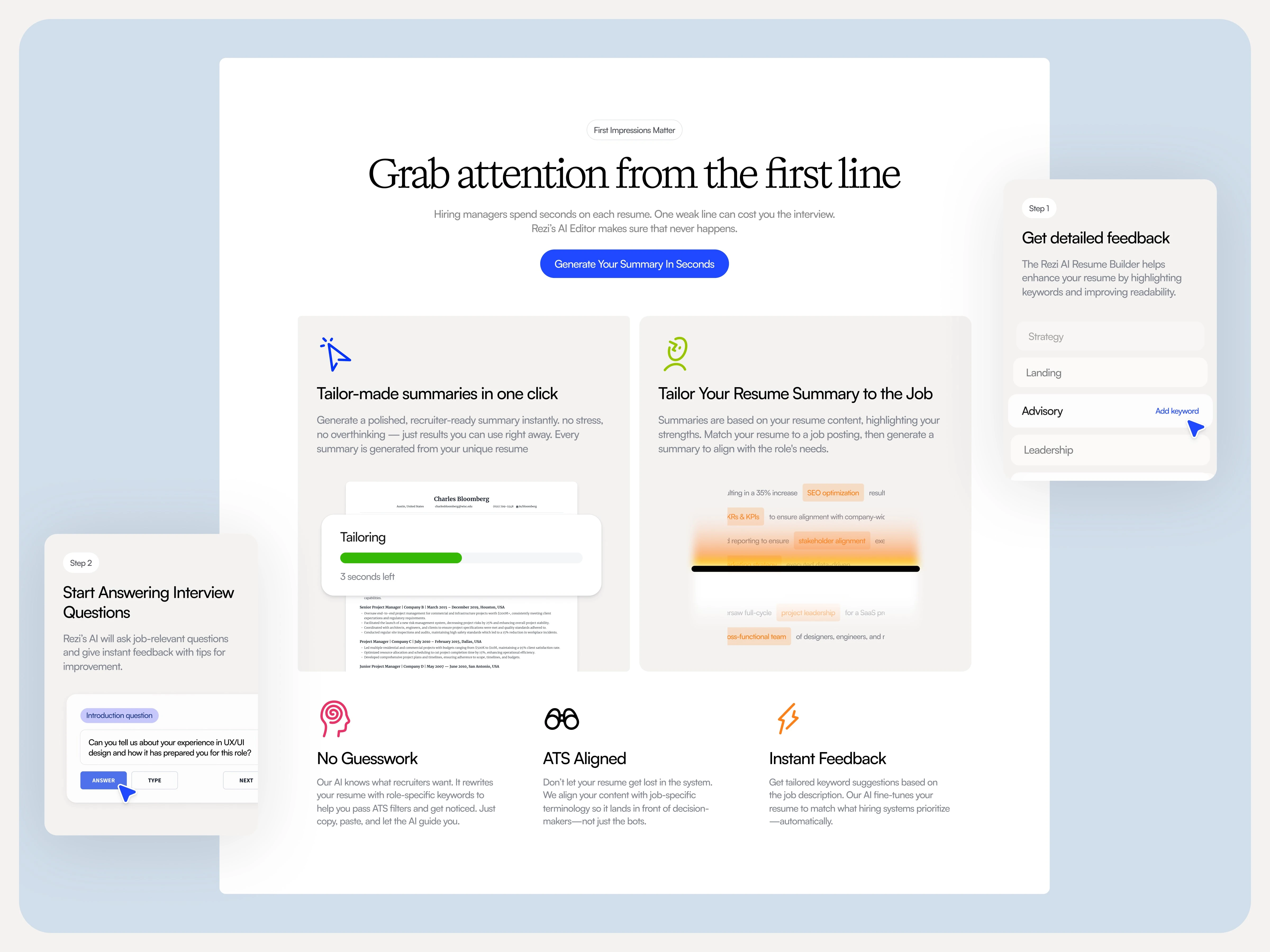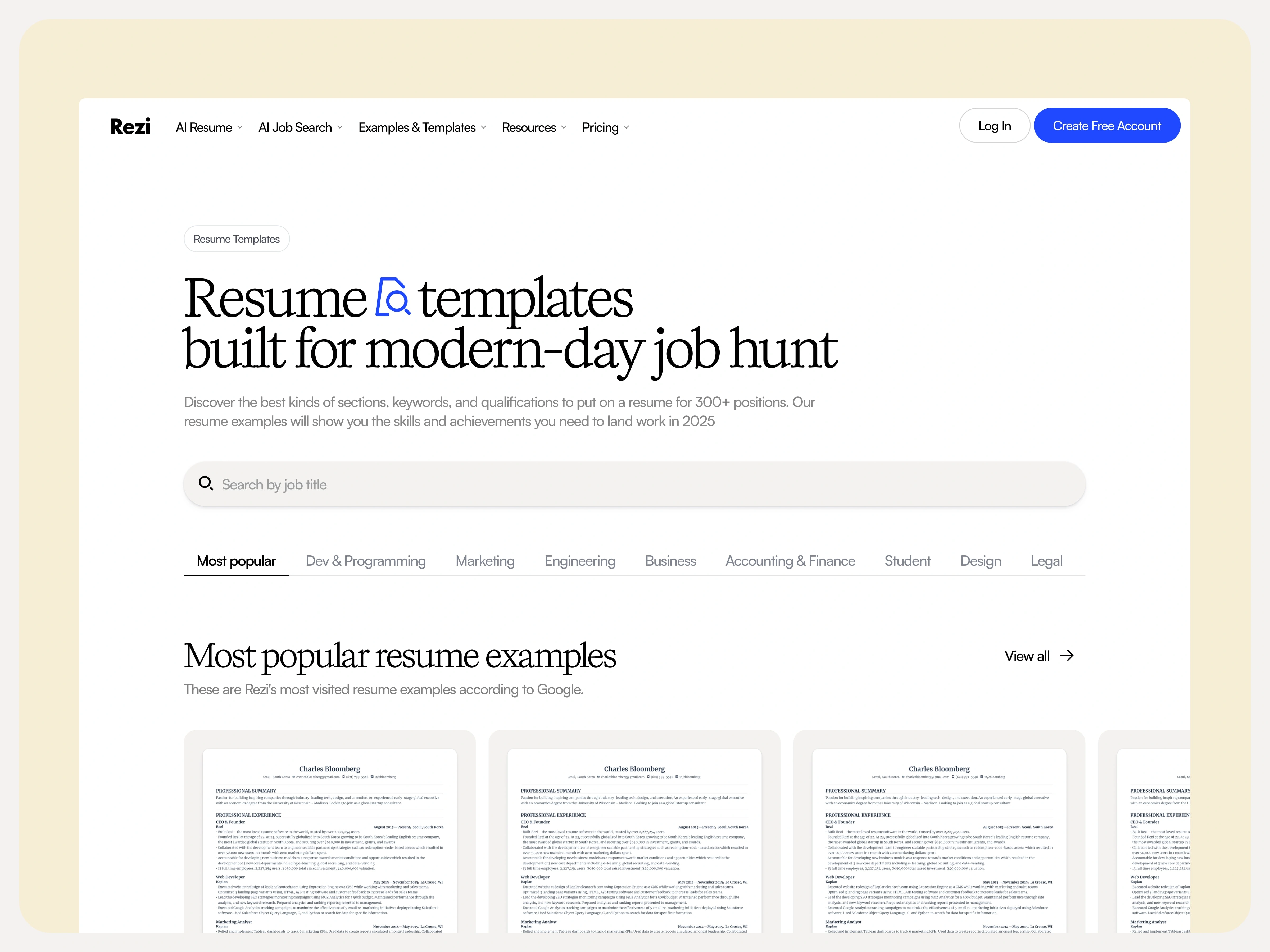 The design centers on clarity and confidence. A bold purple gradient hero showcases the Rezi interface in action, while a clean layout walks visitors through the problem (ATS rejection), the solution (keyword targeting and scoring), and the proof (4 million users, 62% interview rate). Interactive keyword targeting visualizations, before/after resume comparisons, and user testimonials against dark backgrounds build credibility. Resume template galleries prove you're not locked into one style, while carousel examples across job titles keep focus on outcomes.