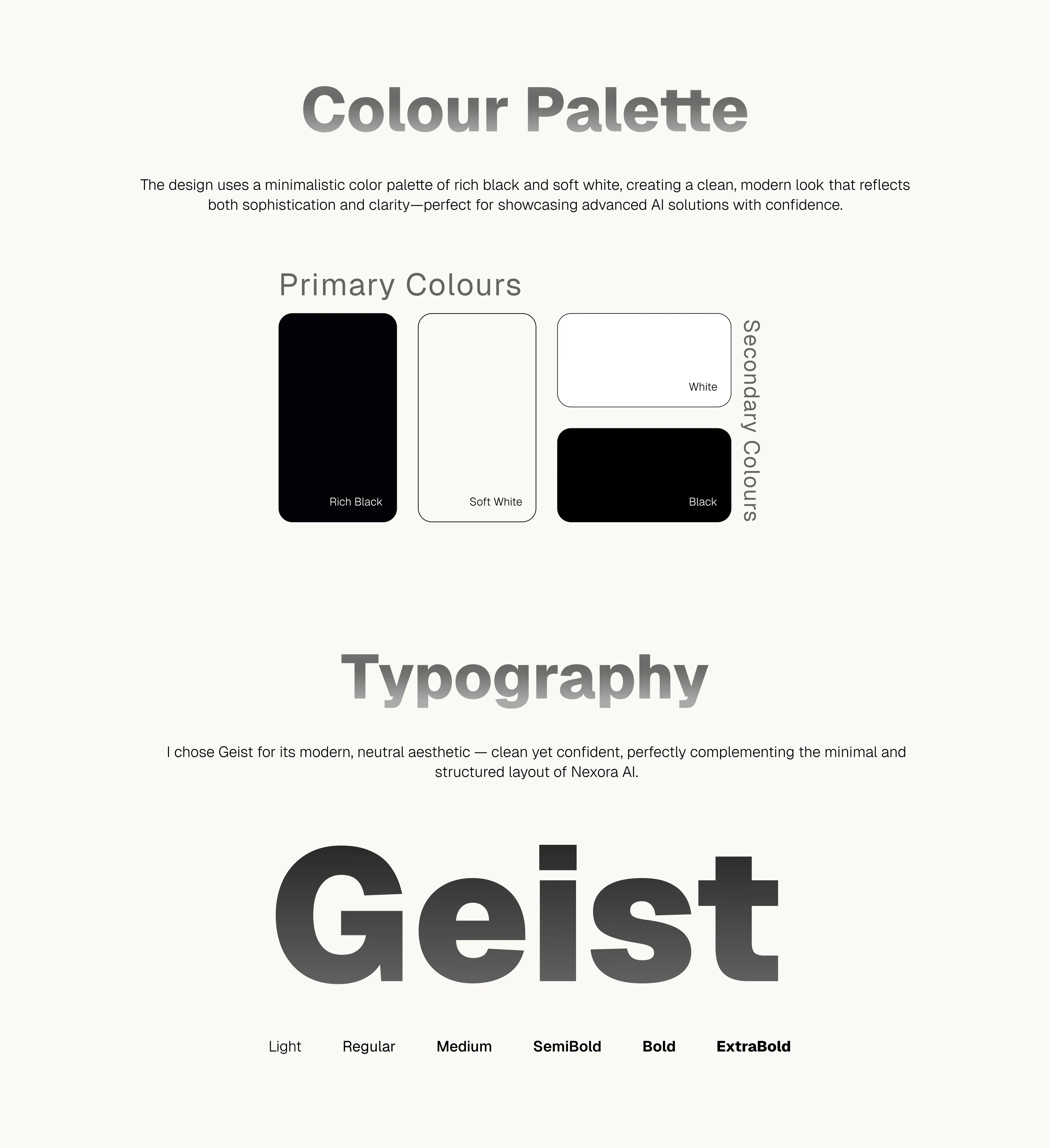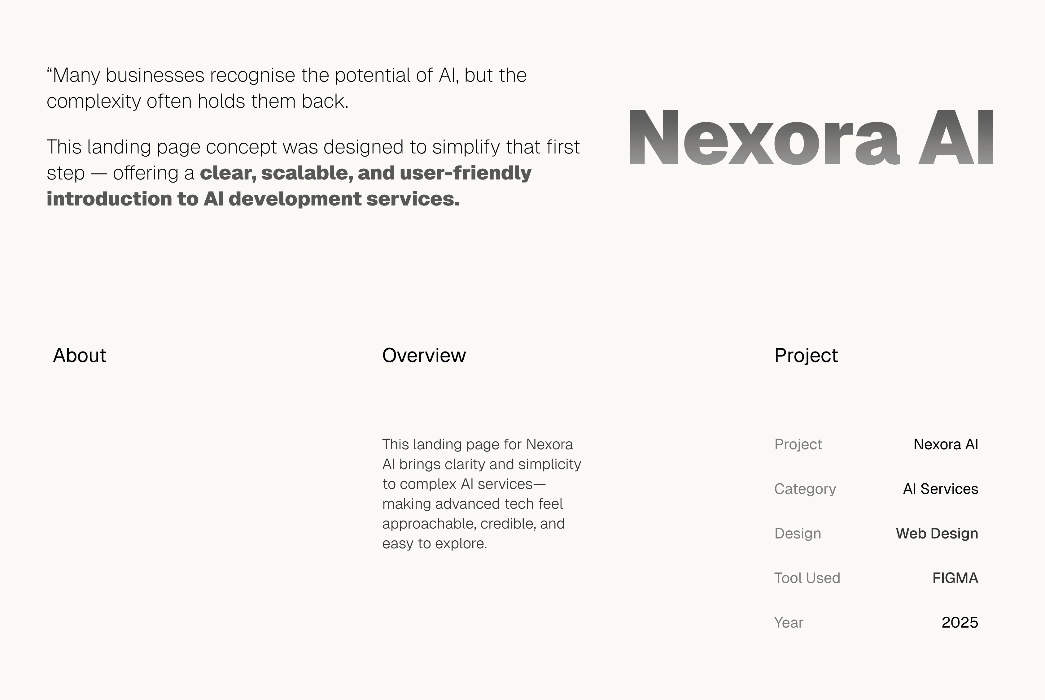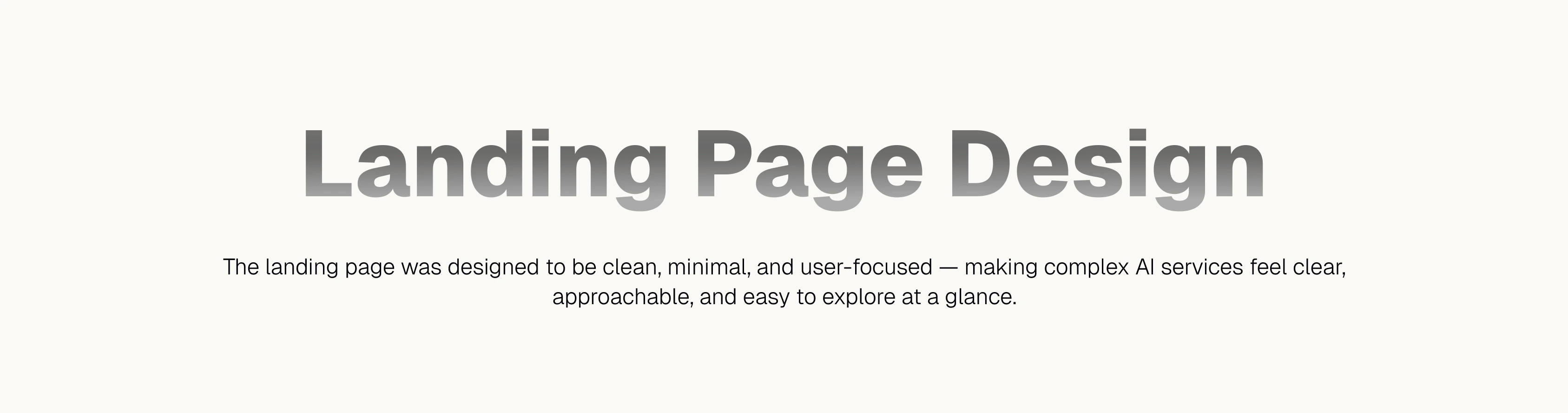 The landing page was designed to be clean, minimal, and user-focused — making complex AI services feel clear, approachable, and easy to explore at a glance.