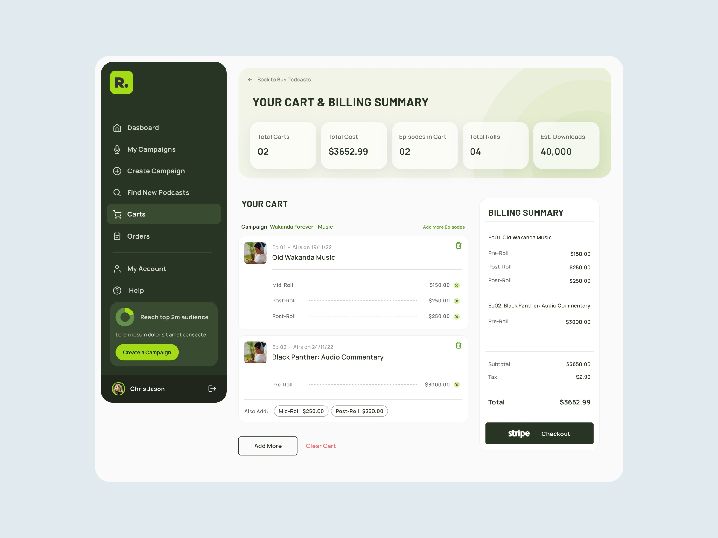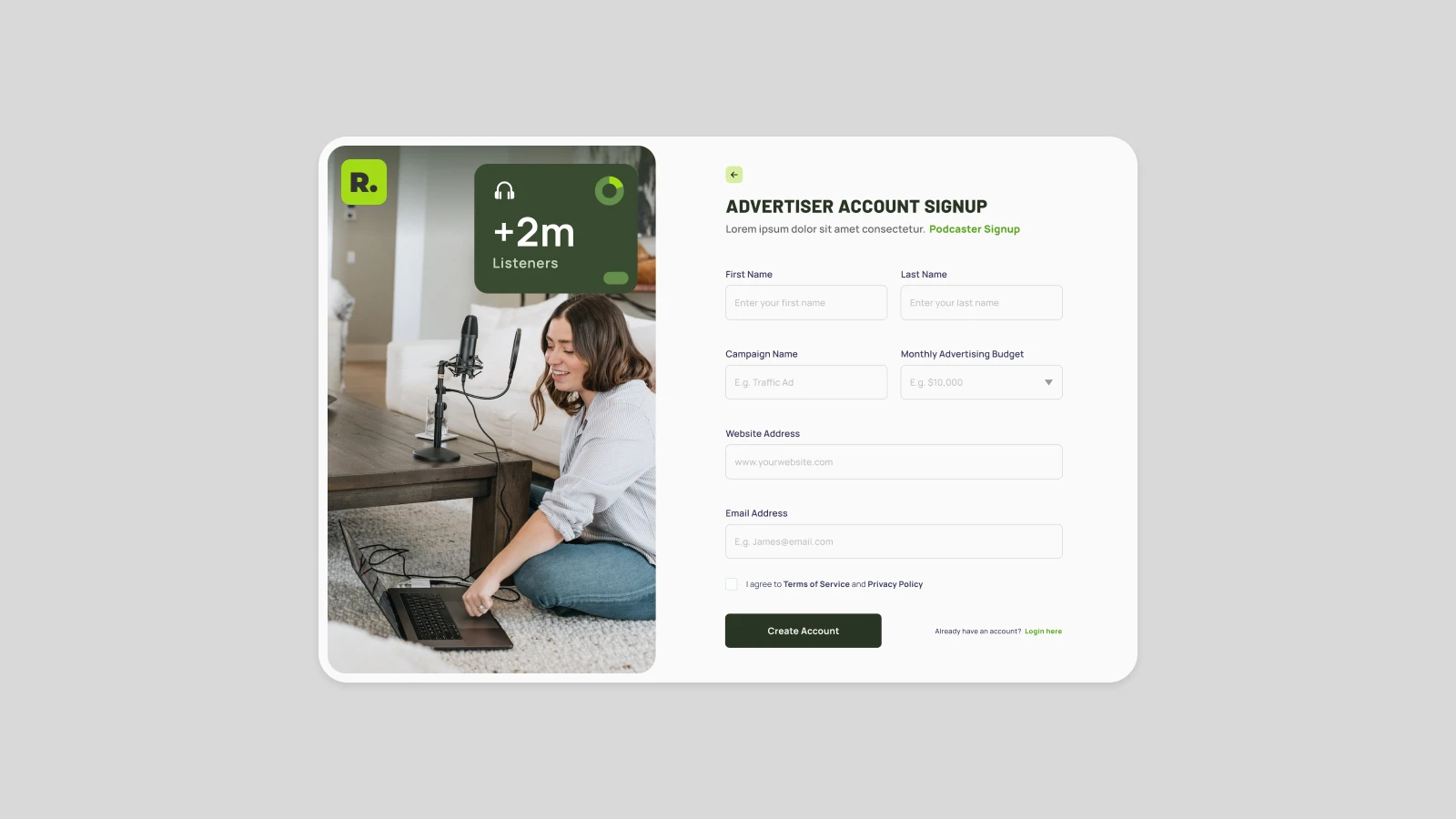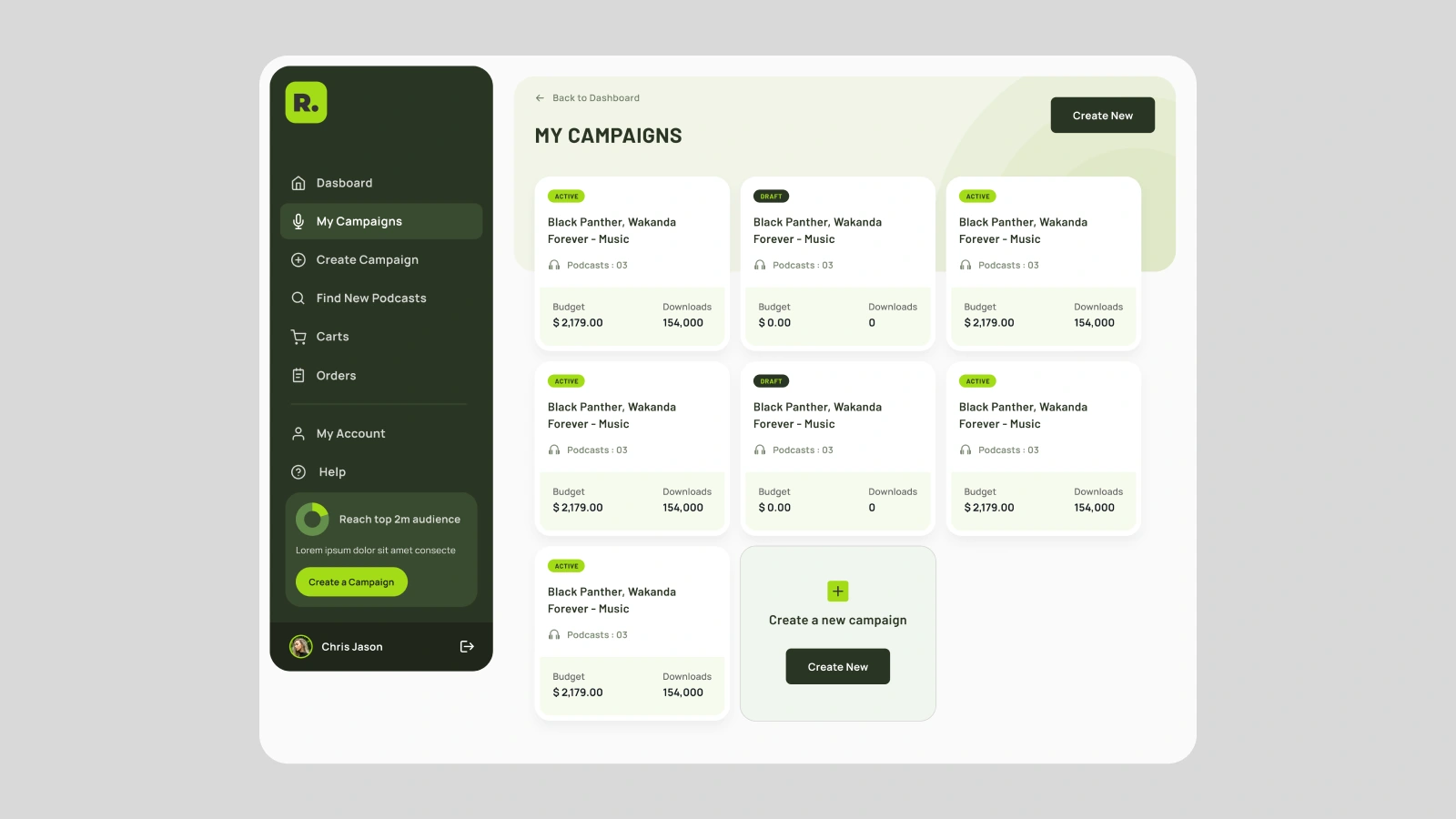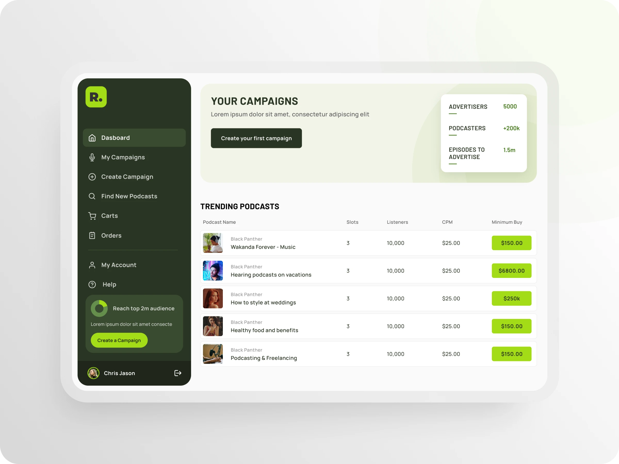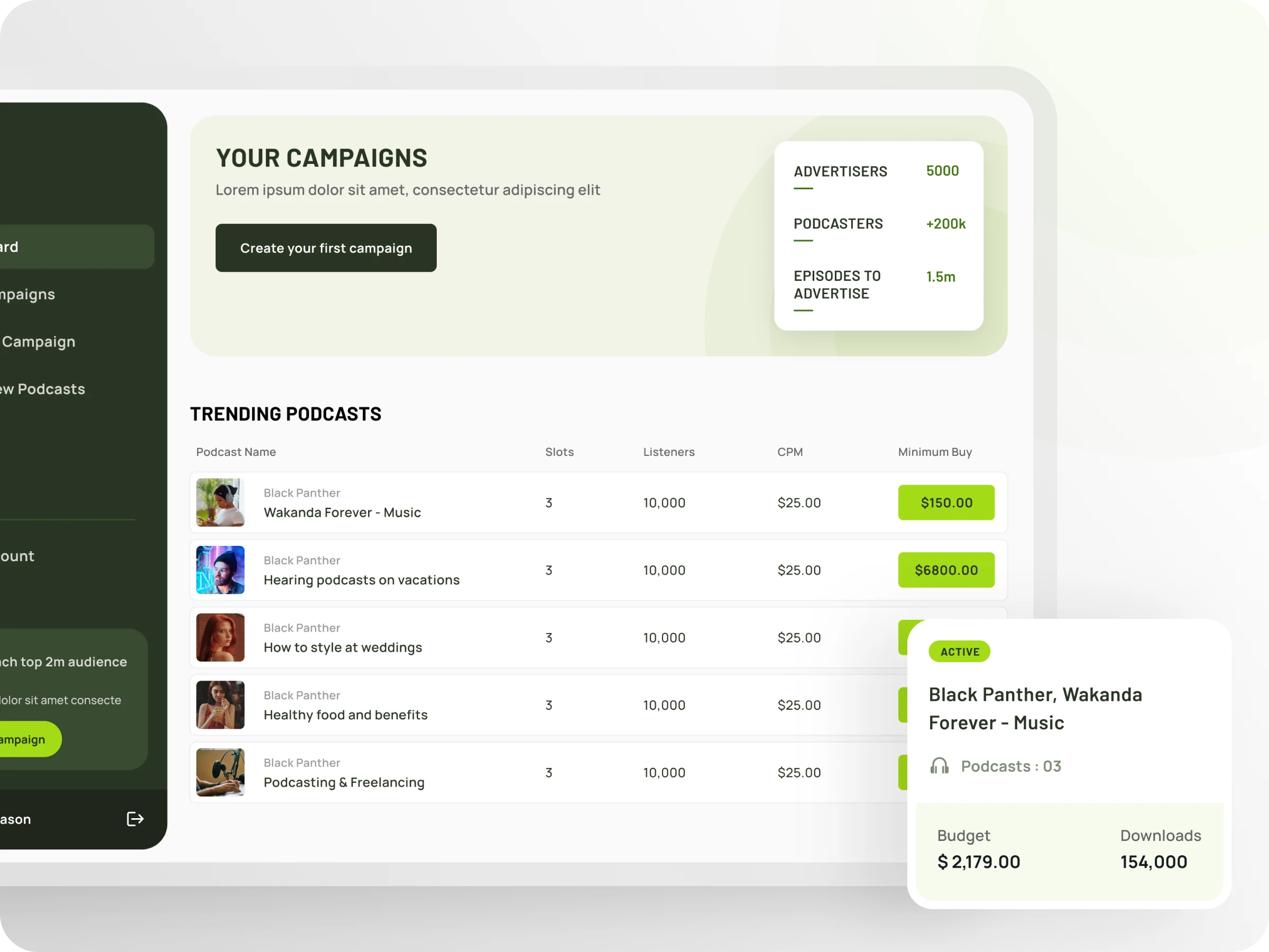 Designed a responsive web app for a podcast ad startup - focused on intuitive UX, clean dashboards, and seamless campaign management flow.