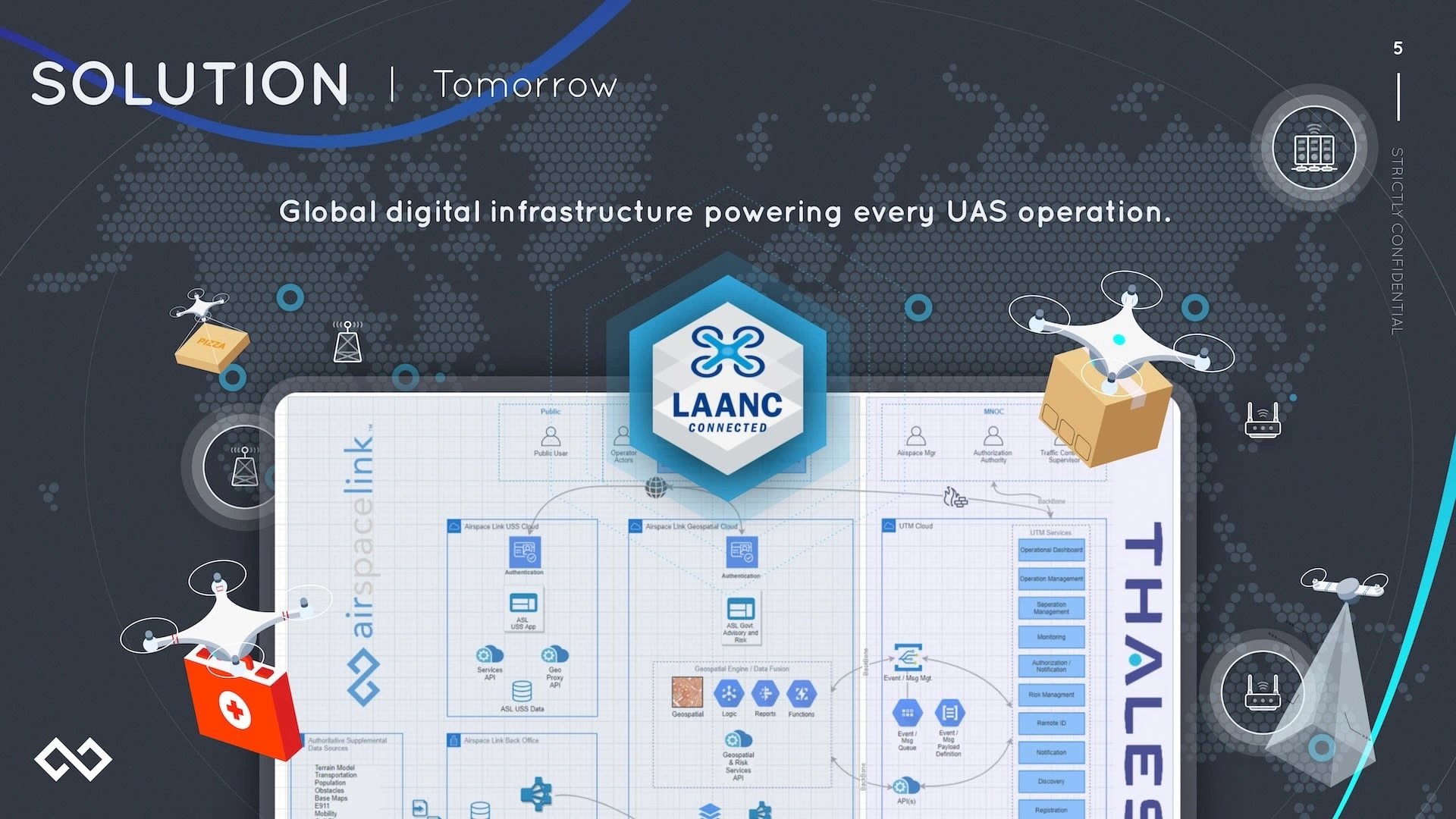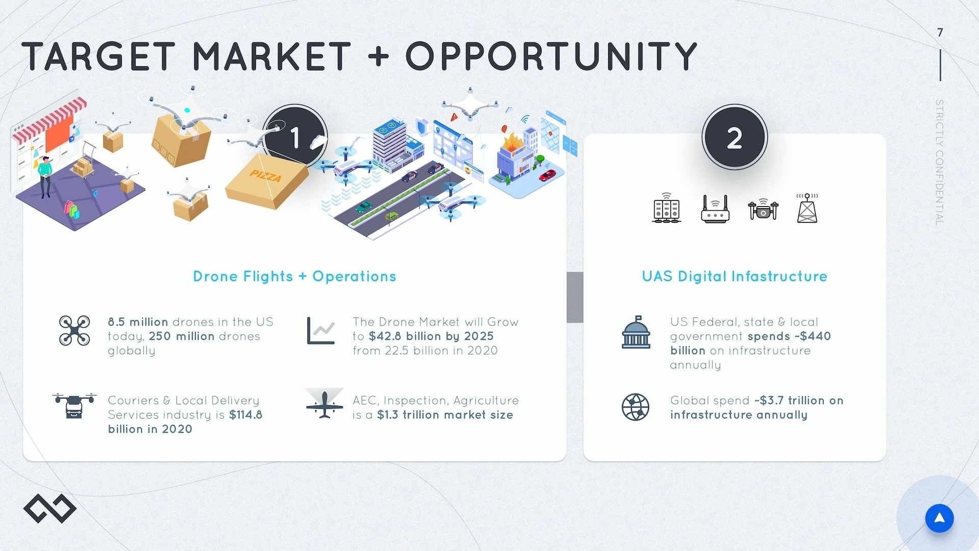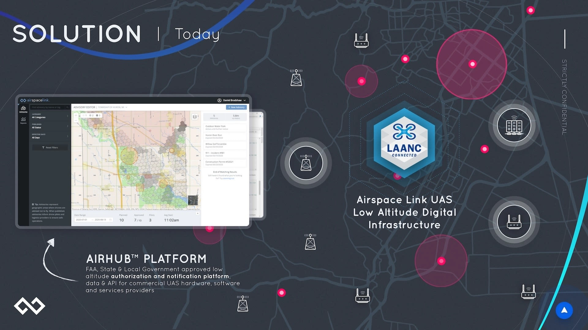 Traction and Validation slide showing 9-month progress: AirHub Version 1.0 launch April 2020, $500k booked revenue, 1 of 5 FAA LAANC approved suppliers, 726 airports integrated, 10 states under contract, 300+ business users, 1000+ pilot users, team growth from 5 to 14, plus six go-to-market partner logos including Esri, FedEx, UPS, Amazon Prime Air, Uber Eats, and Walmart