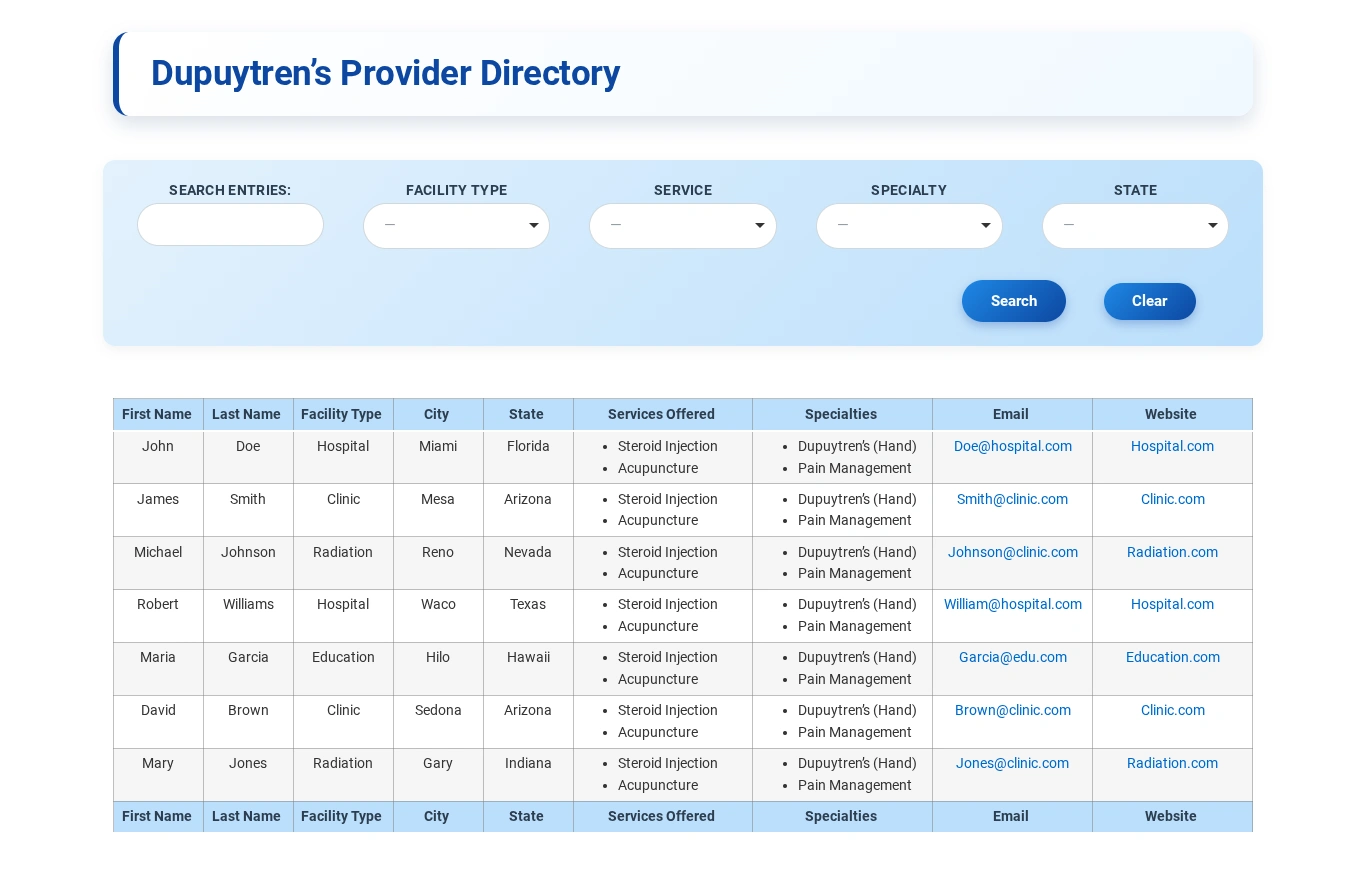 This directory was developed for a healthcare organization that needed a reliable and structured system to list and manage providers specializing in Dupuytren’s condition. The client wanted users to easily find qualified providers based on location and expertise while ensuring the information was presented in a clear and professional format. The goal was to improve accessibility, build trust and streamline provider discovery for patients seeking specialized care.