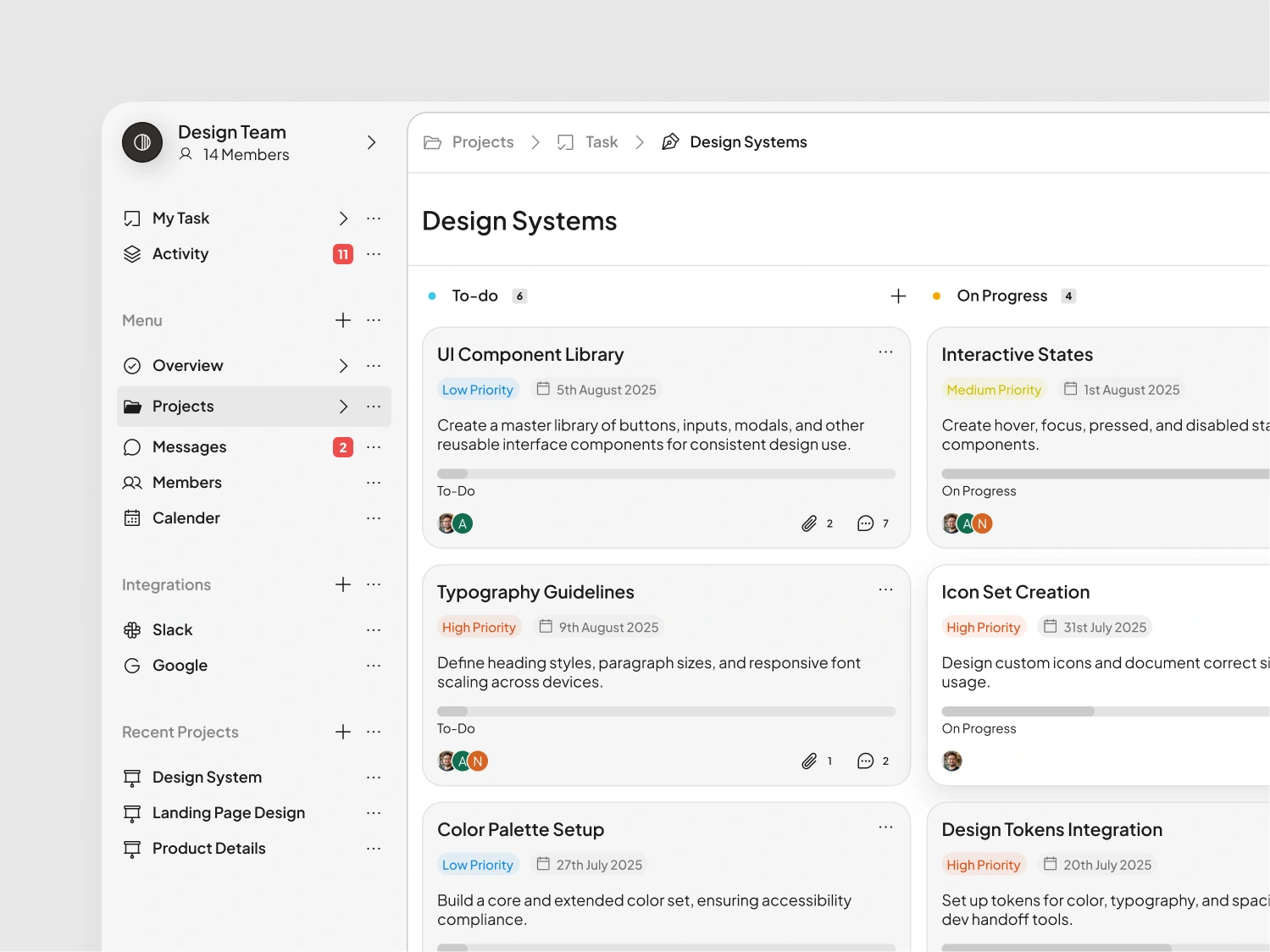 A clean and modern task management dashboard designed for collaborative teams. Built around the “Design Systems” project, this layout makes it easy to track priorities, progress, and upcoming deadlines while keeping communication at the center.