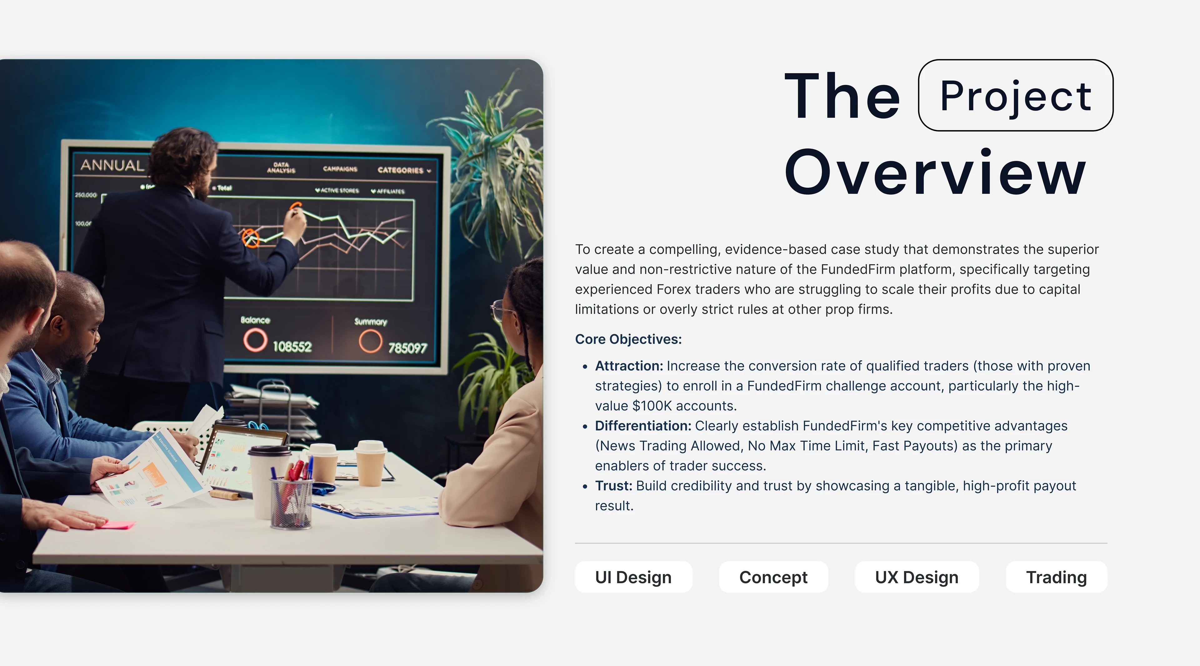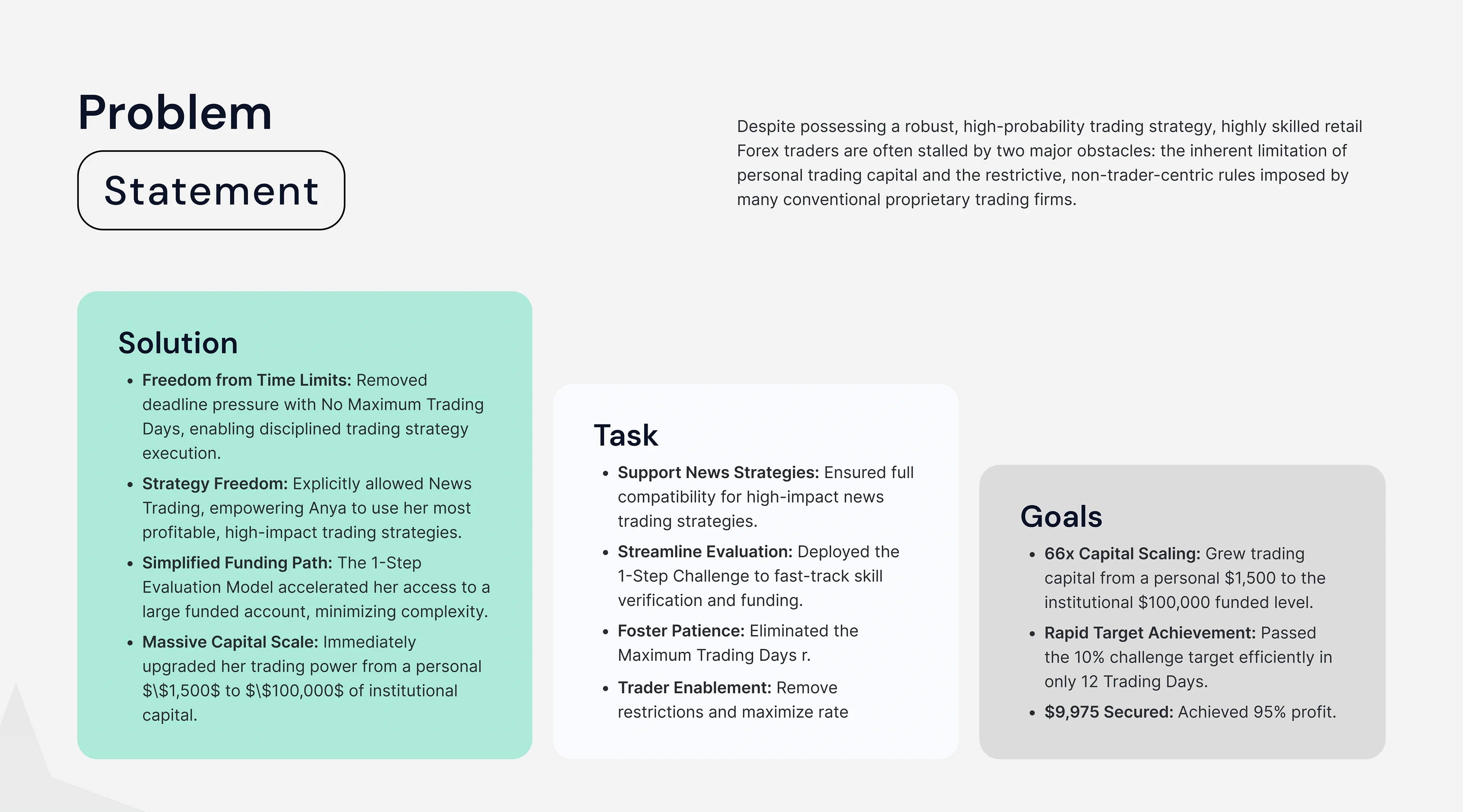 To create a compelling, evidence-based case study that demonstrates the superior value and non-restrictive nature of the FundedFirm platform, specifically targeting experienced Forex traders who are struggling to scale their profits due to capital limitations or overly strict rules at other prop firms.