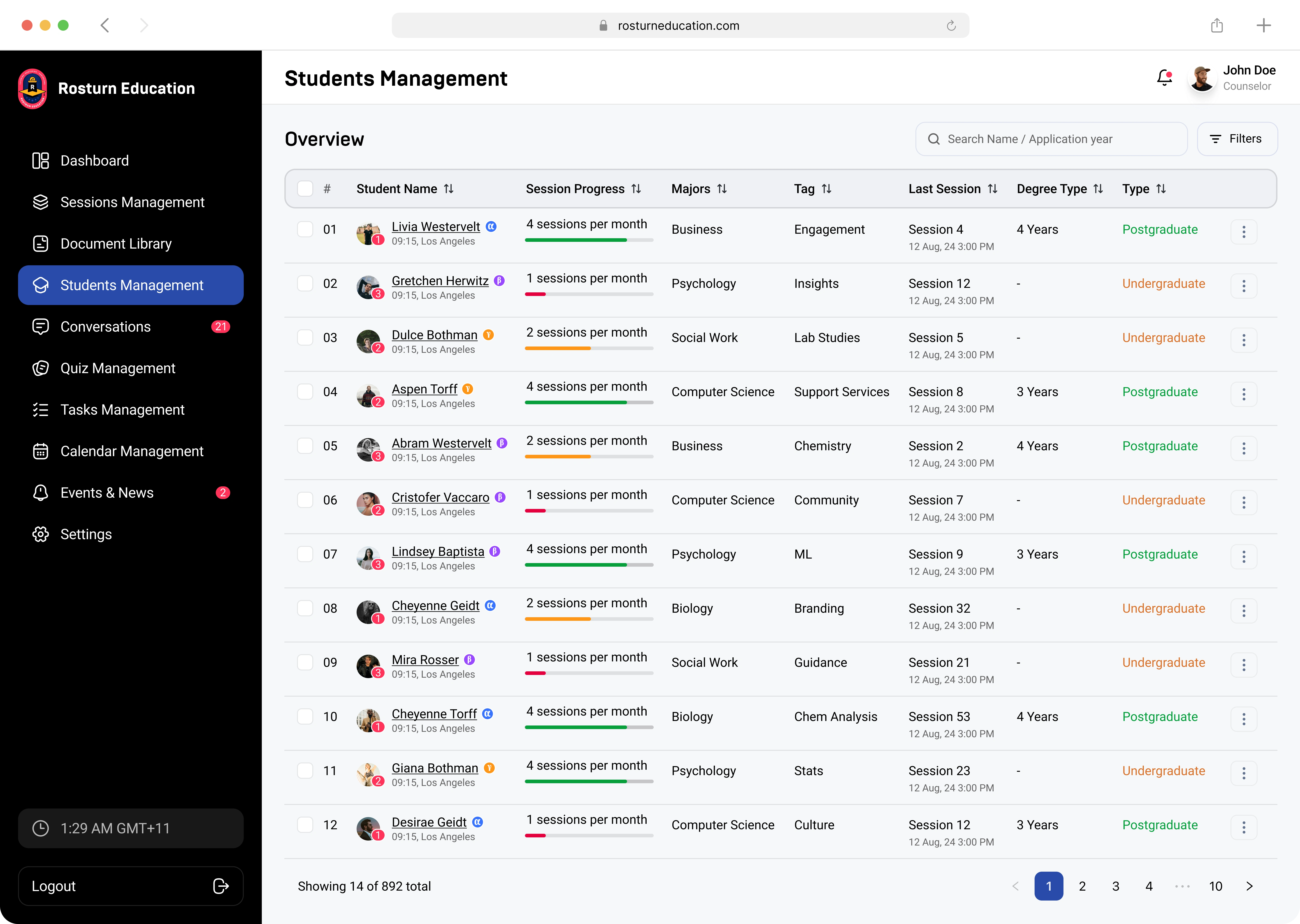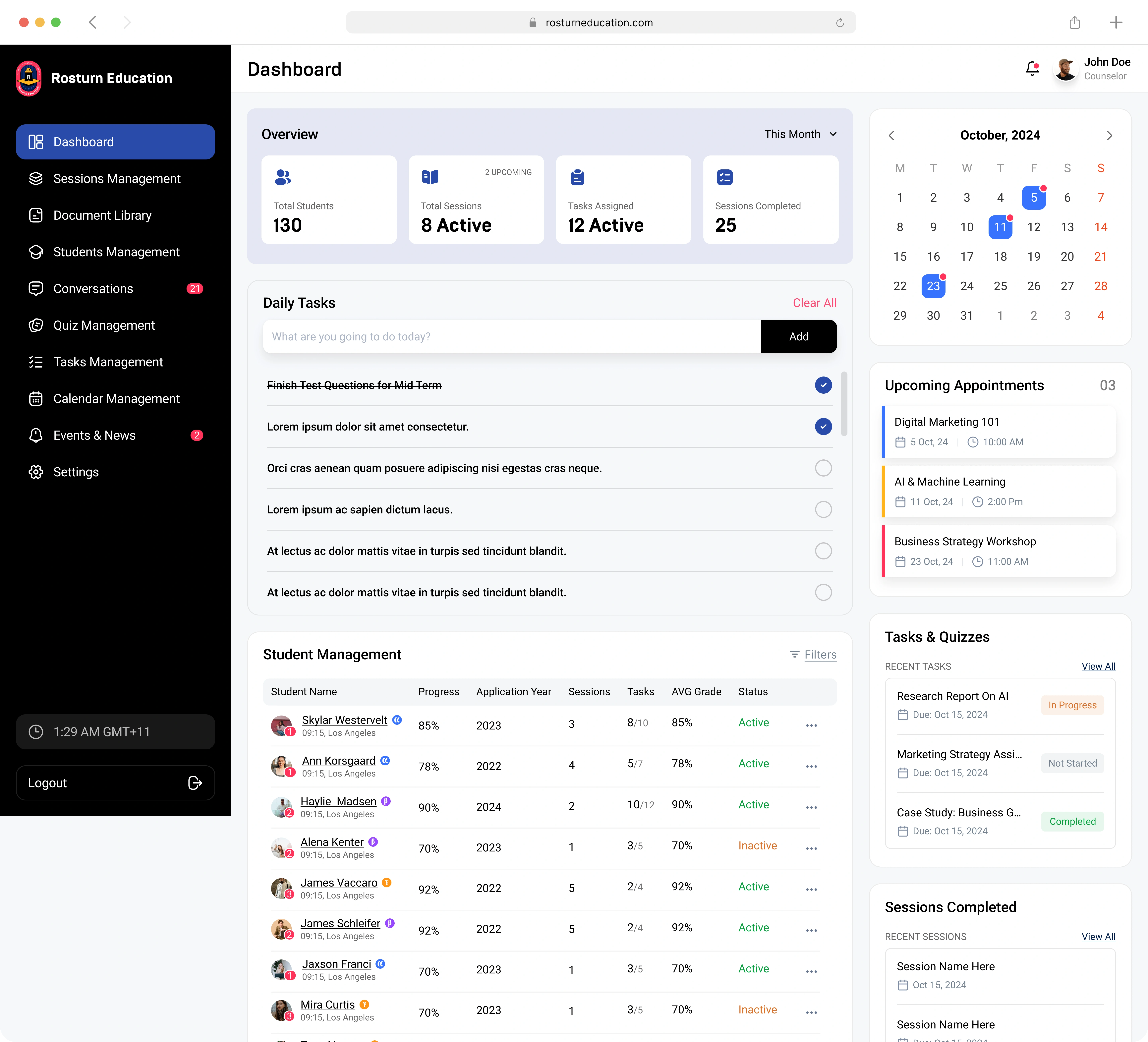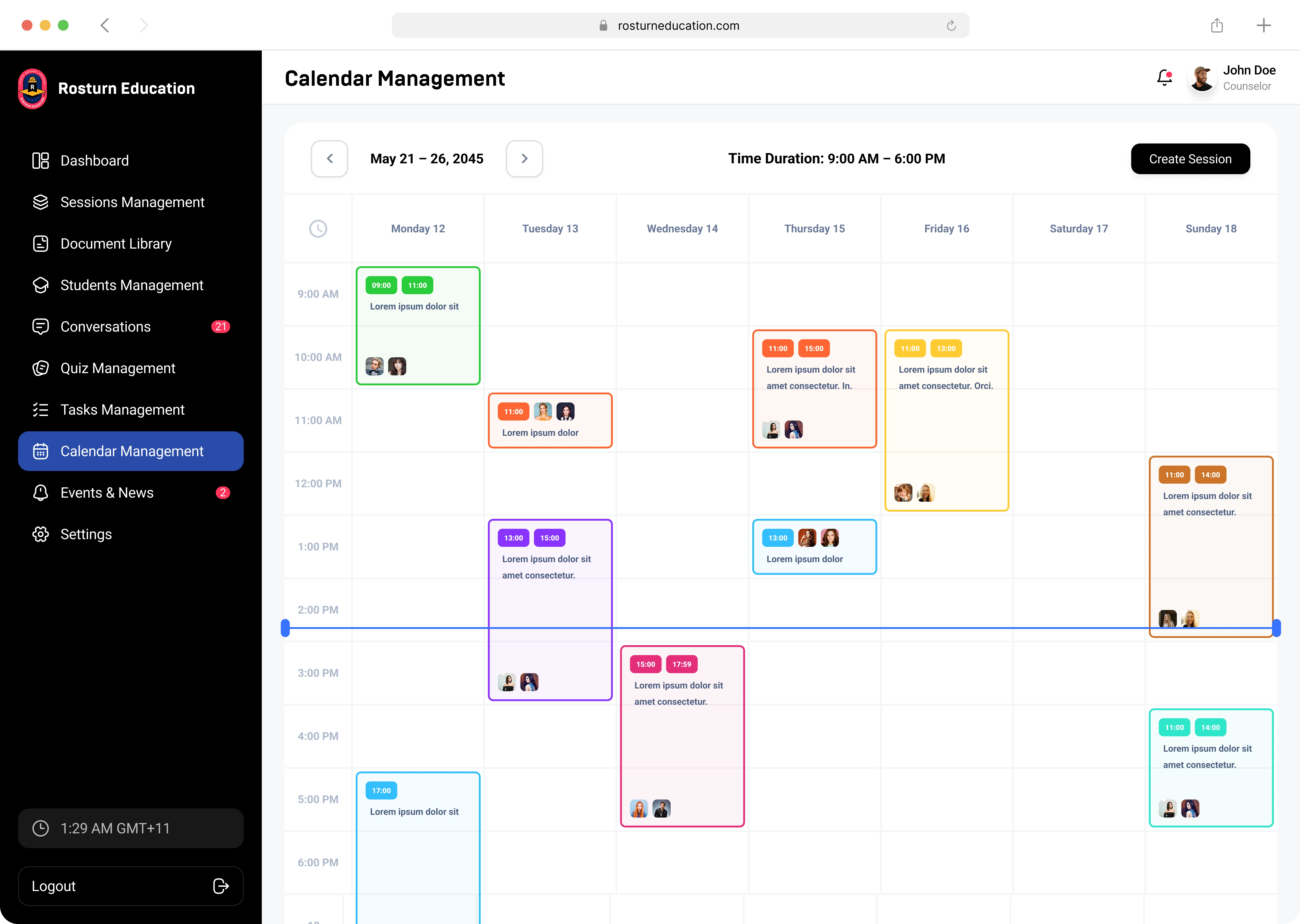 1. Session Management ( meetings ), Task Management, Quiz Management, Document Management, Chat, Calendar Management, Event & New Management, Survey Management