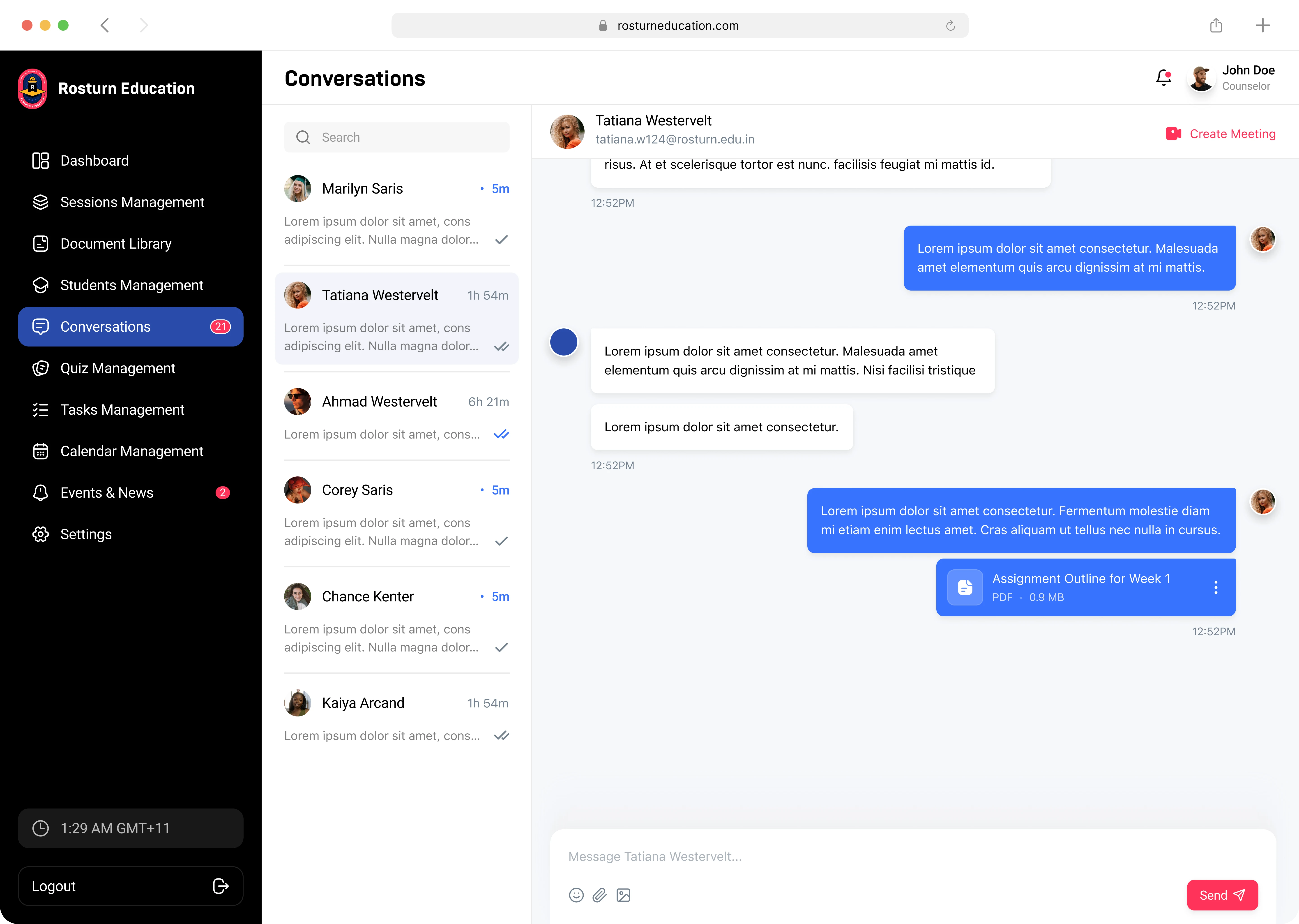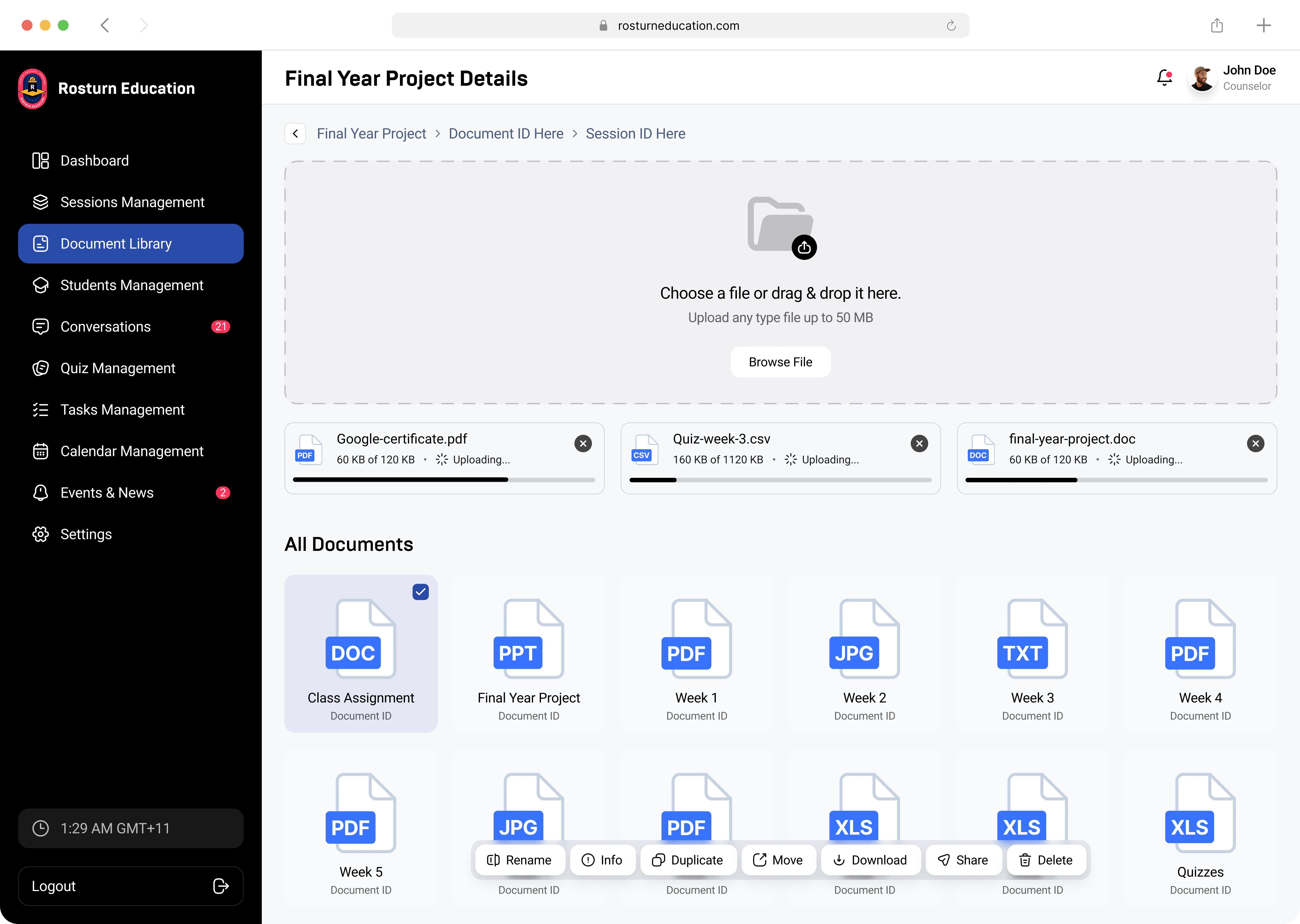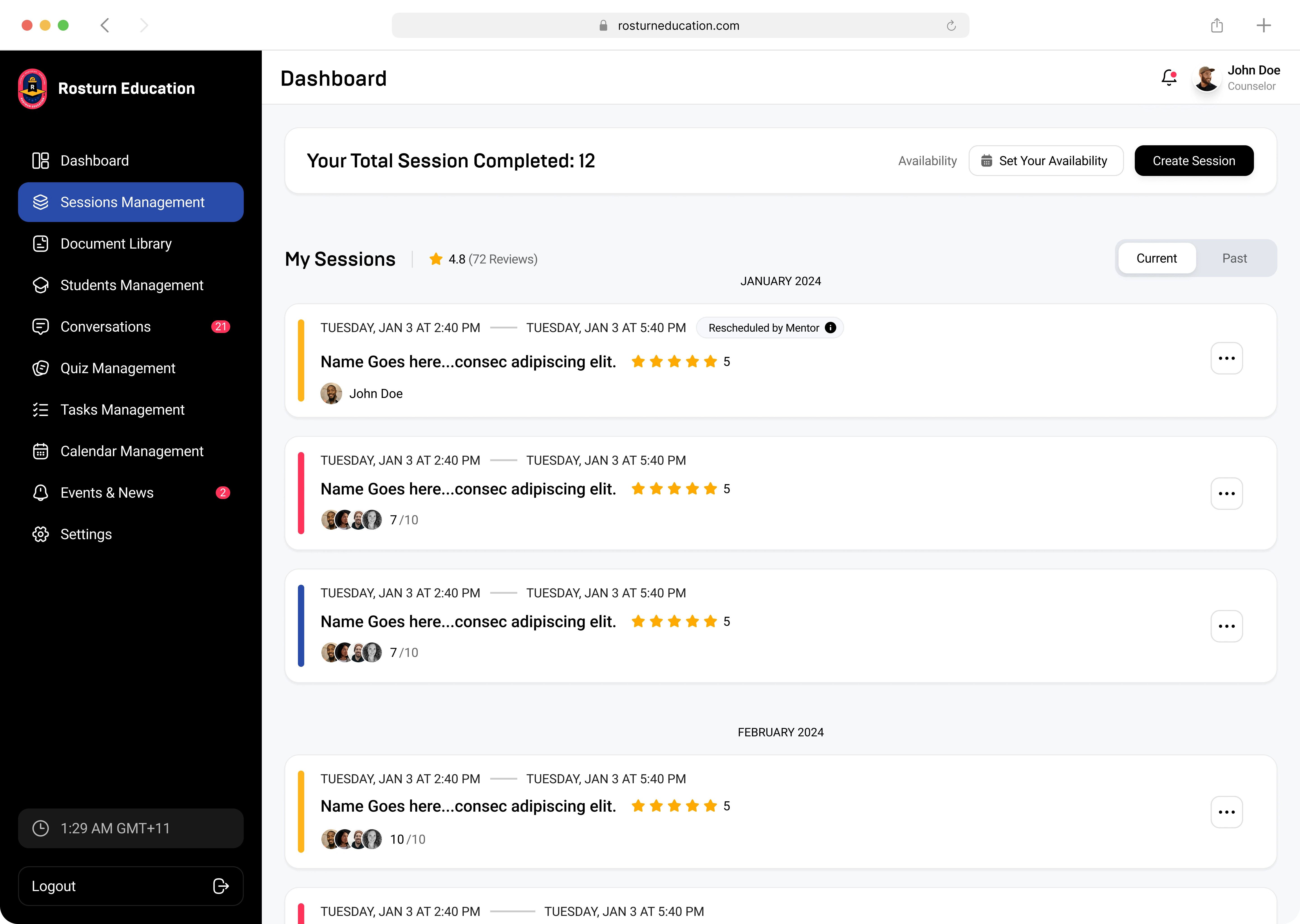 1. Session Management ( meetings ), Task Management, Quiz Management, Document Management, Chat, Calendar Management, Event & New Management, Survey Management