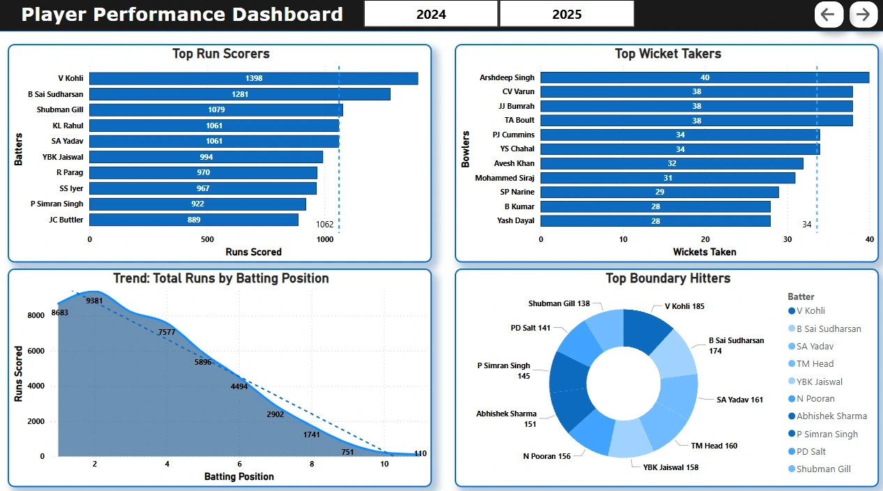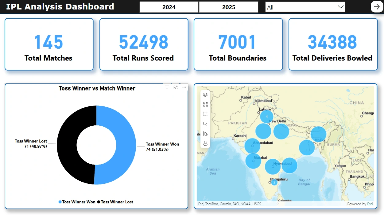 ipl_filtered_24_25.csv β Ball-by-ball data for the 2024β25 seasons onlyipl_player_stats_24_25.csv β Simplified version to track batter/bowler/wicket actionsipl_summary_24_25.csv β Match-level summary (toss winner, result, player of match)IPLsql.sqlIPL_Analysis.ipynb