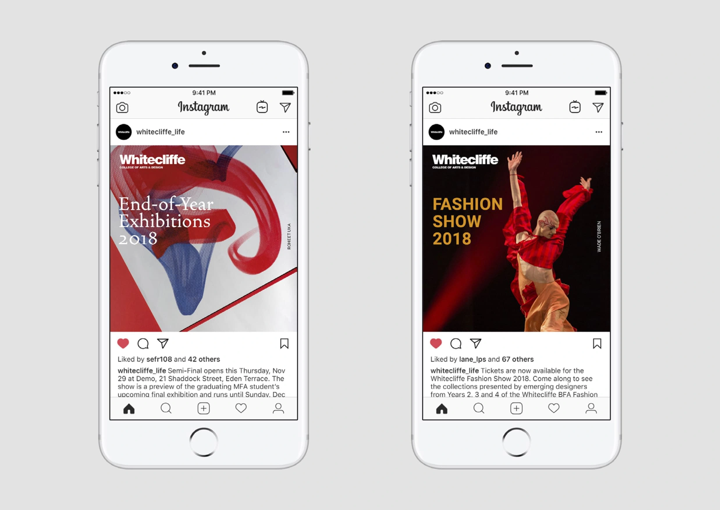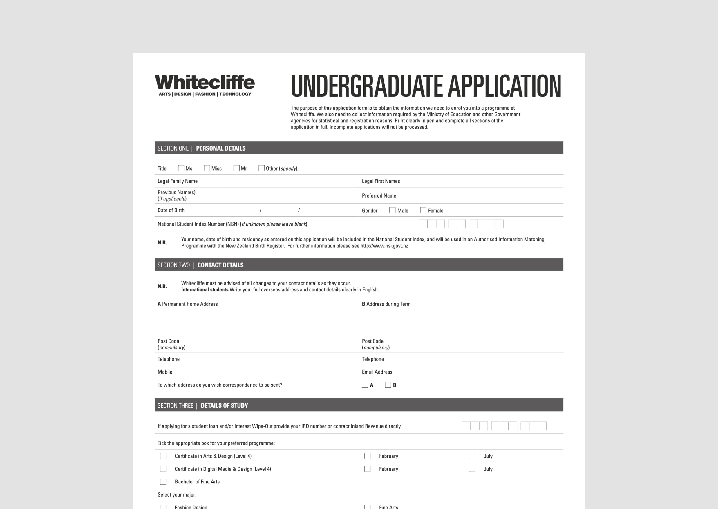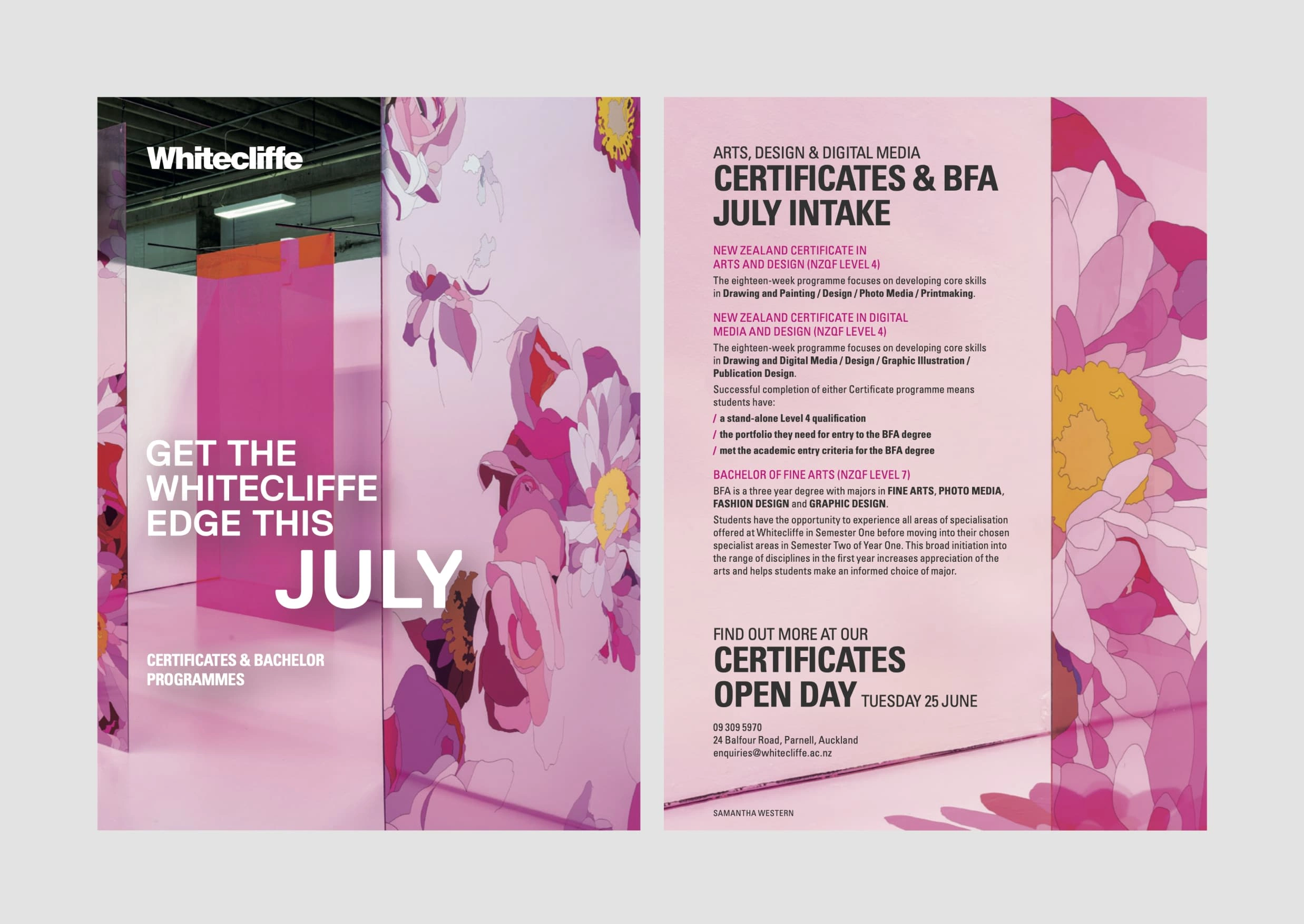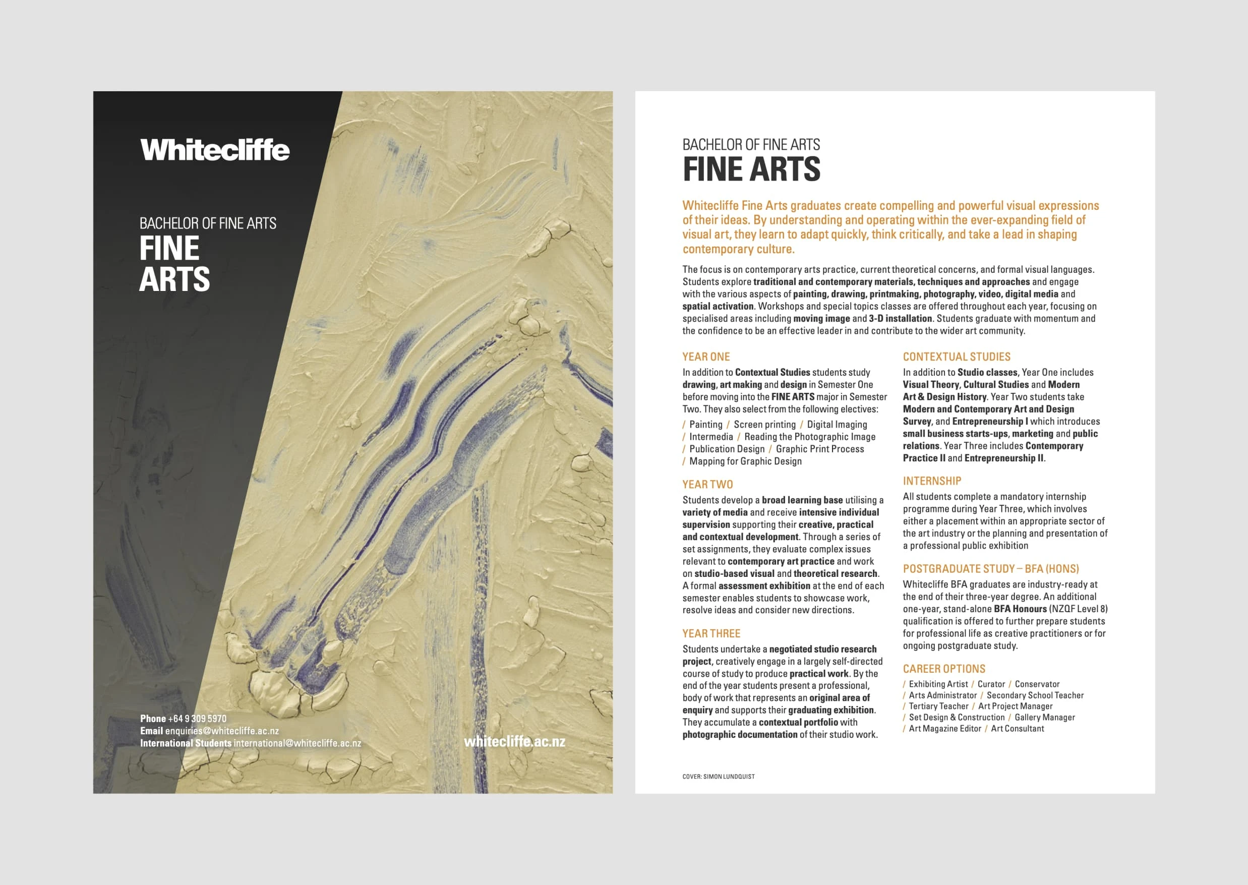 Managed brand and signage, designed campaign collaterals for Whitecliffe College of Arts & design.
