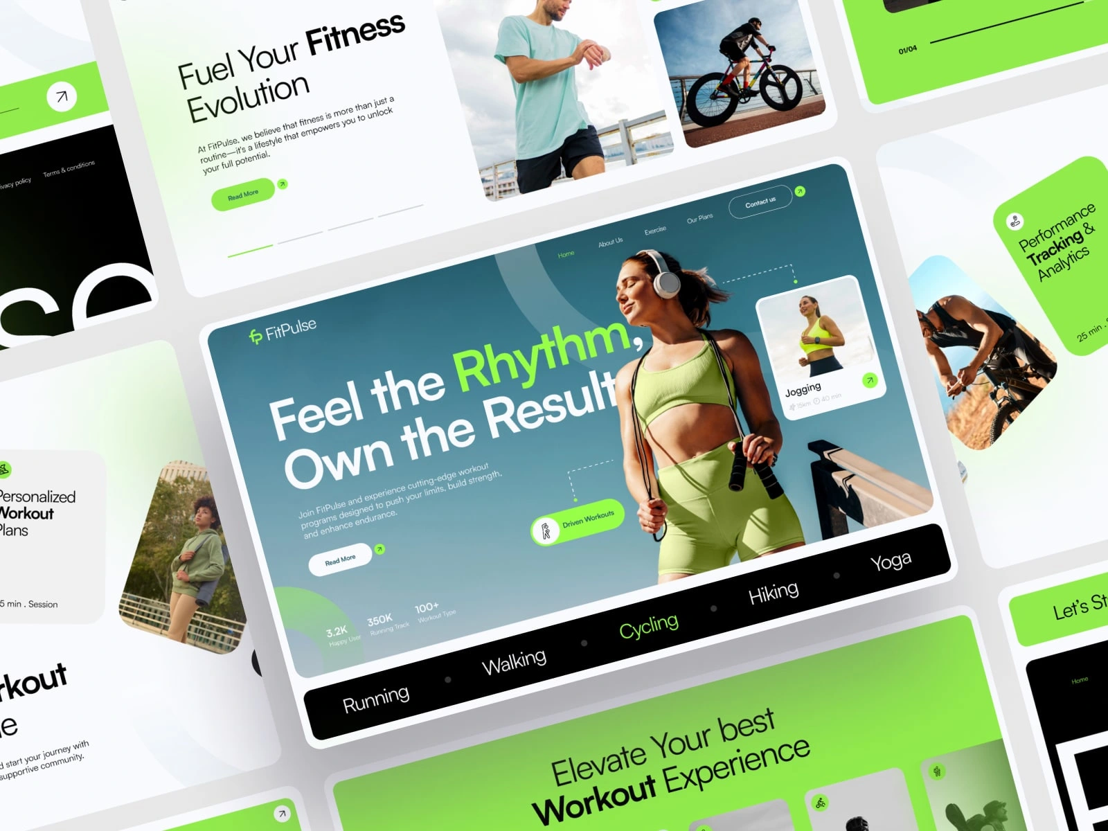 Design Style: Modern, energetic, and user-focused with bold typography, vibrant accents, and clean layouts. The design blends lifestyle visuals with structured UI to create a motivating and premium fitness experience.
