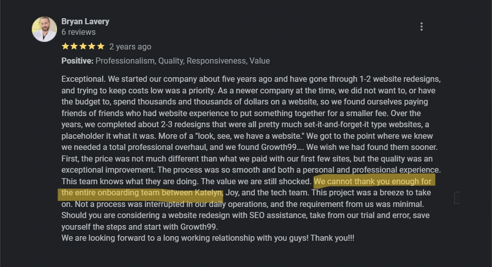 5 star Google review for web build and project management