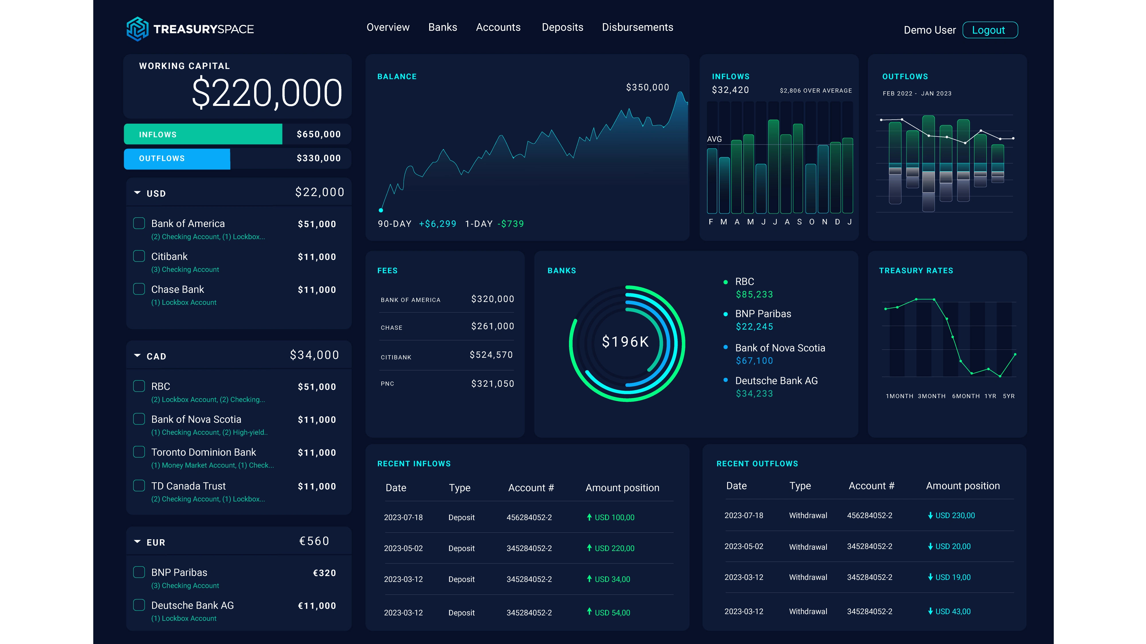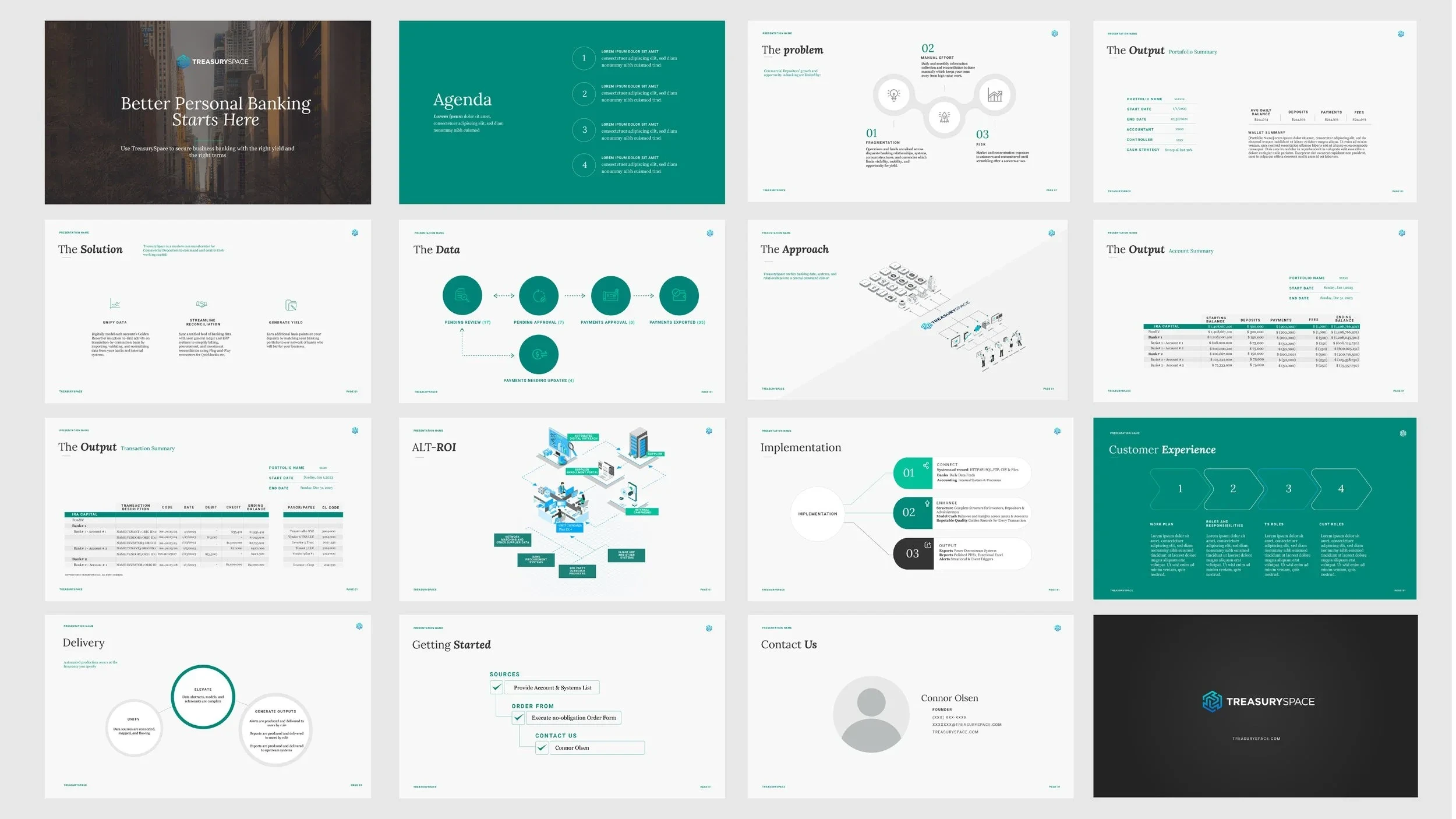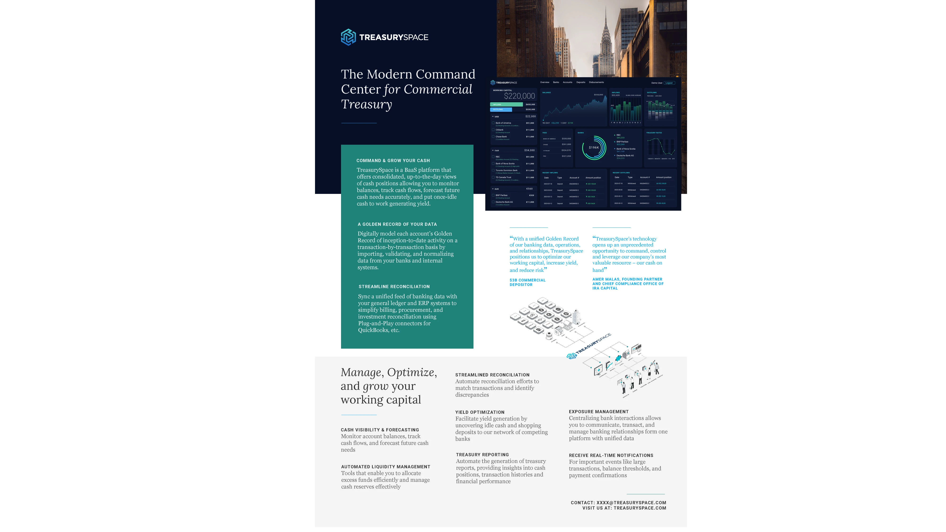 The founder had established a precise, minimalist visual language and required strict adherence to brand guidelines. Working within these constraints, I developed a pitch deck presentation, custom infographics illustrating complex financial workflows, a one-pager sales tool, and a dashboard UI prototype for their product vision. Each deliverable maintained TreasurySpace's clean aesthetic—navy backgrounds, teal accents, generous whitespace, while solving distinct business communication needs. The result expanded their visual toolkit without compromising their carefully crafted brand identity.