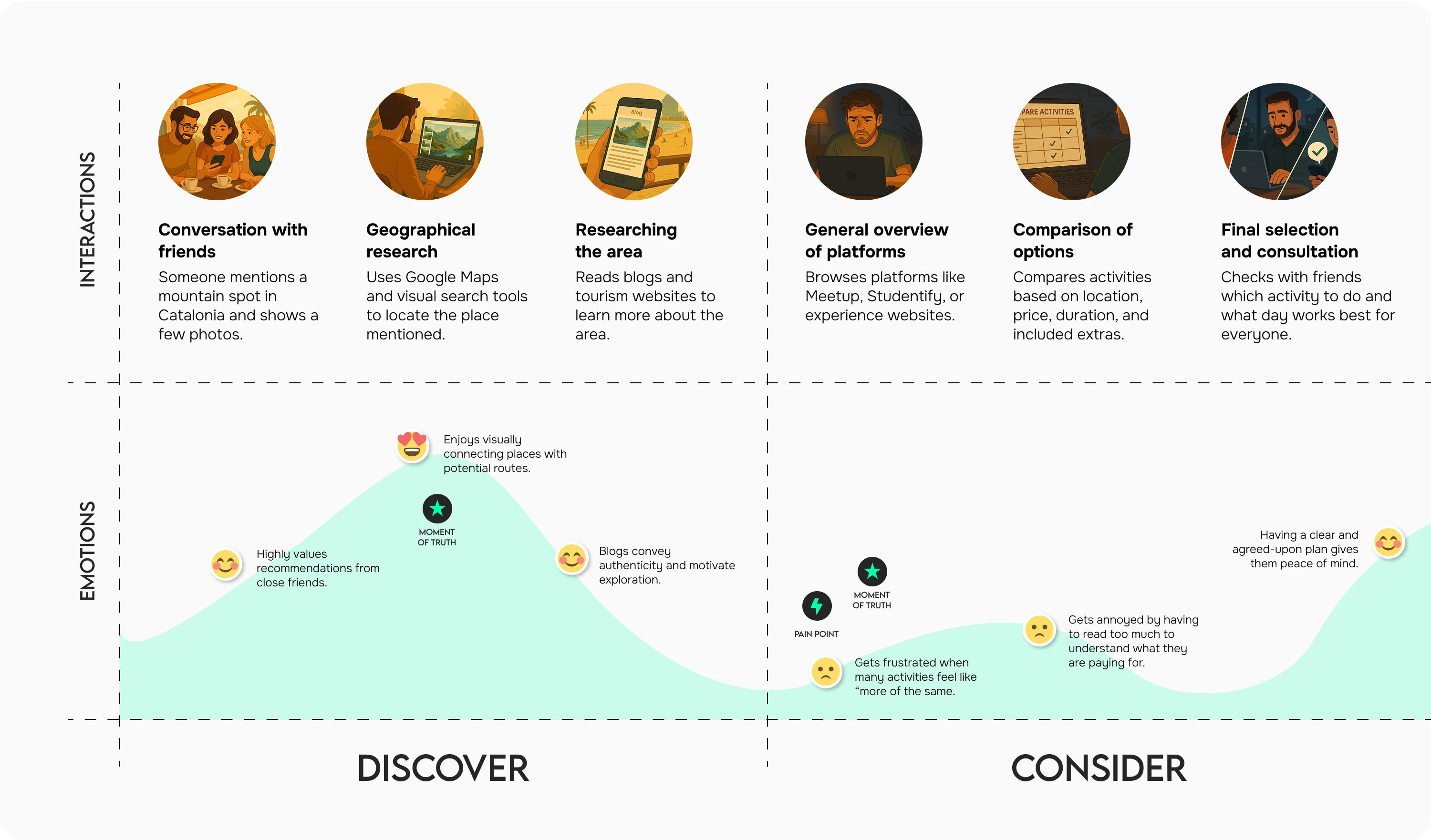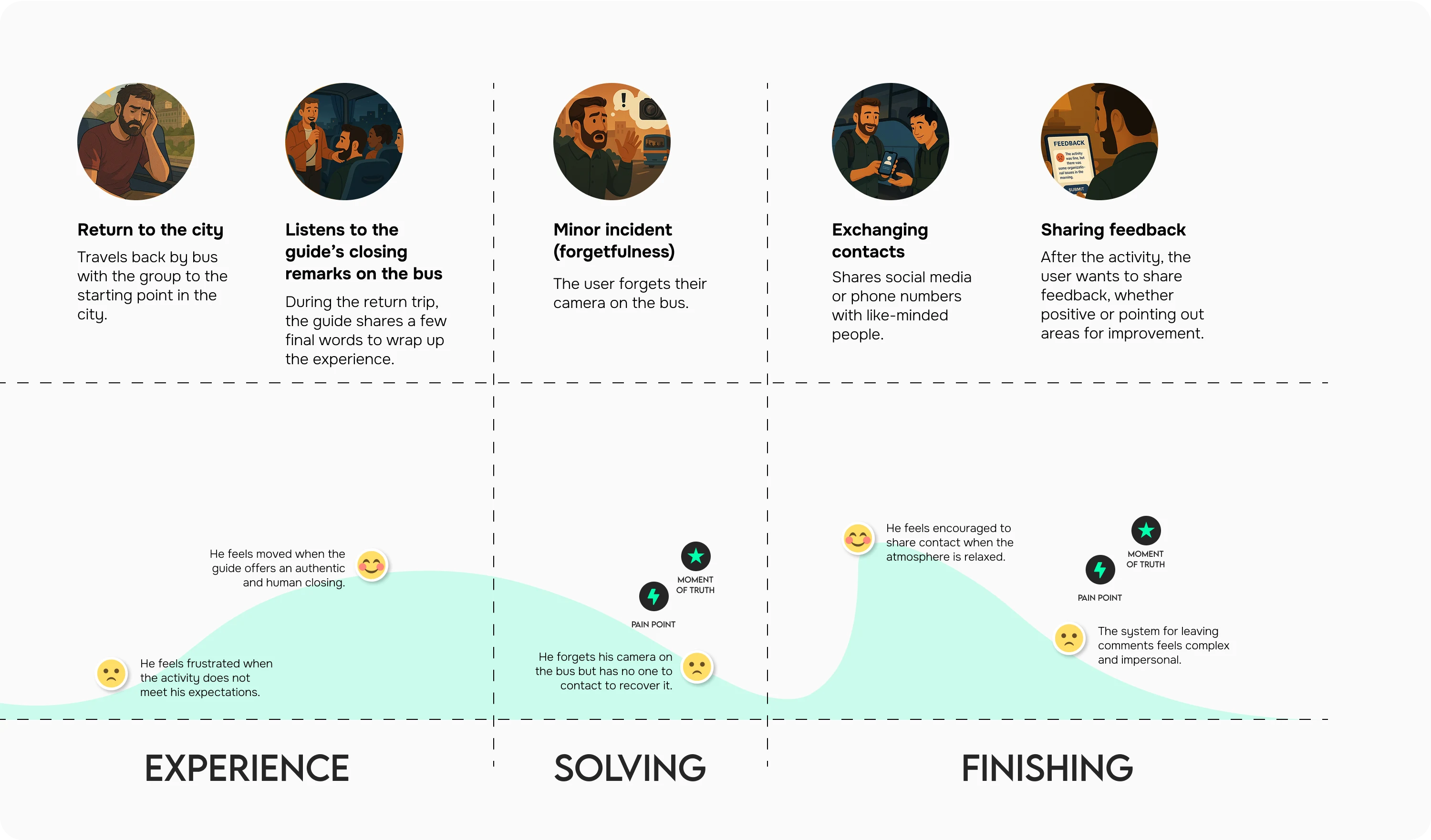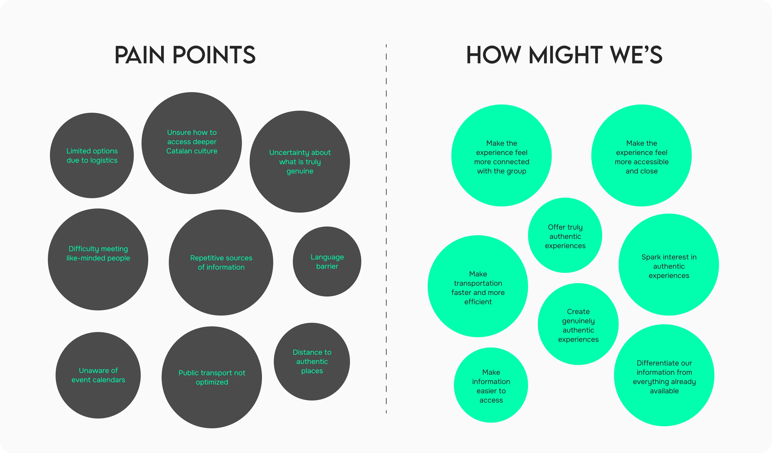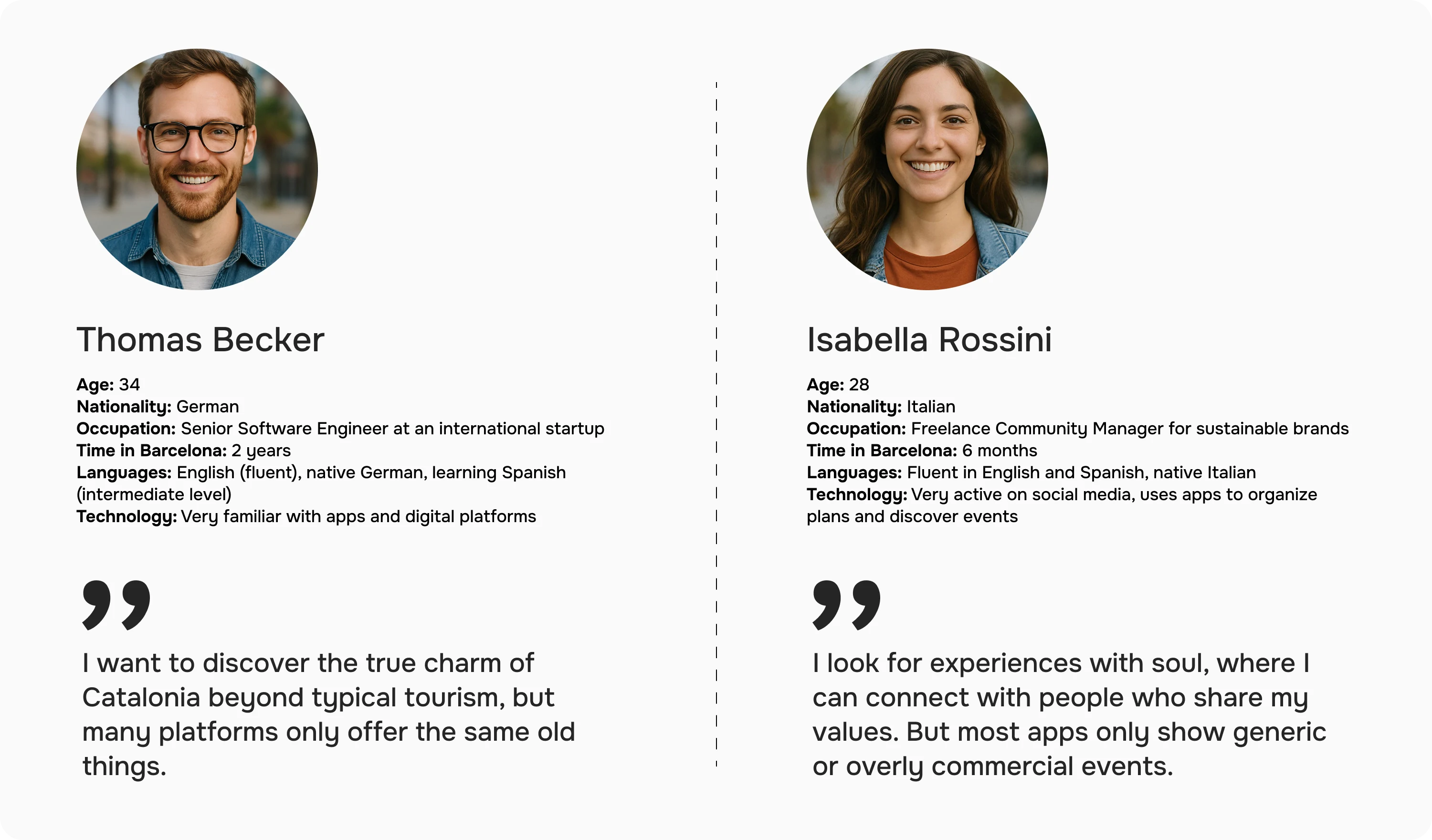 In this phase, I analyzed all qualitative data collected from interviews, surveys and observations to identify key user motivations and pain points. Through the affinity mapping process, we uncovered five behavioral patterns, and later identified strong correlations between them. These connections revealed two main user groups: Advanced Expats, who seek high-quality experiences and enjoy exploring local culture in depth, and Social Explorers, who seek shared experiences and human connection. These insights guided the design opportunities for each profile.