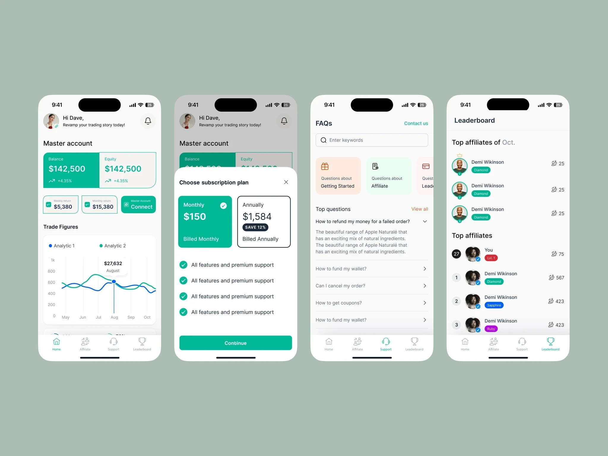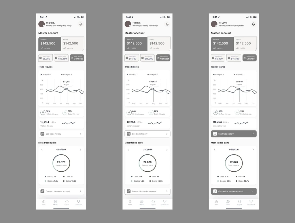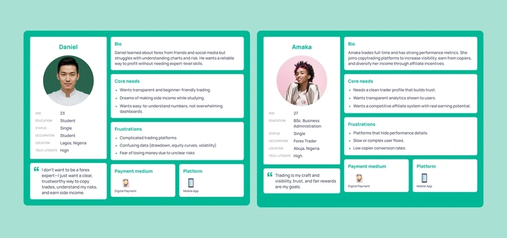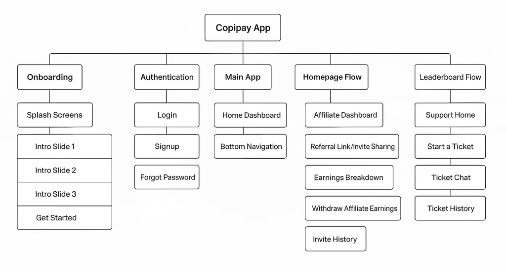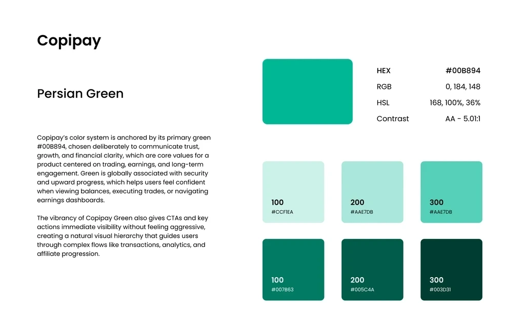 Copipay’s color system is anchored by its primary green #00B894, chosen deliberately to communicate trust, growth, and financial clarity, which are core values for a product centered on trading, earnings, and long-term engagement. Green is globally associated with security and upward progress, which helps users feel confident when viewing balances, executing trades, or navigating earnings dashboards. The vibrancy of Copipay Green also gives CTAs and key actions immediate visibility without feeling aggressive, creating a natural visual hierarchy that guides users through complex flows like transactions, analytics, and affiliate progression. Supporting neutrals (charcoal, grays, and soft accents) ensure that screens remain clean and focused, giving the interface room to breathe while making data-heavy sections easier to digest. Overall, the palette reinforces a sense of transparency, momentum, and reliability—exactly what users need in a fintech environment.