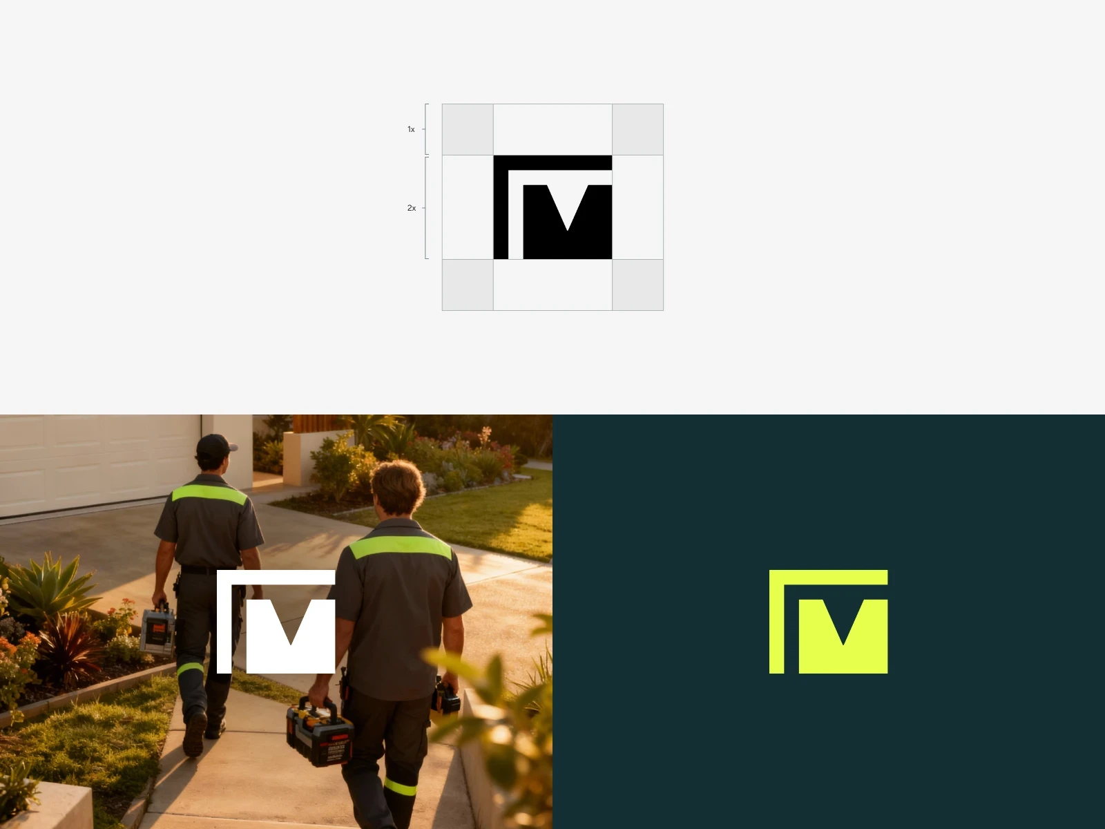 Logo system: a modern wordmark and modular "M" submark that subtly integrates the garage form - clean, structured and scalable across digital and physical touchpoints;