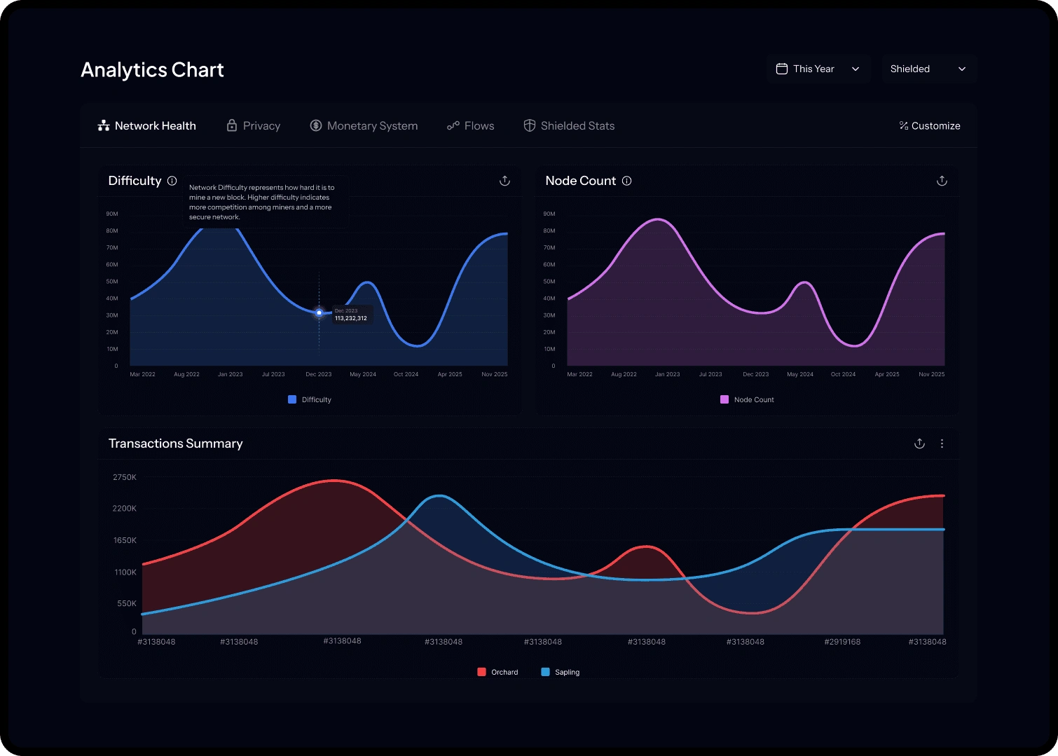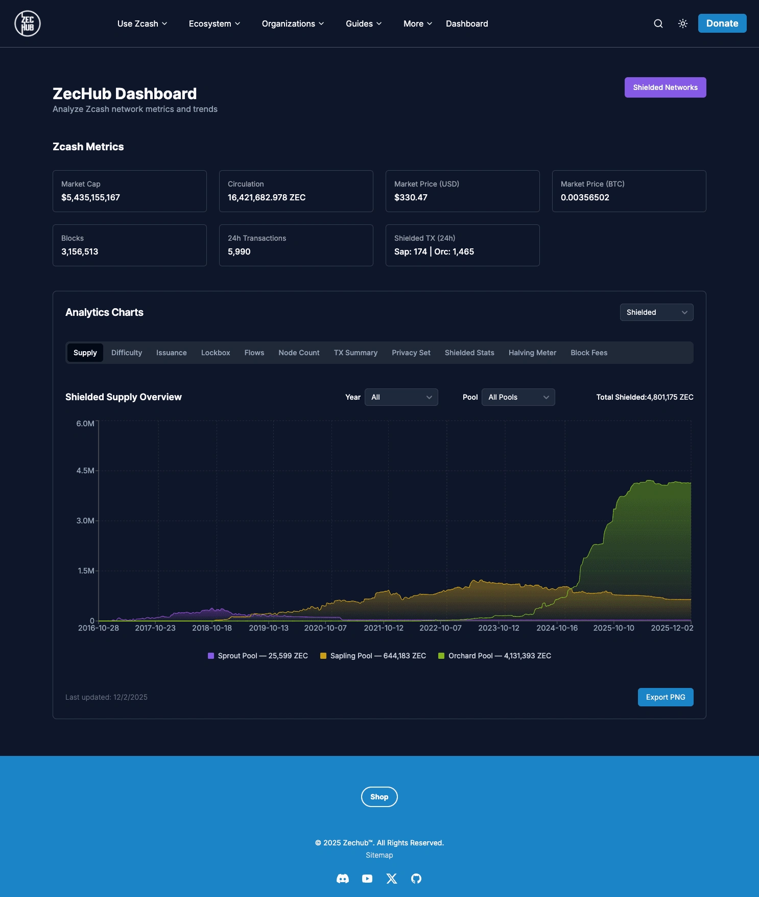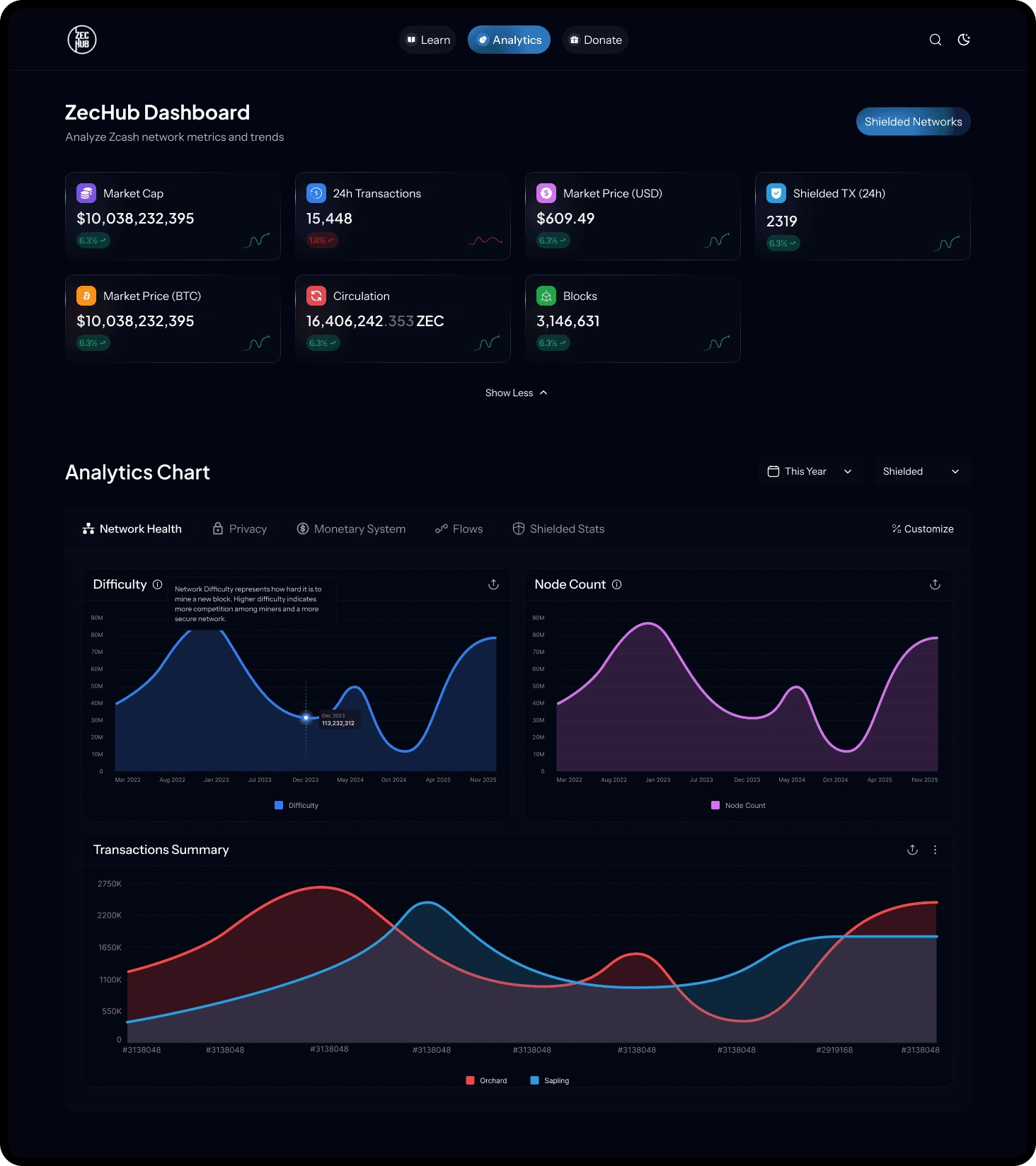 The ZecHub Dashboard serves as the central information hub for the Zcash community, connecting users to network health, governance, and ecosystem activity. The existing dashboard suffered from information overload and an outdated presentation, hindering its effectiveness in supporting ZecHub's mission of building community, education, and investment tracking.