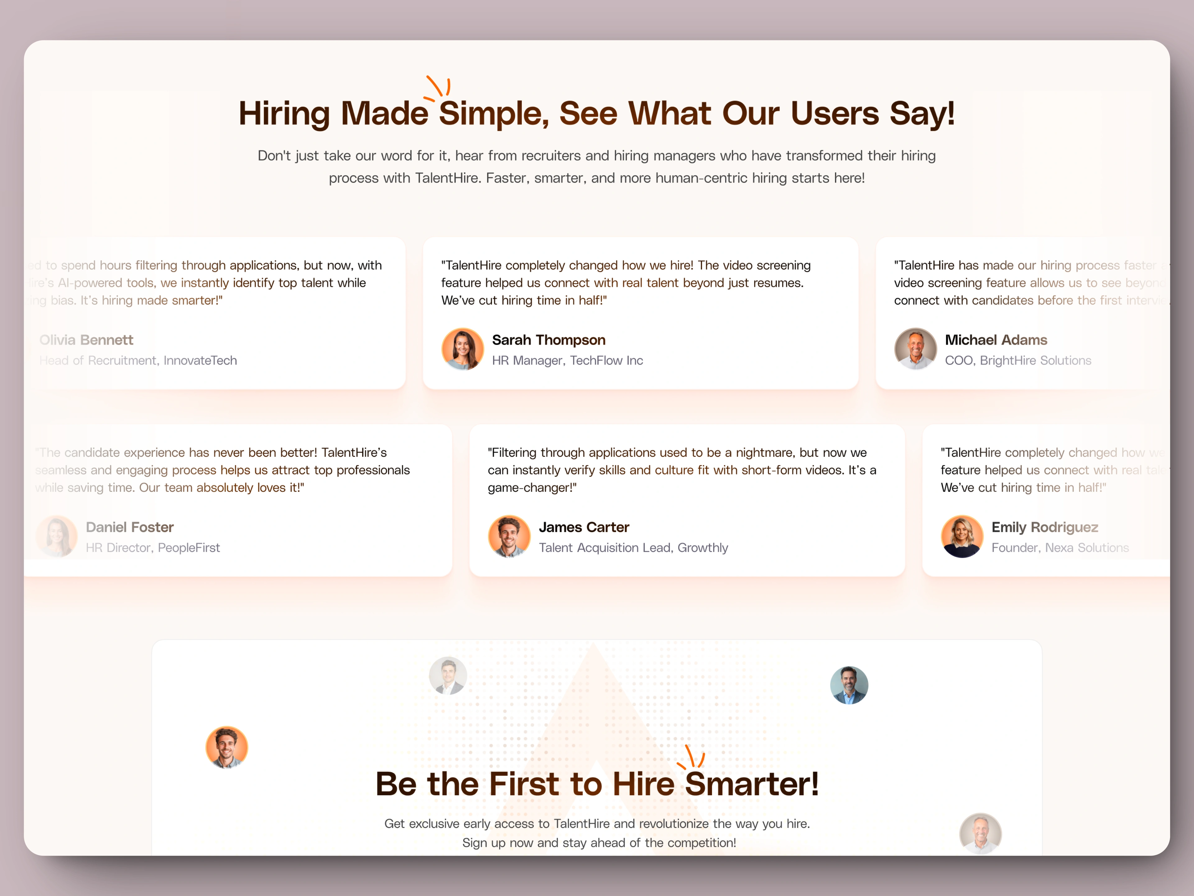 TalentHire is a modern recruitment platform website built in Framer, designed to simplify the process of finding, nurturing, and retaining top talent for growing companies. The website functions as both a brand showcase and product touchpoint, providing employers with a visually appealing and intuitive platform to streamline their hiring workflows.