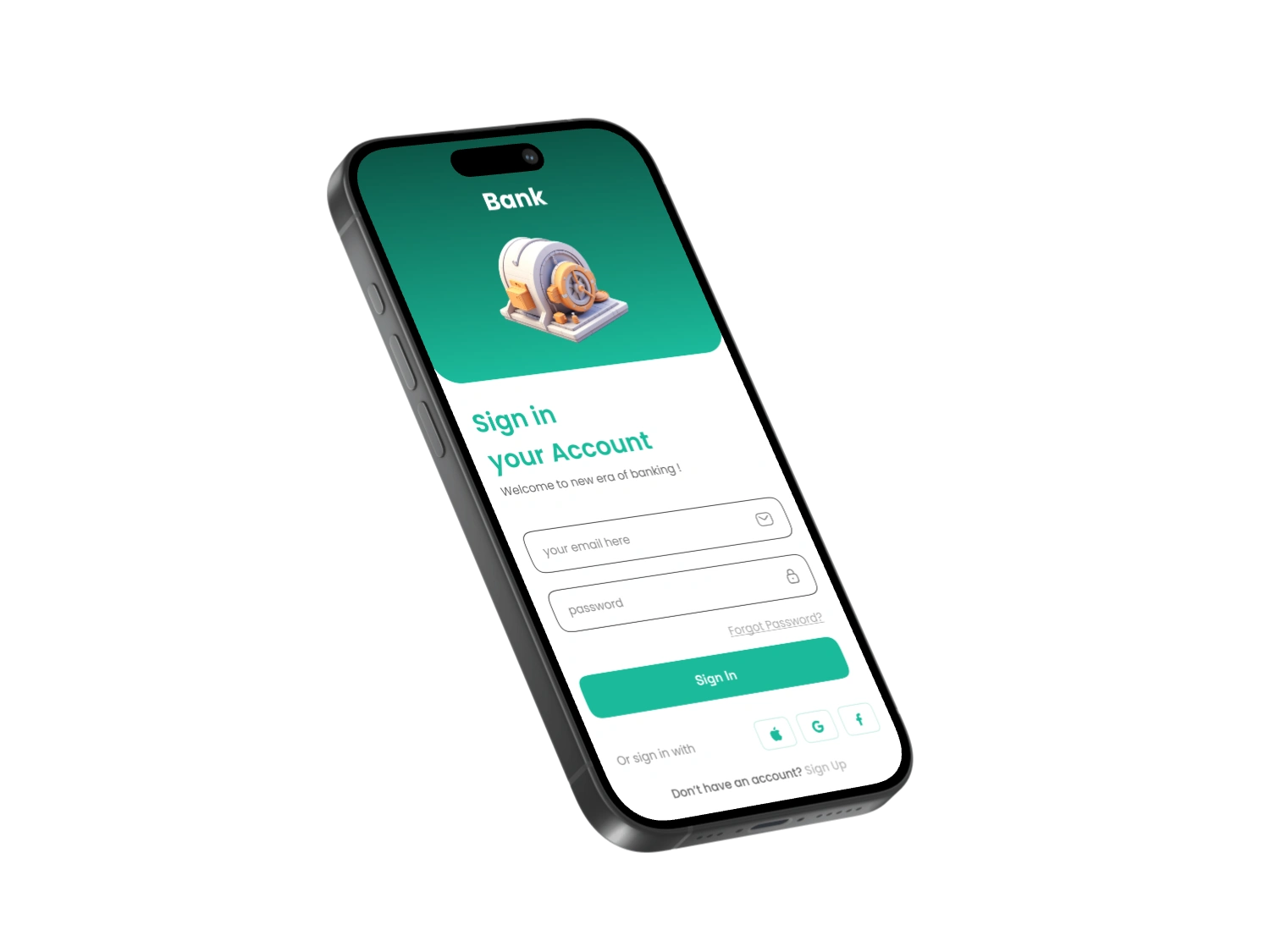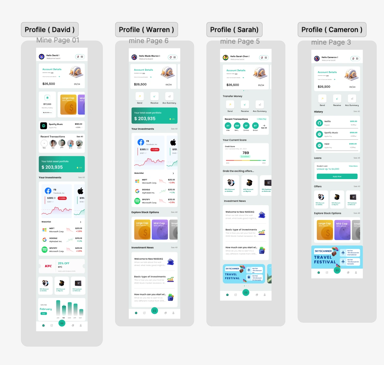 A banking application design featuring user-specific profiles with a comprehensive layout, integrating various financial elements and services.
