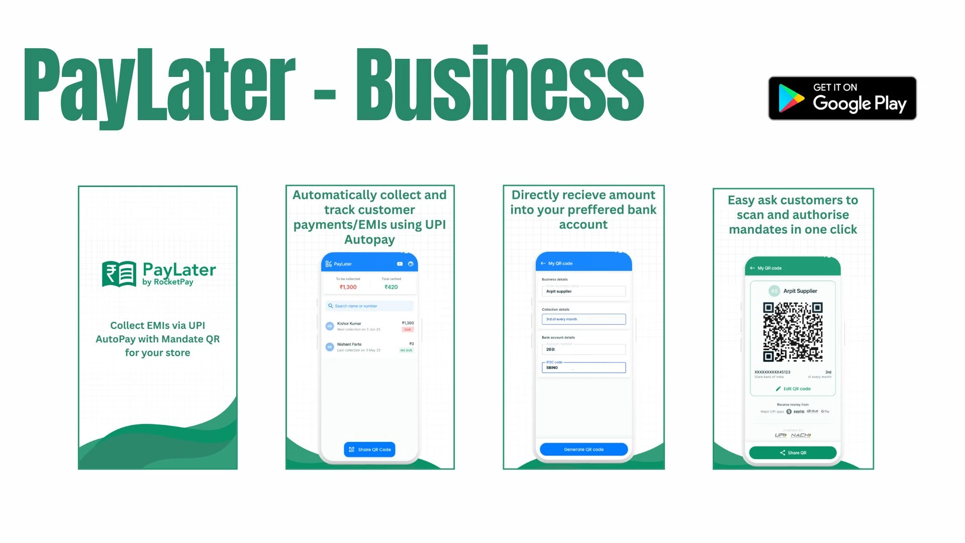 And, The PayLater Business App, offers flexible payment options to customers by enabling distributors, wholesalers, retailers, NBFC agents, and other businesses to accept UPI AutoPay based recurring payments directly into their bank accounts β without follow-ups or delays. Be it one time or daily, weekly or monthly installments, one QR code for every kind of payment.