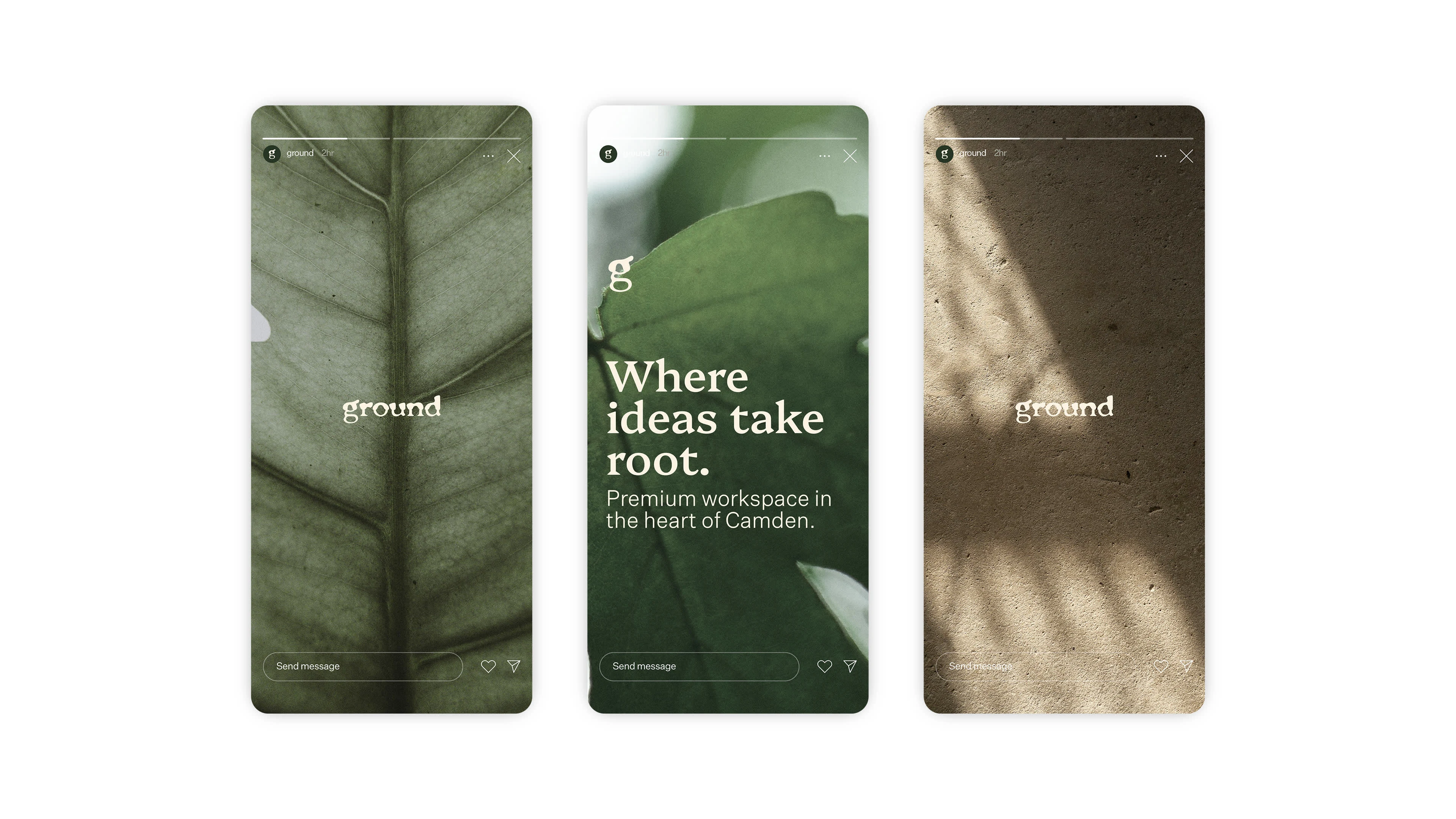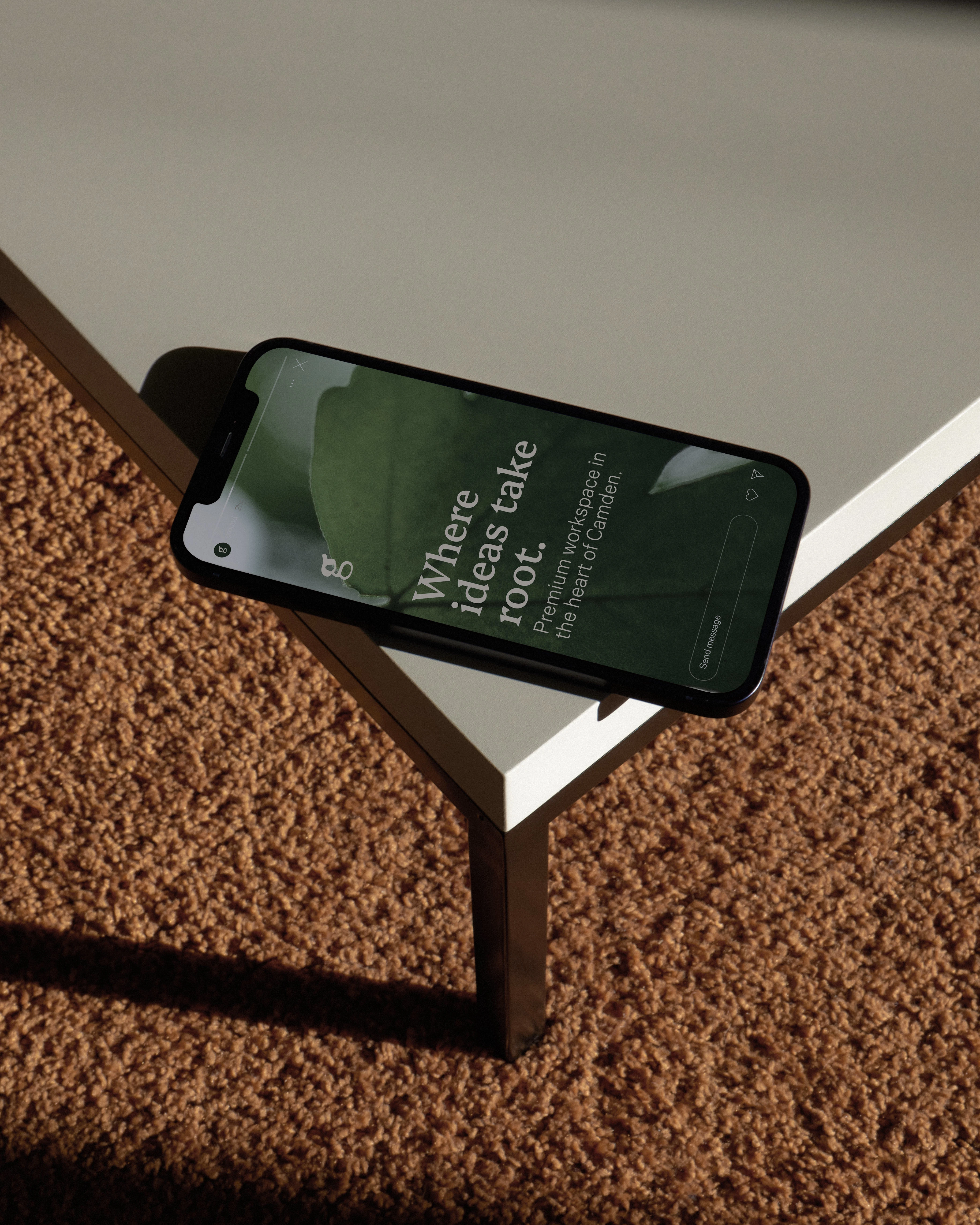 The building features a rare landscaped garden with a mature apple tree. Rather than using obvious visual references to trees or apples, the concept focused on the idea of touching ground, stepping away from screens, and allowing ideas time to take root. Visual inspiration came from the close-up architecture of plants, such as leaves and roots, paired with a celebration of the building’s own architectural details.